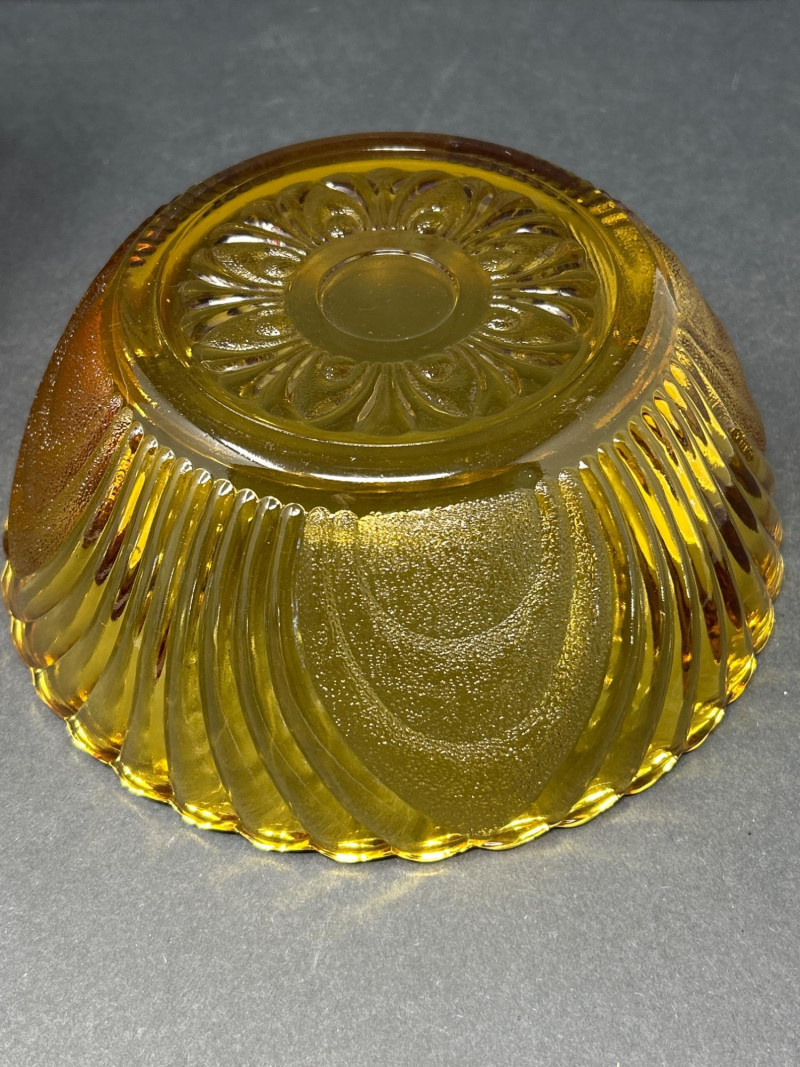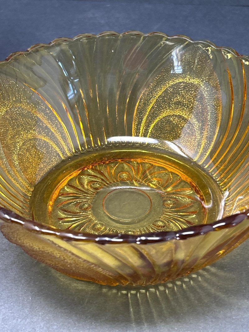 A warm and nostalgic trio of mid-century American glassware, featuring two Pyrex casseroles in the beloved Autumn Harvest Wheat pattern and a richly toned amber serving bowl by Brockway Glass. Included: Pyrex Casseroles (2 pcs) Sizes: 2.5 L and 1.5 L Color/Pattern: Burnt orange with white wheat sheaves Interior: Glossy white Markings: Embossed underside reads “PYREX – FOR OVEN AND MICROWAVE – NO STOVETOP OR BROILER – CORNING USA” Era: Late 1970s–1980s Brockway Glass Bowl (1 pc) Pattern: Nouveau ribbed/floral pressed glass Color: Amber gold Use: Ideal for serving fruit, dips, or side dishes Collecting Note: