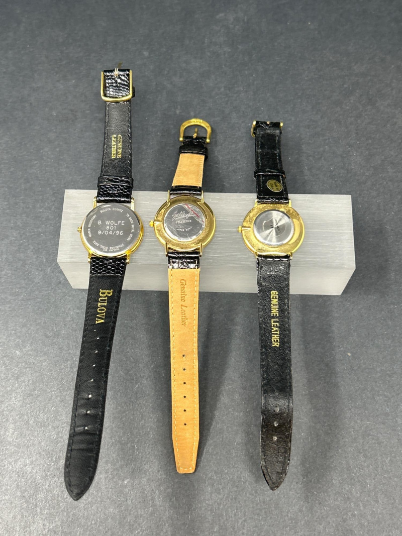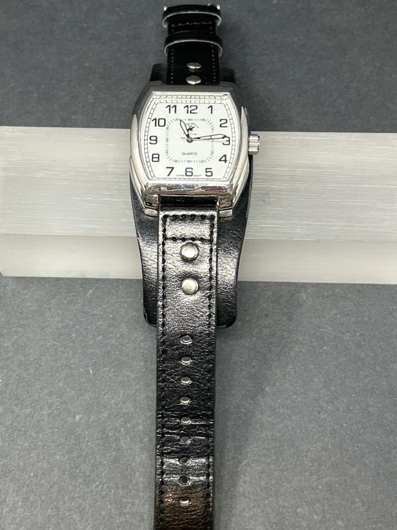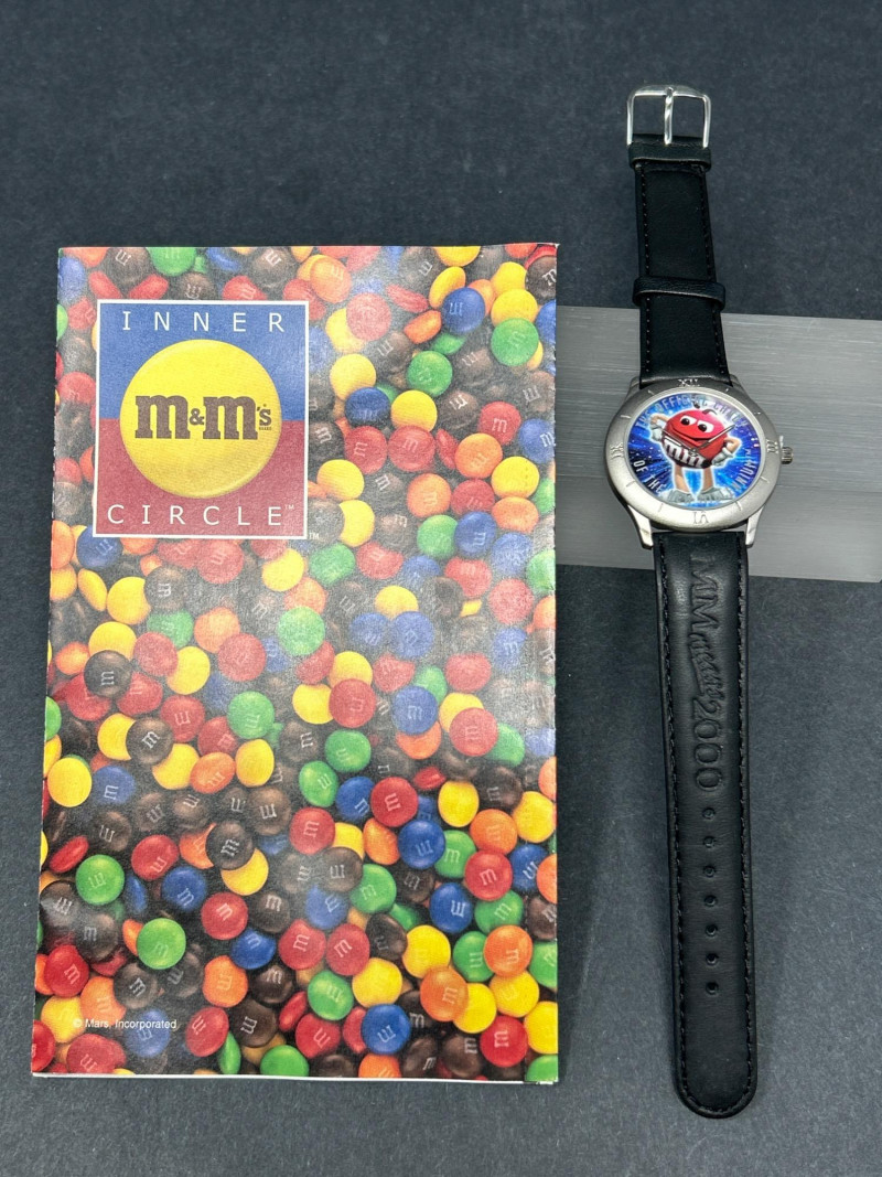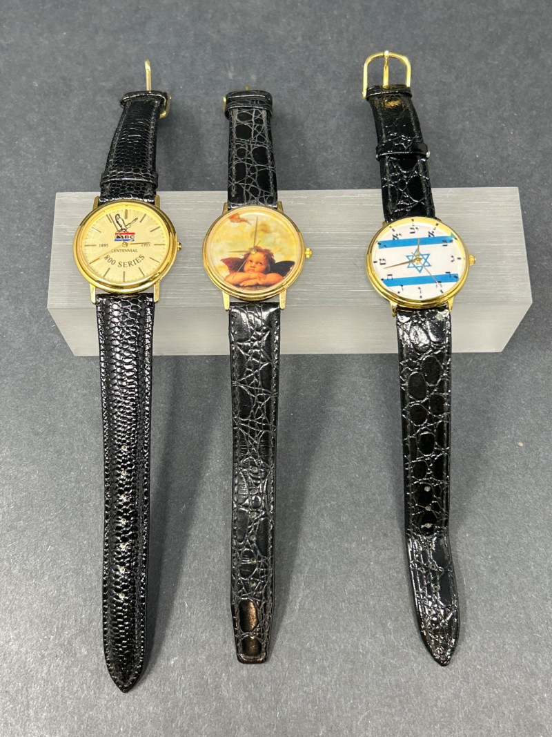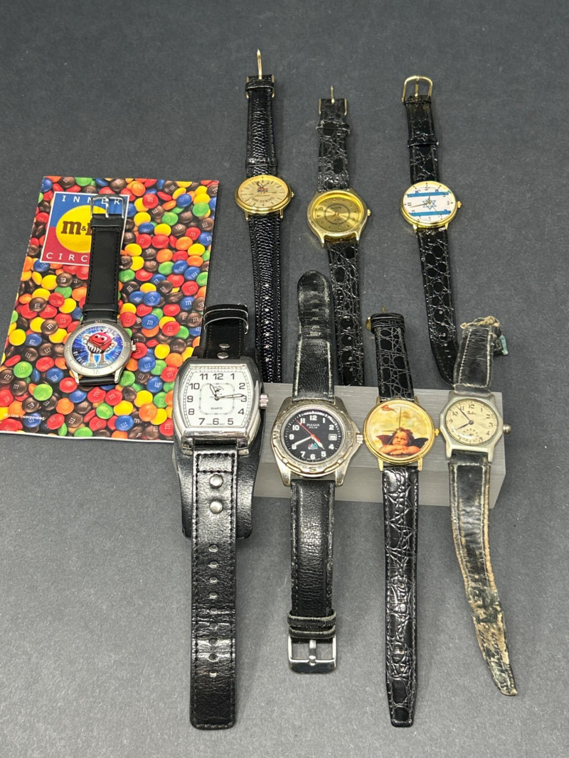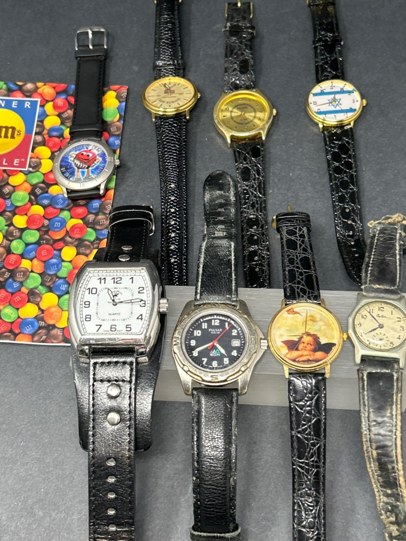 A vibrant mix of eight wristwatches featuring leather or synthetic straps, spanning commemorative, promotional, and dress styles. This lot includes quartz and solar-powered models, each with distinct dial themes and case finishes. Included Watches: Bulova gold-tone quartz wristwatch, engraved “B. Wolfe 801 9/04/96” on case back; black leather strap Pulsar Solar 60M diver-style watch with black dial, compass bezel, and date window Beverly Hills Polo Club quartz watch, oversized rectangular case with bold numeral dial Infinity Quartz gold-tone dress watch with classic styling ABC Centennial 800 Series commemorative watch (1895–1995) with historical motif Angel/Cherub-themed gold-tone dress watch featuring classical artwork dial Star of David novelty watch with musical notes and cultural symbolism M&M’s Inner Circle promotional watch with red M&M character dial; includes colorful branded backing card Condition Report: