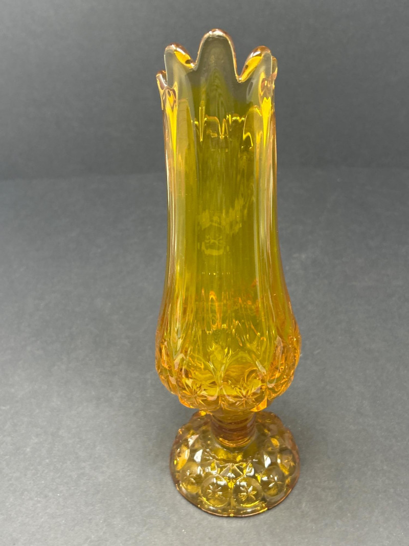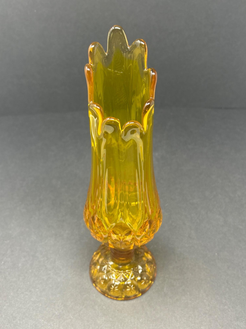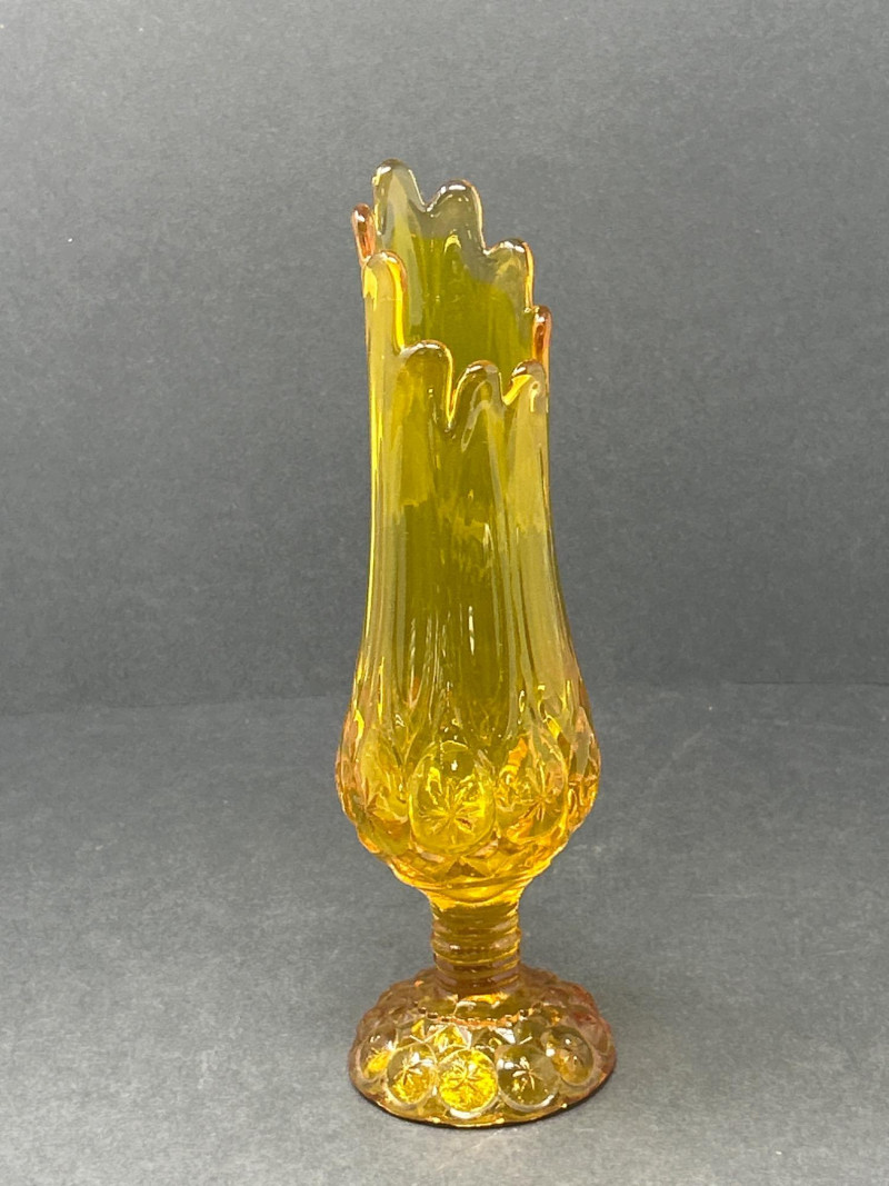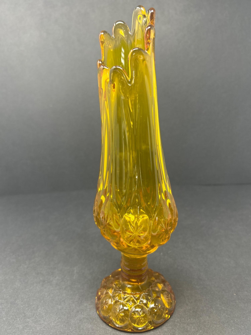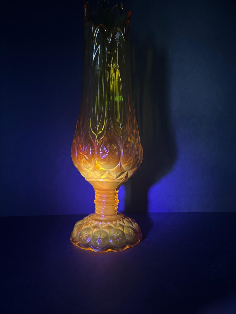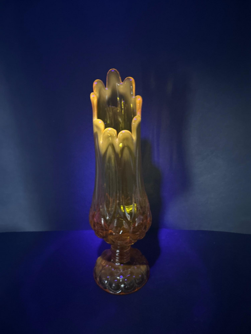 A dazzling mid-century Amberina swung vase standing approximately 12 inches tall, featuring a flared scalloped rim and elongated neck that tapers into a bulbous base. The base is adorned with a pressed starburst motif and raised circular elements, adding texture and visual depth. The glass transitions from golden yellow at the top to rich amber at the base, and glows vividly under UV light—an iconic trait of quality Amberina glass. Dimensions: Approx. 12" H Material: Molded glass, UV-reactive Amberina Coloration: Gradient from yellow to amber Design Features: Swung form, scalloped rim, embossed starburst base Provenance: Estate collection; likely Kanawha Glass Co., West Virginia, 1960s This piece is ideal for collectors of mid-century American glass, swung vases, or UV-reactive decorative art. Its height and vibrant coloration make it a standout centerpiece under natural or blacklight display.
