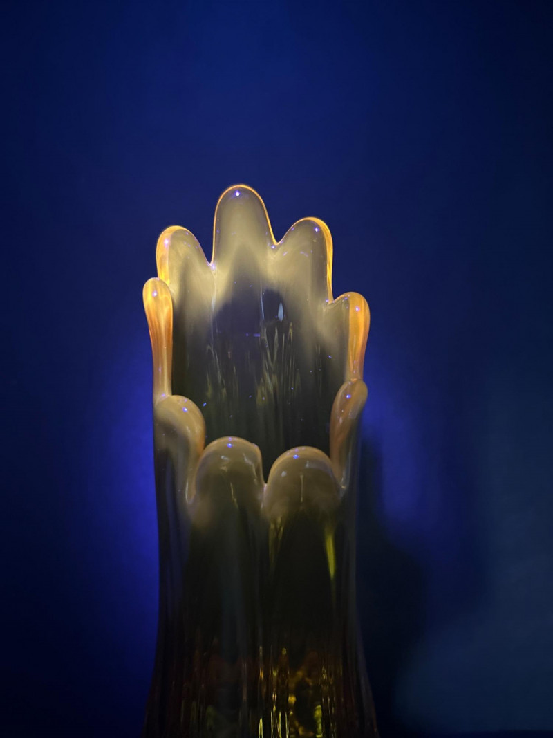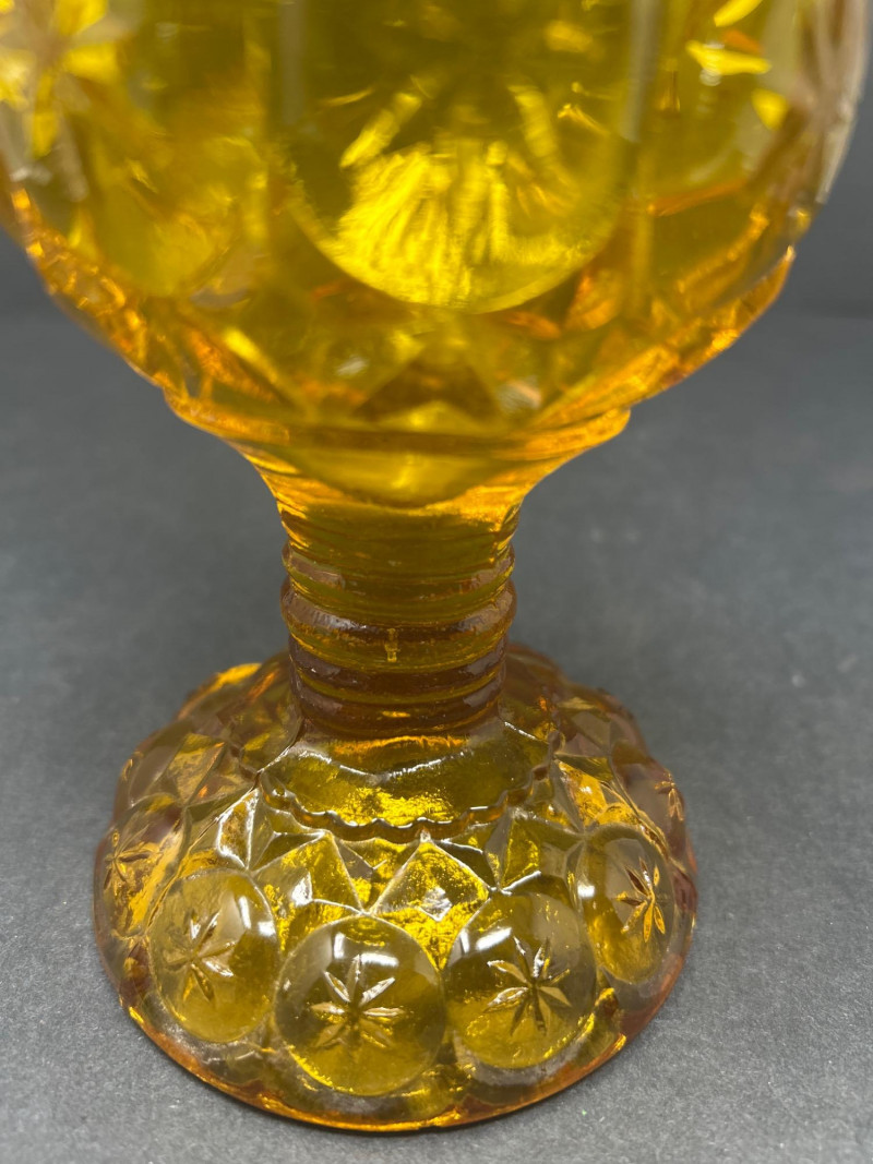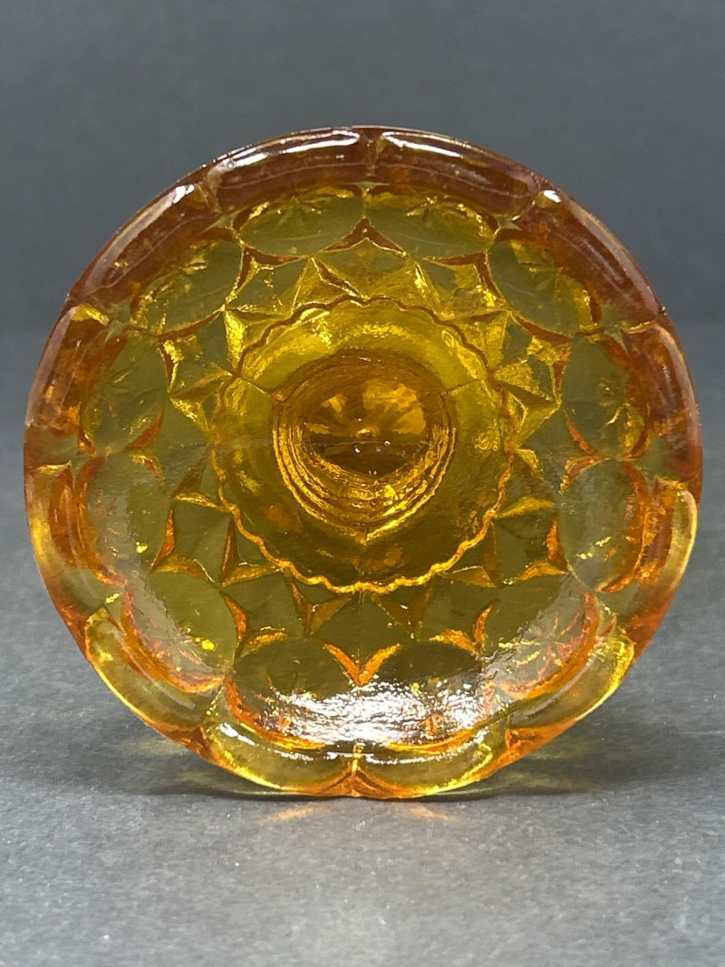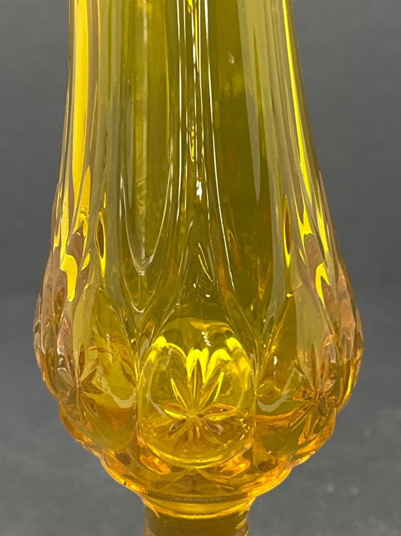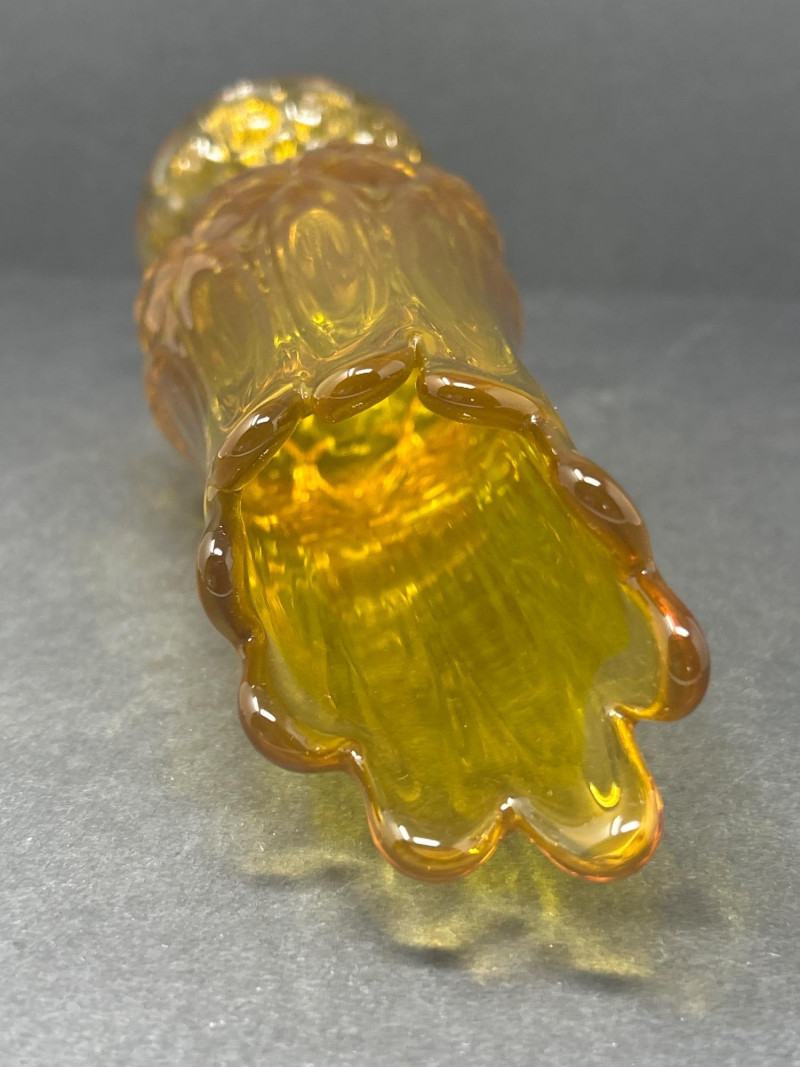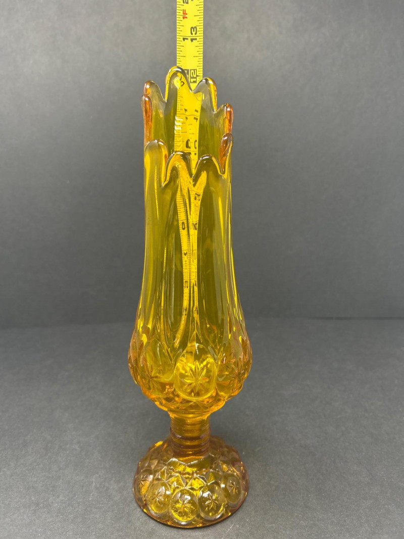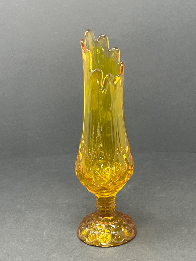 A dazzling mid-century Amberina swung vase standing approximately 12 inches tall, featuring a flared scalloped rim and elongated neck that tapers into a bulbous base. The base is adorned with a pressed starburst motif and raised circular elements, adding texture and visual depth. The glass transitions from golden yellow at the top to rich amber at the base, and glows vividly under UV light—an iconic trait of quality Amberina glass. Dimensions: Approx. 12" H Material: Molded glass, UV-reactive Amberina Coloration: Gradient from yellow to amber Design Features: Swung form, scalloped rim, embossed starburst base Provenance: Estate collection; likely Kanawha Glass Co., West Virginia, 1960s This piece is ideal for collectors of mid-century American glass, swung vases, or UV-reactive decorative art. Its height and vibrant coloration make it a standout centerpiece under natural or blacklight display.