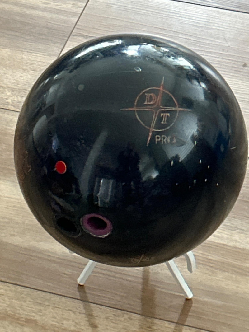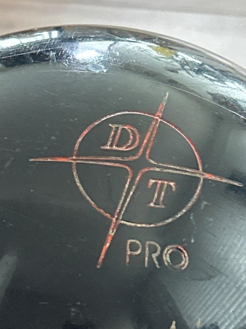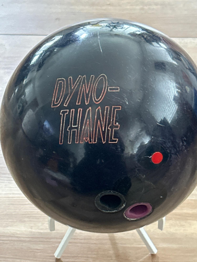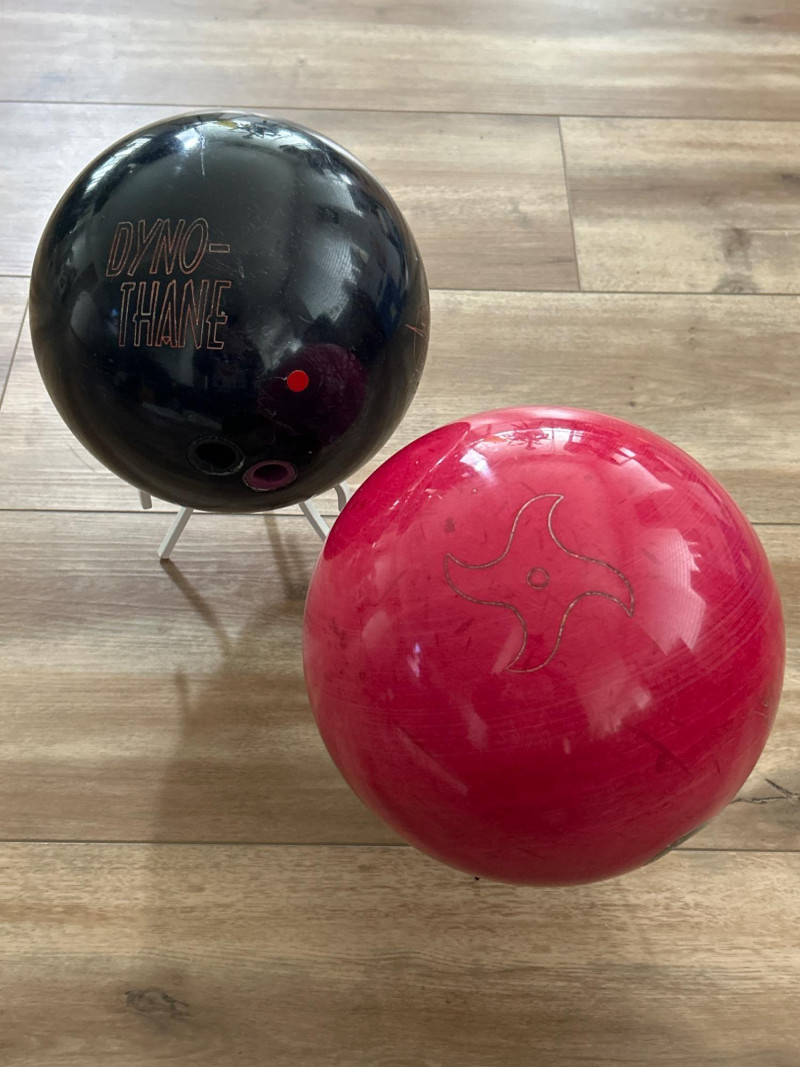 A matched set of two pre-drilled performance bowling balls from Dyno-Thane, a respected manufacturer favored by competitive bowlers in the late 1990s and early 2000s. Both balls feature custom finger drilling and thumb inserts, with surface wear consistent with prior use. Branding: Bold “DYNO-THANE” name on one side; DT Pro crosshair logo on the reverse Coverstock: Reactive resin, engineered for reliable mid-lane read and controllable backend motion Drilling: Three-finger layout with thumb insert Branding: “AMP” name with stylized ninja shuriken/star logo Coverstock: Designed for angular backend reaction and versatility on medium oil lane conditions Drilling: Three-finger layout with thumb insertBlack Ball – Dyno-Thane Vendetta DT Pro