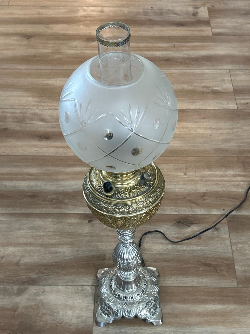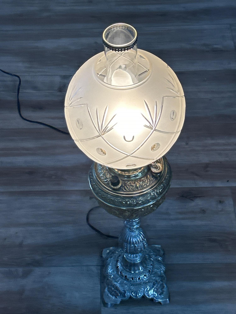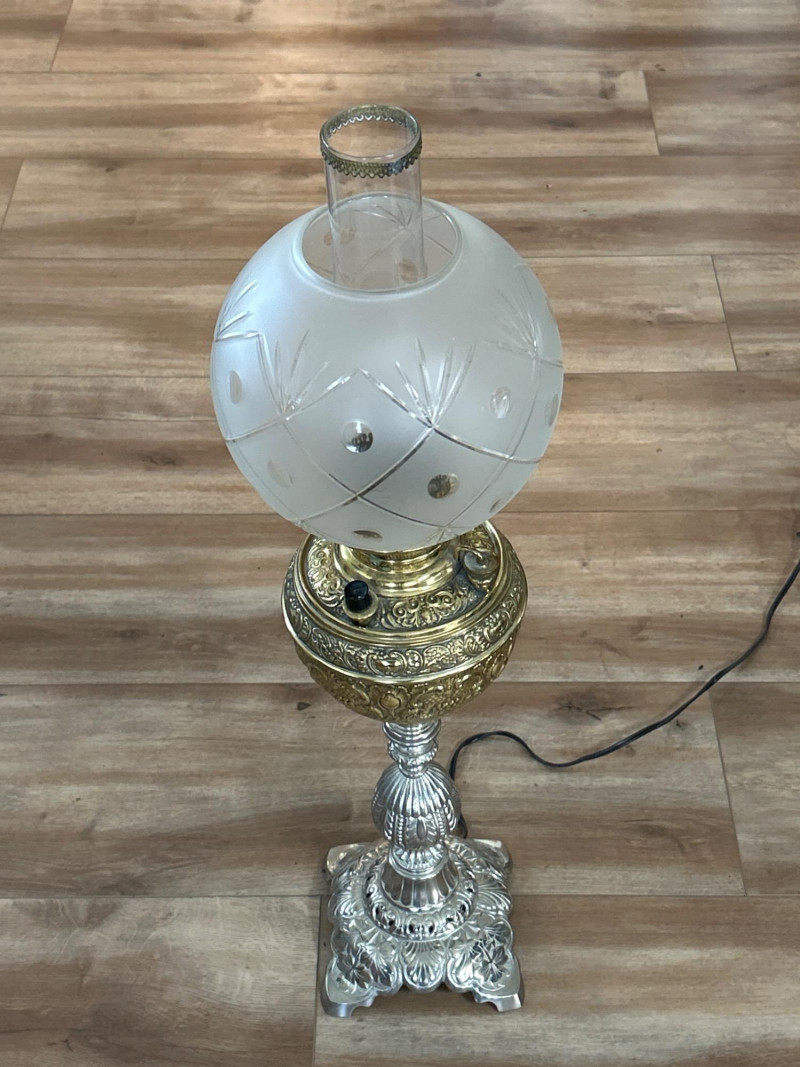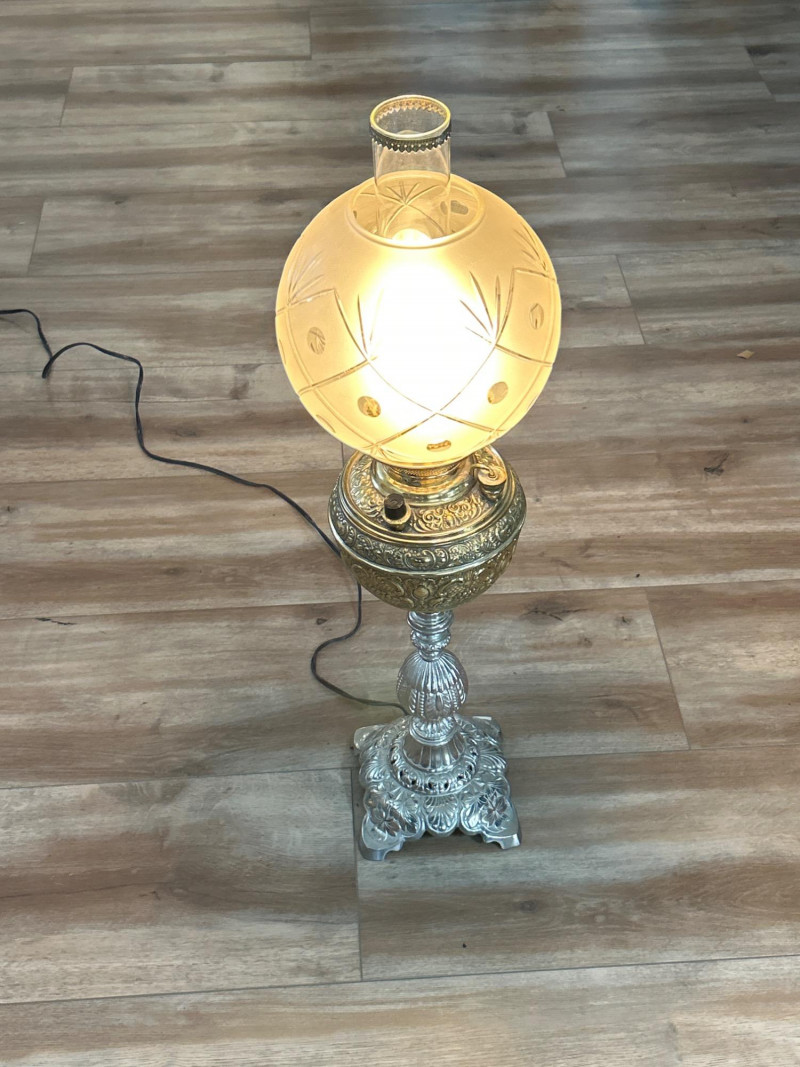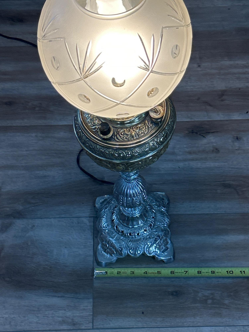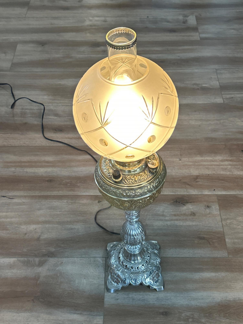 A stately 28-inch electric hurricane-style table lamp in the Victorian Revival tradition, thoughtfully converted for modern use. The sculptural cast-metal base showcases silver and brass tones with ornate floral and foliate reliefs, rising into a gilded midsection with embossed acanthus scrollwork. The central reservoir is topped by a frosted glass globe etched with a graceful leaf-and-dot motif, punctuated by clear roundels for light diffusion. A clear glass chimney completes the silhouette, casting a warm ambient glow when lit. This lamp evokes the romance of 19th-century parlor lighting while offering contemporary convenience—an elegant accent for period interiors or collectors of vintage lighting. Style: Victorian Revival Materials: Cast metal (silver/brass tones); frosted etched glass globe; clear glass chimney Dimensions: Height – 28 inches; Base – approx. 6" square Condition: Excellent working order