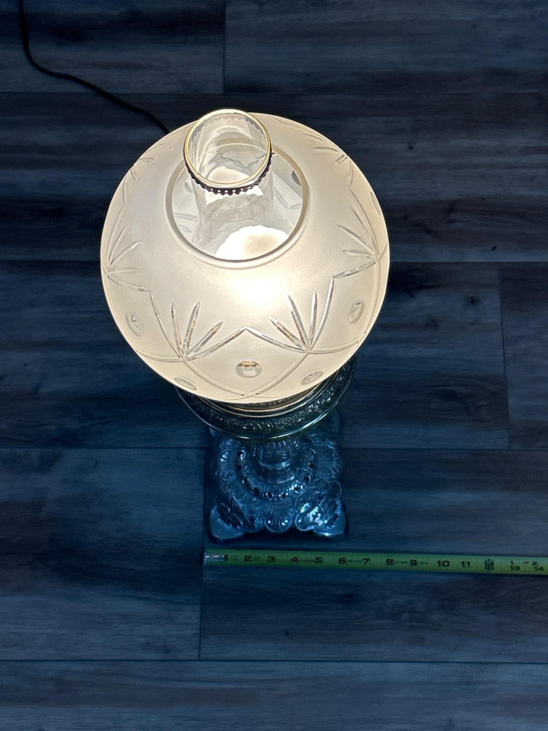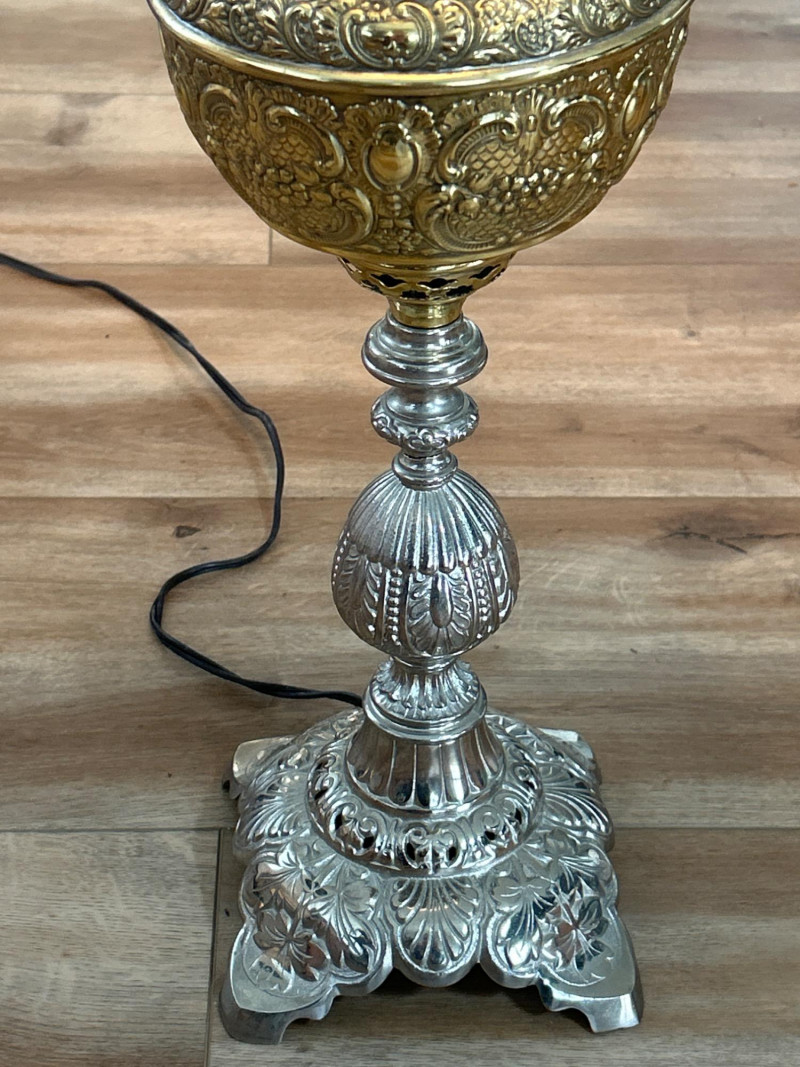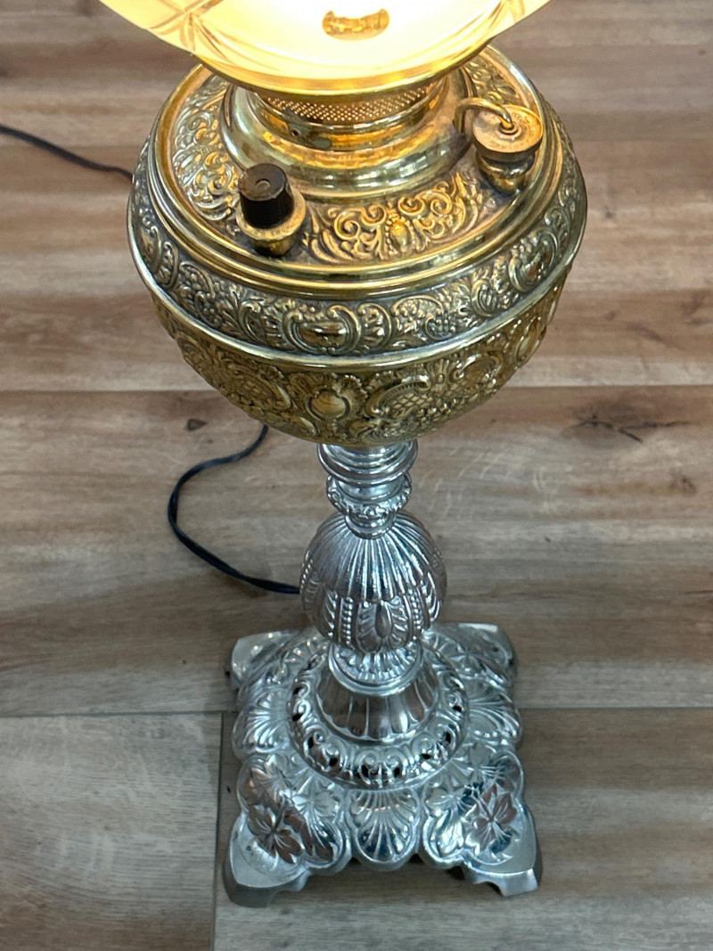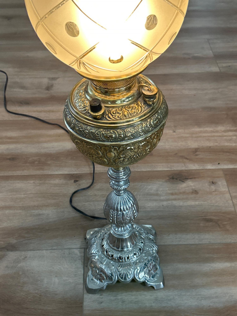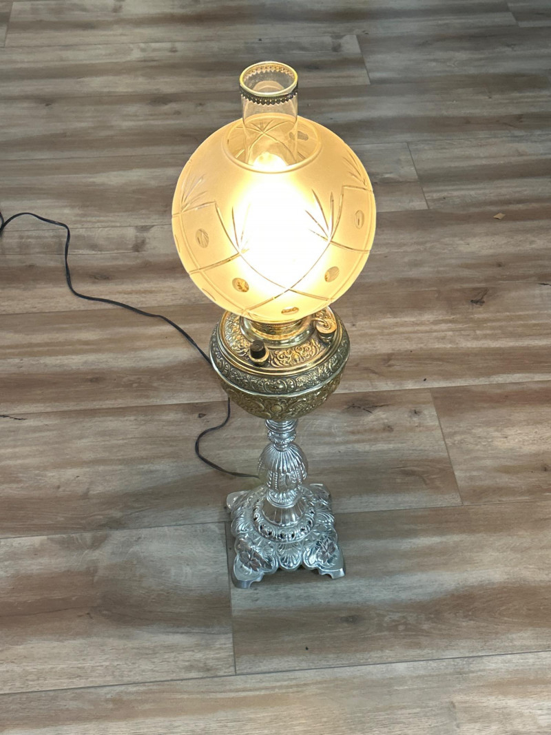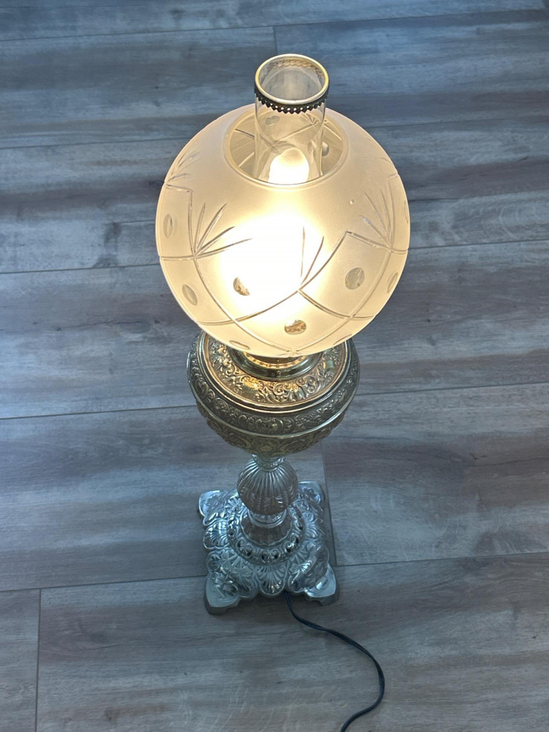 A stately 28-inch electric hurricane-style table lamp in the Victorian Revival tradition, thoughtfully converted for modern use. The sculptural cast-metal base showcases silver and brass tones with ornate floral and foliate reliefs, rising into a gilded midsection with embossed acanthus scrollwork. The central reservoir is topped by a frosted glass globe etched with a graceful leaf-and-dot motif, punctuated by clear roundels for light diffusion. A clear glass chimney completes the silhouette, casting a warm ambient glow when lit. This lamp evokes the romance of 19th-century parlor lighting while offering contemporary convenience—an elegant accent for period interiors or collectors of vintage lighting. Style: Victorian Revival Materials: Cast metal (silver/brass tones); frosted etched glass globe; clear glass chimney Dimensions: Height – 28 inches; Base – approx. 6" square Condition: Excellent working order