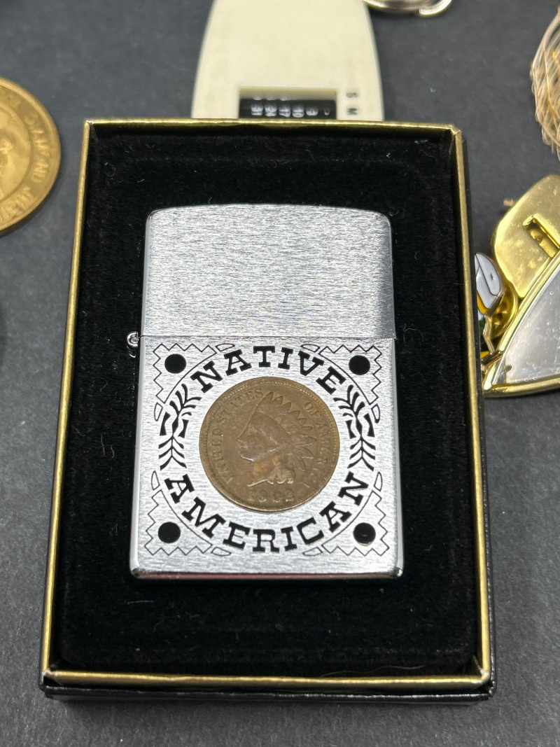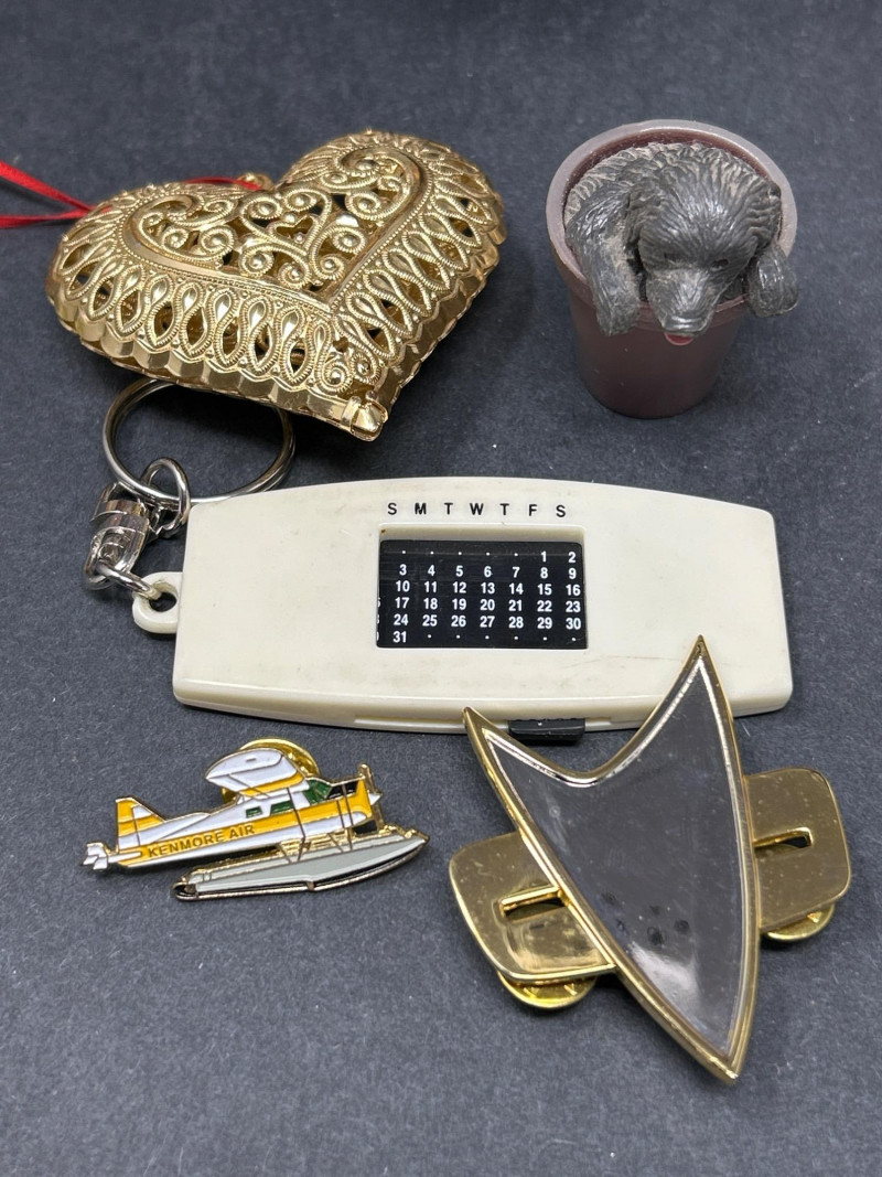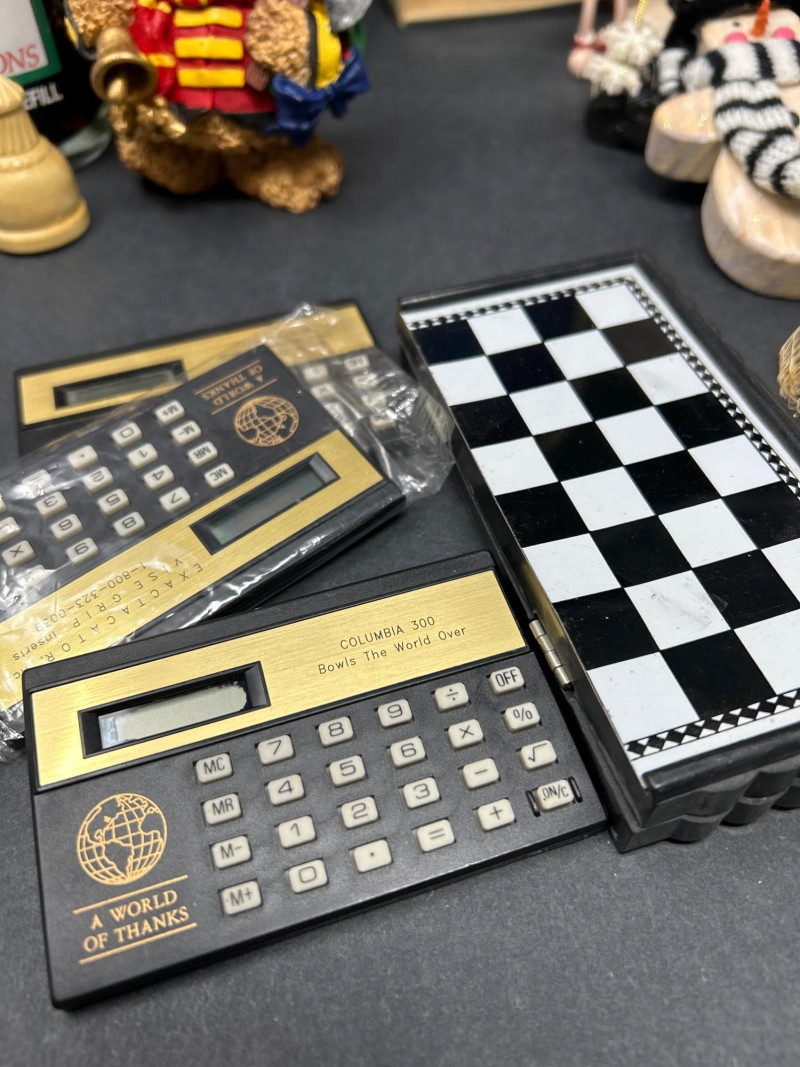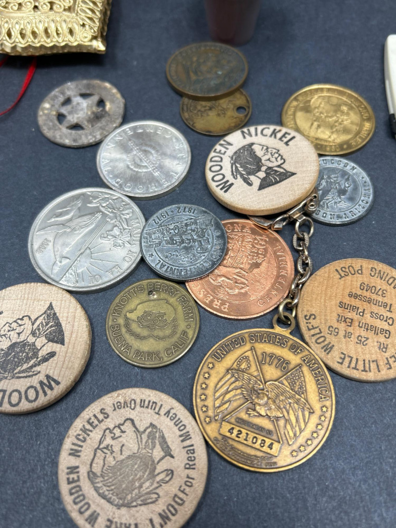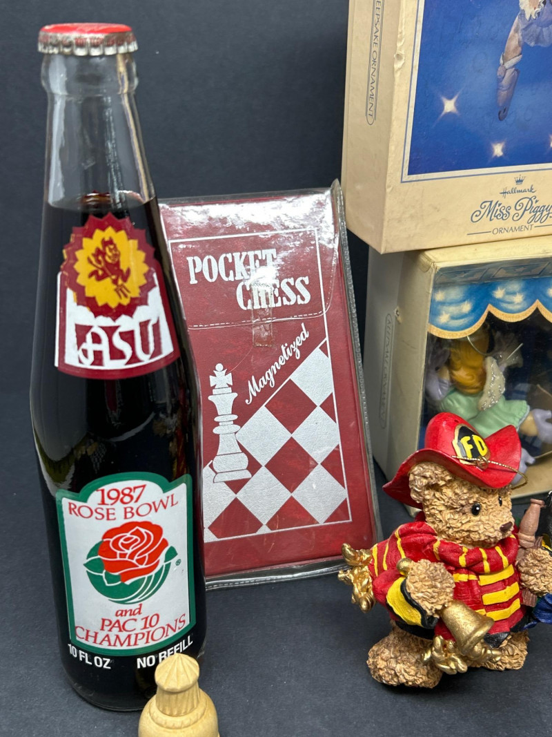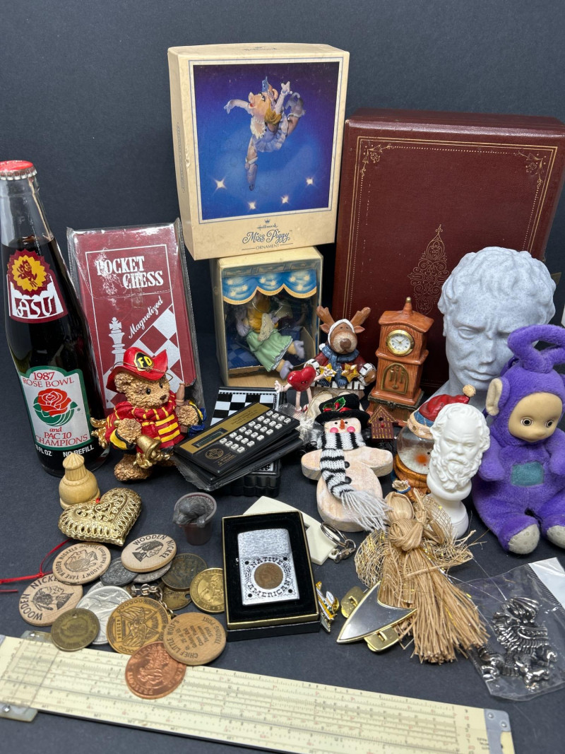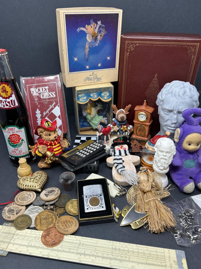A delightfully eclectic mix of vintage and collectible treasures—perfect for resellers, nostalgic collectors, or creative repurposes. This curated lot includes: Vintage souvenir and commemorative pieces Wooden nickels, bronze Bicentennial medallion Amusement park tokens (incl. Knott’s Berry Farm) Novelty “Good for One Fare” transit token and others Flip-top lighter with Native American motif Inset Indian Head cent detail Assorted Christmas décor: snowmen, reindeer, Santa snow globe Small bear firefighter figurine Teletubby plush character Vintage “Pocket Chess” magnetized travel set Retro slide rule, perpetual calendar keychain Kenmore Air enamel pin, heart-shaped filigree ornament Miniature dog-in-pot novelty Boxed Hallmark “Miss Piggy” ballerina ornament Additional boxed angel ornament Red velvet-lined jewelry/keepsake box Porcelain trinket box with hinged lid Brass decorative clips 1987 ASU Rose Bowl & PAC-10 Champions commemorative soda bottle 10 fl. oz., sealed (for display only; contents not for consumption) Mini desk clock, vintage electronic calculator Tassel keychains, novelty brass accentsTokens & Coins