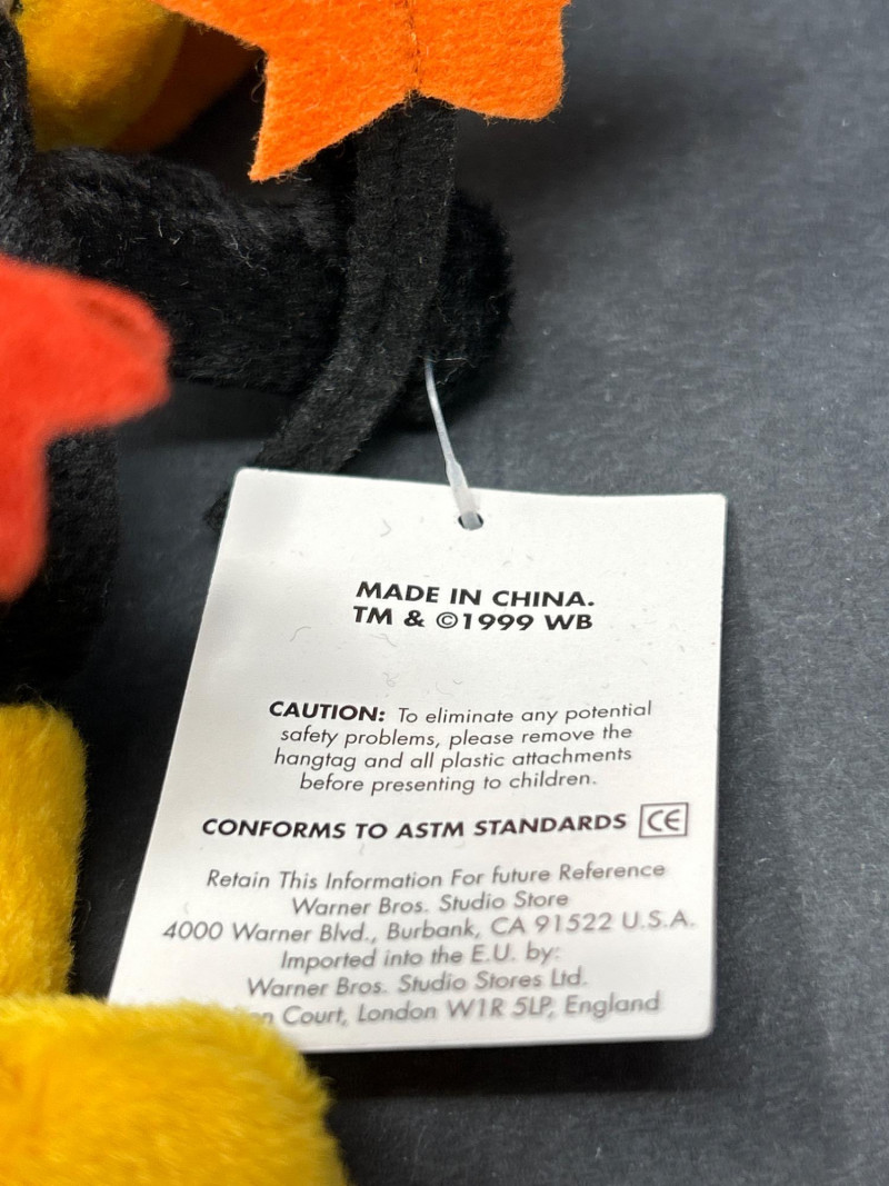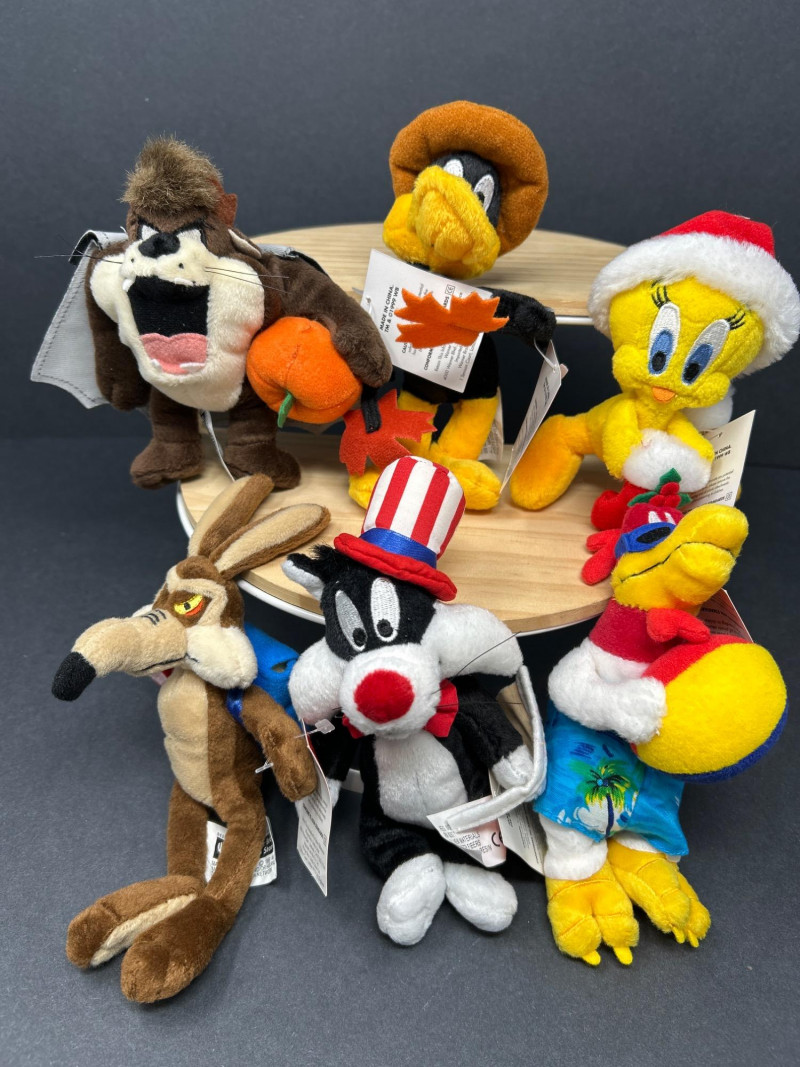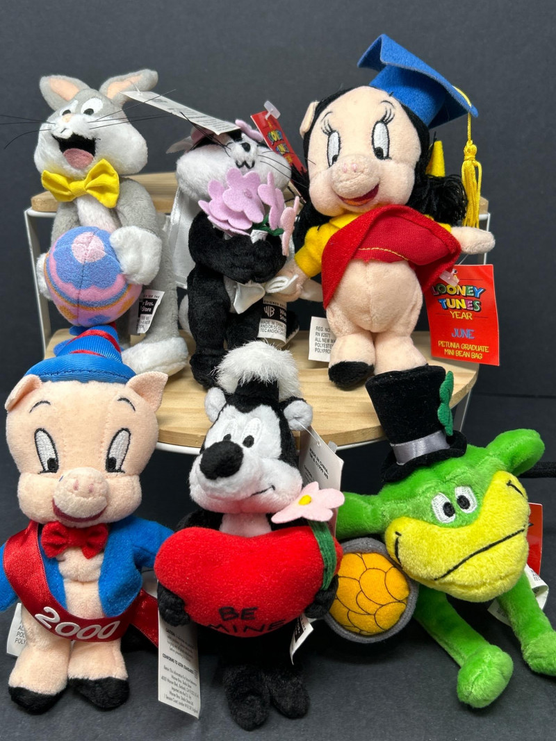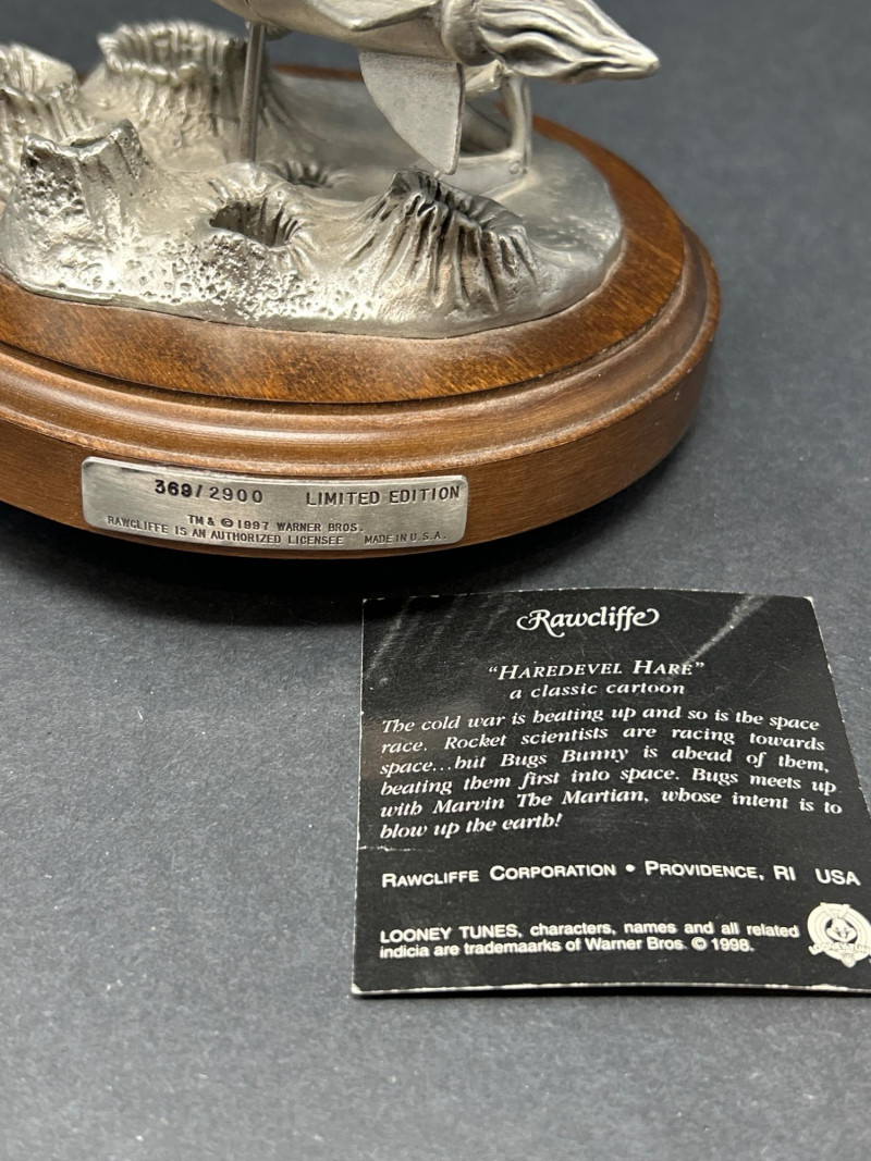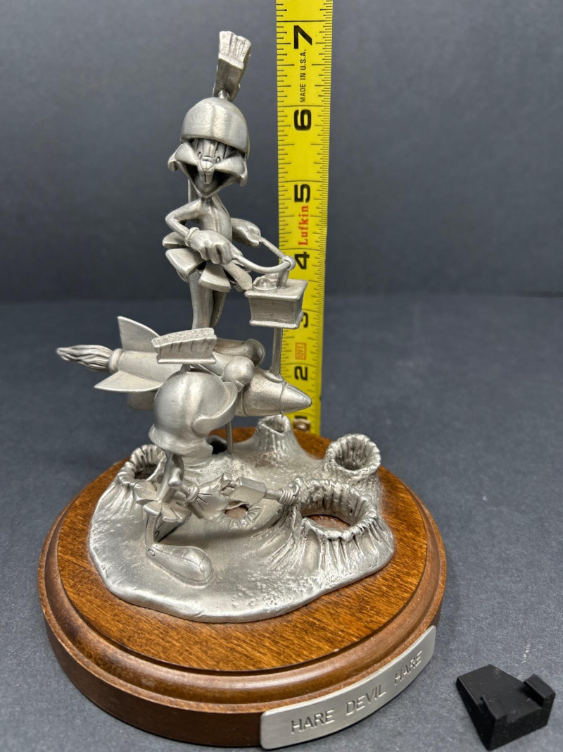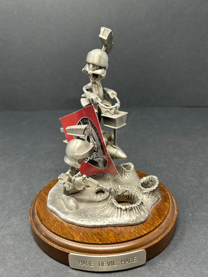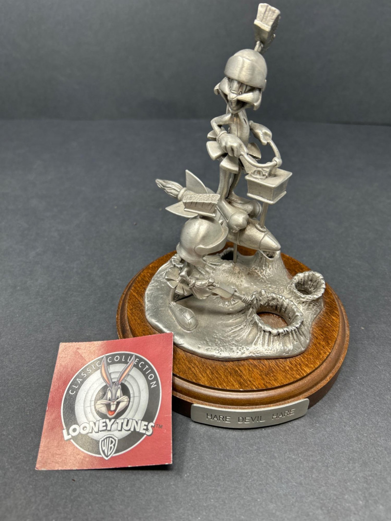 A vibrant Warner Bros. collectible bundle featuring: Mini Bean Bag Plush Toys (c. 1999): Includes Bugs Bunny, Tweety, Sylvester, Daffy Duck, Taz, Porky Pig (Millennium 2000 sash), Pepe Le Pew, Yosemite Sam, Wile E. Coyote, and others. Most retain original hangtags. Rawcliffe Pewter Sculpture – “Hare Devil Hare” (1997): Limited edition (#369/2900), depicting Bugs Bunny and Marvin the Martian atop a rocket on a cratered lunar base. Mounted on a wood display with engraved title plate. Includes original info card. Approx. 7" tall. Why Collectors Love It: Complete and colorful Looney Tunes plush set from the late '90s. Sought-after Rawcliffe pewter art piece with hand-numbered edition. Both items are officially licensed by Warner Bros. — ideal for display, gifting, or nostalgic investment.