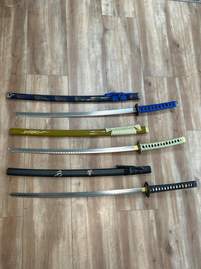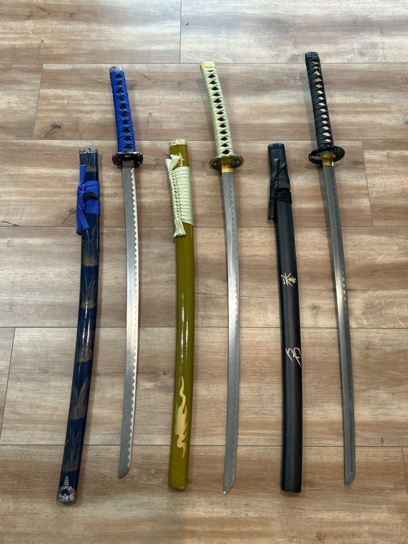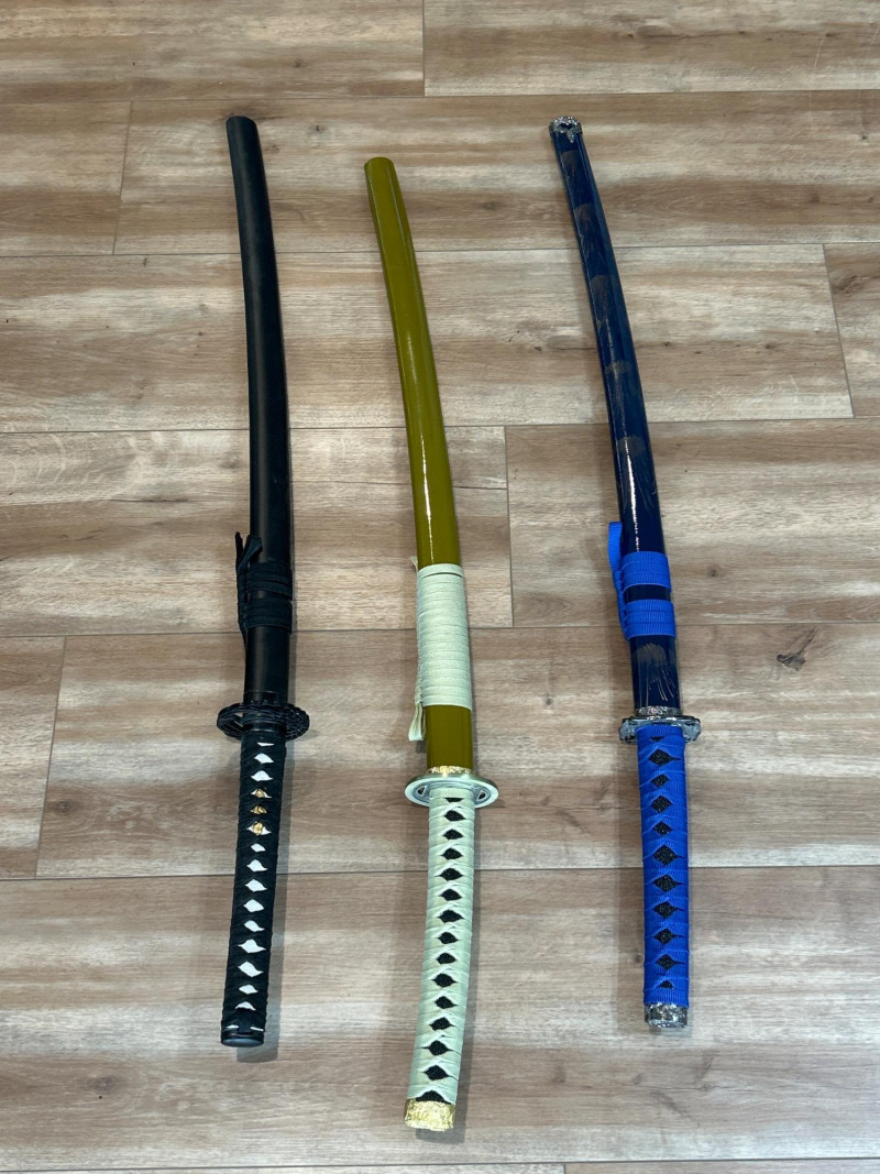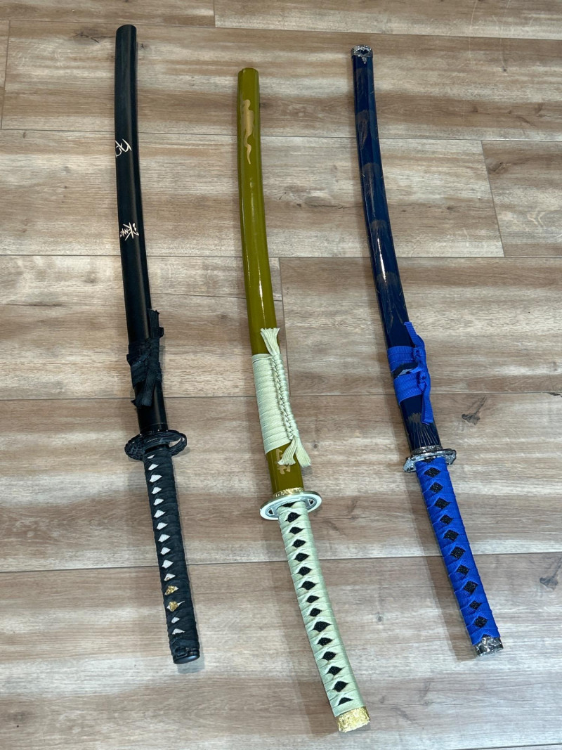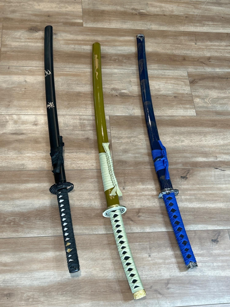 A striking set of three full-length Japanese-style katana swords, each measuring approximately 42 inches in total length. This curated trio showcases distinct aesthetic and craftsmanship features, ideal for collectors, martial arts enthusiasts, or decorative display. Sword 1: Black lacquered scabbard with gold Japanese script. Handle wrapped in black cord with white diamond pattern. Ornate tsuba (guard) with traditional motifs. Sword 2: Olive green scabbard with white cord wrap. Handle features white ray-skin style grip and gold-colored pommel. Simple circular tsuba for a clean, classic look. Sword 3: Deep blue scabbard and matching handle with black diamond wrap. Silver-toned tsuba with intricate detailing. These are decorative replicas, not intended for martial arts training or cutting practice. Ideal for wall mounting, cosplay, or themed interior decor. Buyer must handle with care; adult supervision recommended.Item Details: