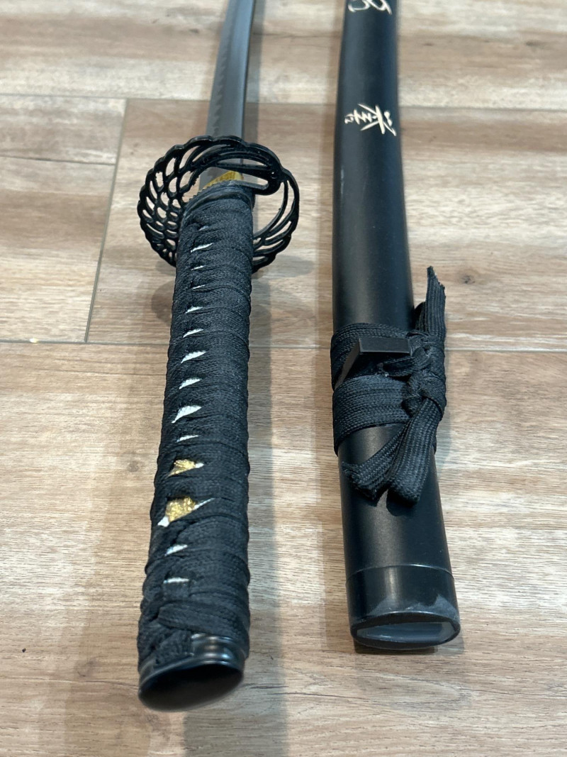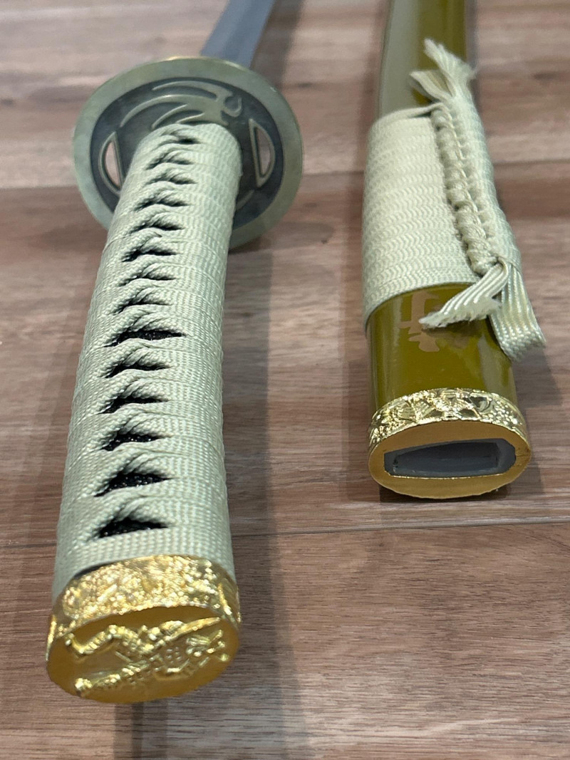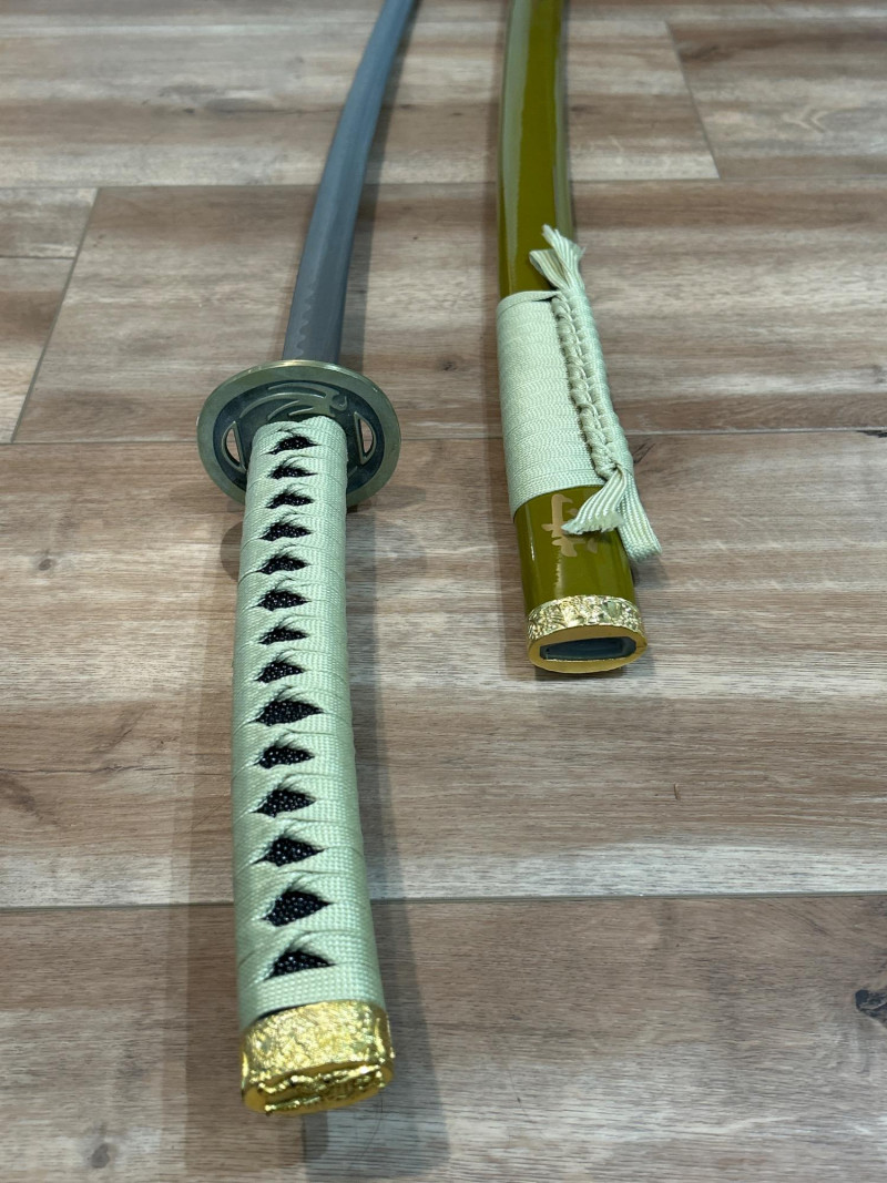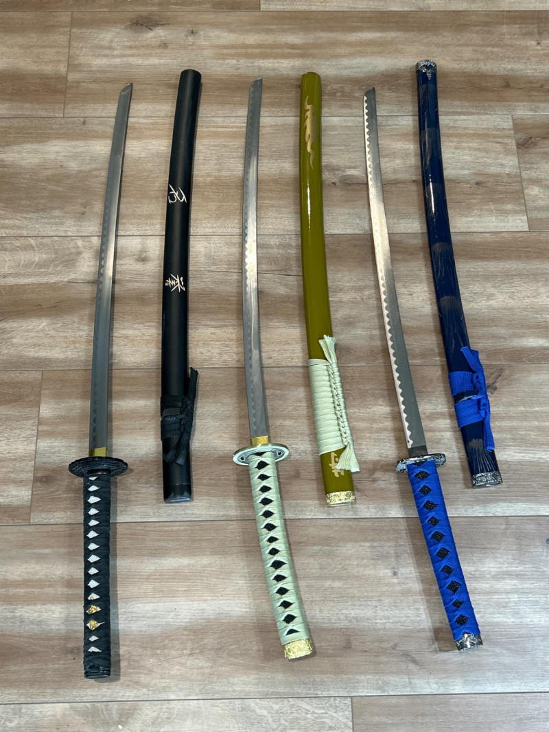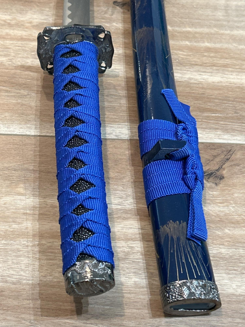 A striking set of three full-length Japanese-style katana swords, each measuring approximately 42 inches in total length. This curated trio showcases distinct aesthetic and craftsmanship features, ideal for collectors, martial arts enthusiasts, or decorative display. Sword 1: Black lacquered scabbard with gold Japanese script. Handle wrapped in black cord with white diamond pattern. Ornate tsuba (guard) with traditional motifs. Sword 2: Olive green scabbard with white cord wrap. Handle features white ray-skin style grip and gold-colored pommel. Simple circular tsuba for a clean, classic look. Sword 3: Deep blue scabbard and matching handle with black diamond wrap. Silver-toned tsuba with intricate detailing. These are decorative replicas, not intended for martial arts training or cutting practice. Ideal for wall mounting, cosplay, or themed interior decor. Buyer must handle with care; adult supervision recommended.Item Details: