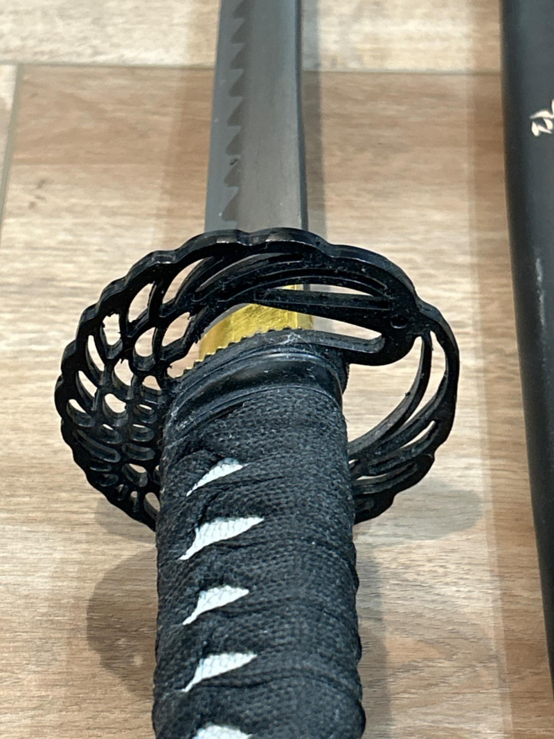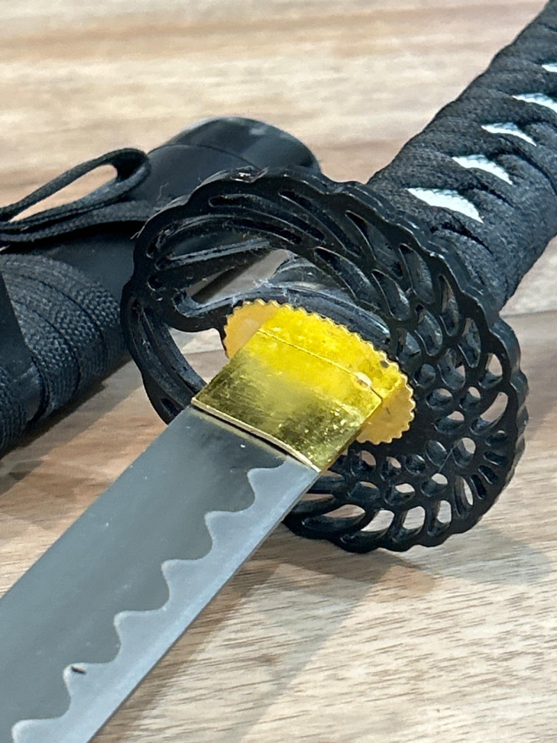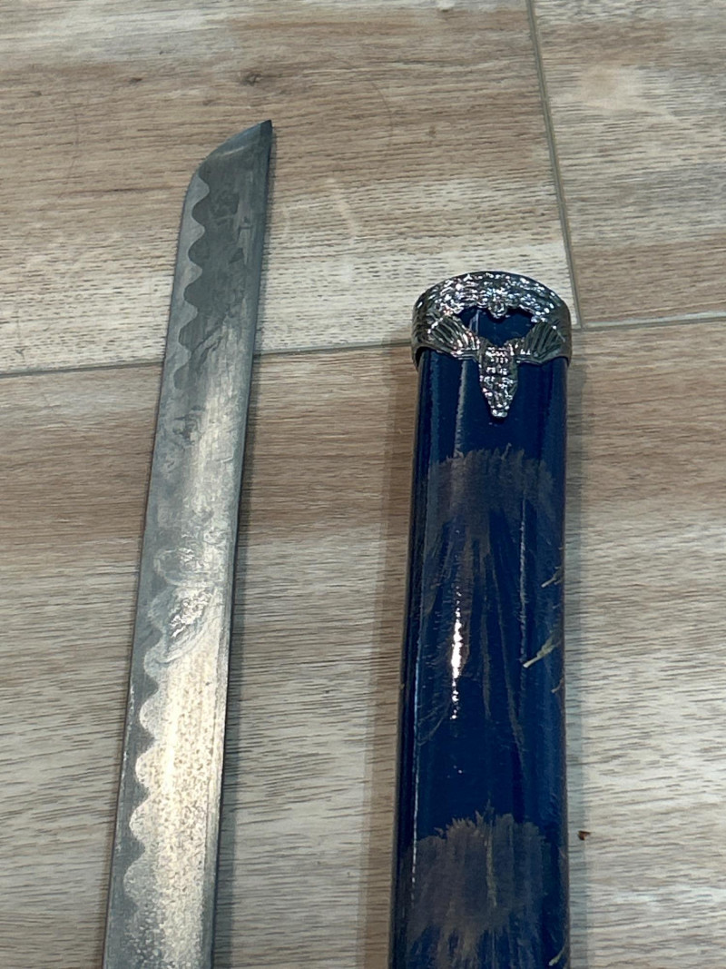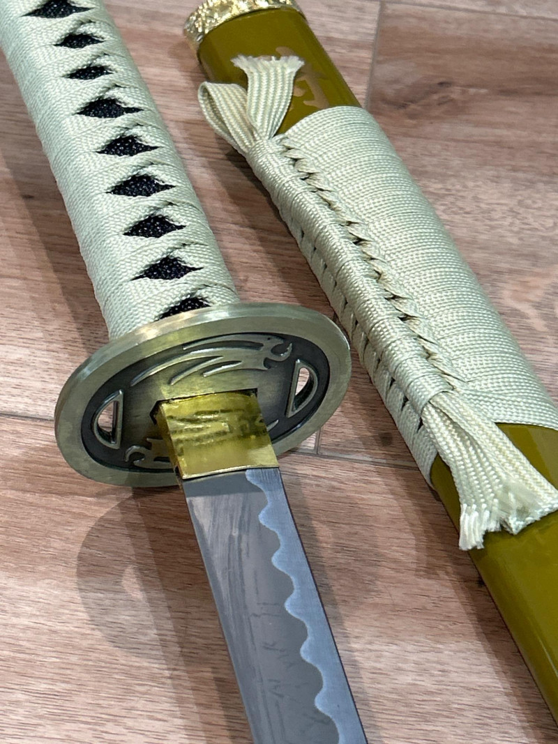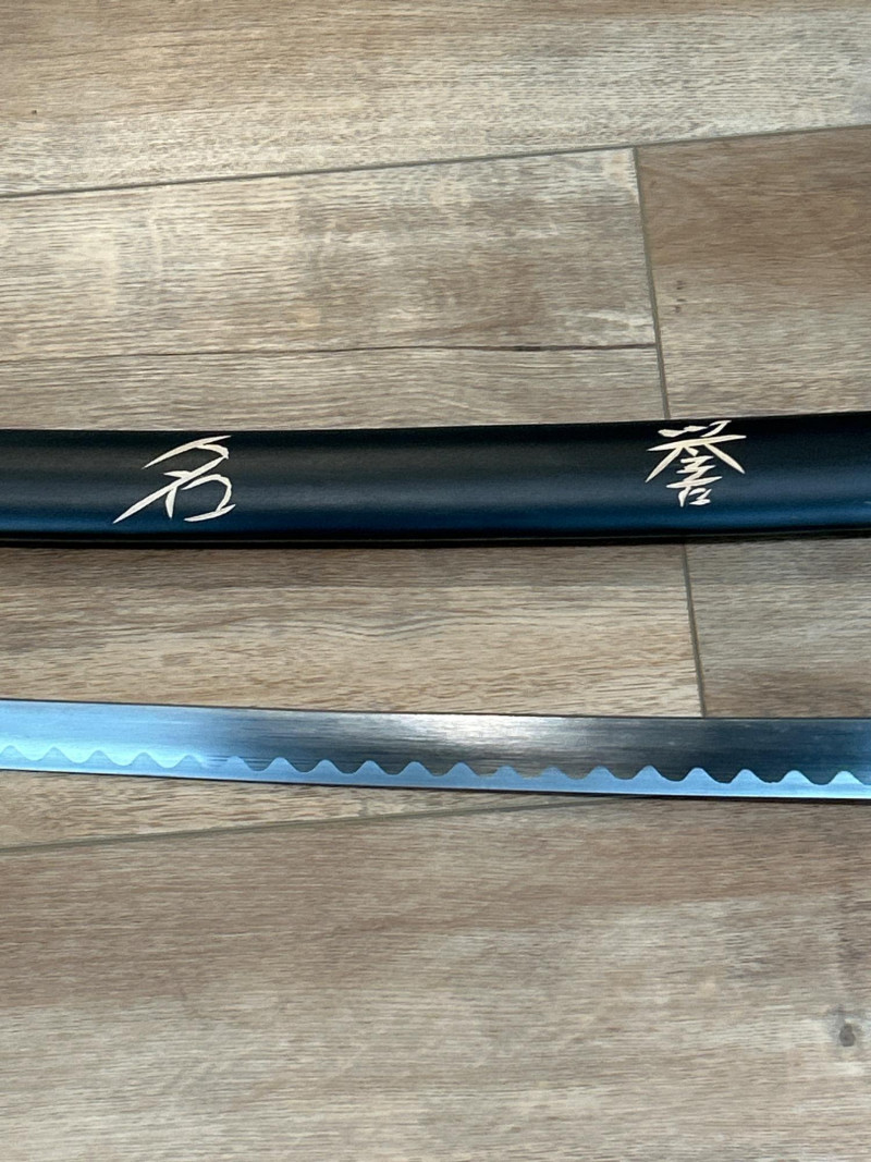 A striking set of three full-length Japanese-style katana swords, each measuring approximately 42 inches in total length. This curated trio showcases distinct aesthetic and craftsmanship features, ideal for collectors, martial arts enthusiasts, or decorative display. Sword 1: Black lacquered scabbard with gold Japanese script. Handle wrapped in black cord with white diamond pattern. Ornate tsuba (guard) with traditional motifs. Sword 2: Olive green scabbard with white cord wrap. Handle features white ray-skin style grip and gold-colored pommel. Simple circular tsuba for a clean, classic look. Sword 3: Deep blue scabbard and matching handle with black diamond wrap. Silver-toned tsuba with intricate detailing. These are decorative replicas, not intended for martial arts training or cutting practice. Ideal for wall mounting, cosplay, or themed interior decor. Buyer must handle with care; adult supervision recommended.Item Details:
