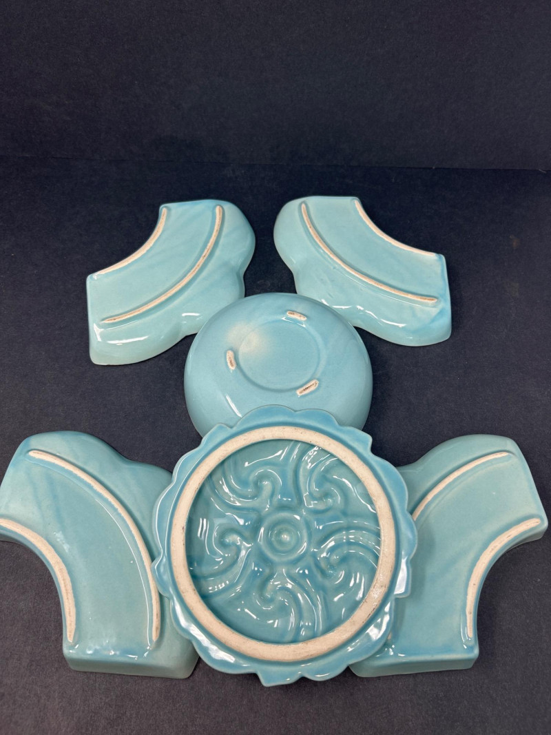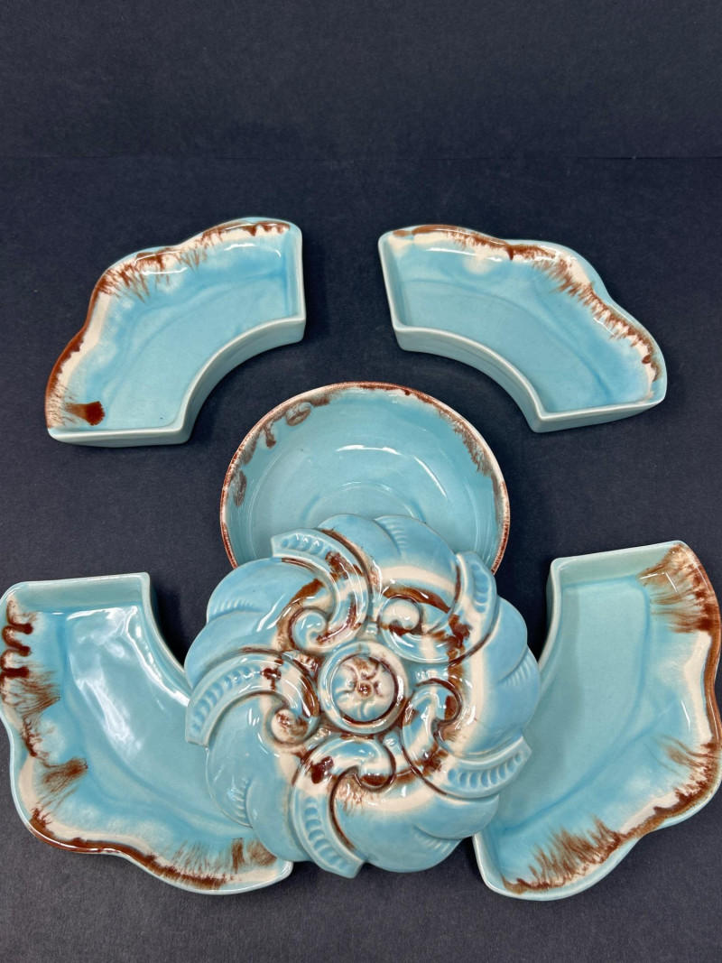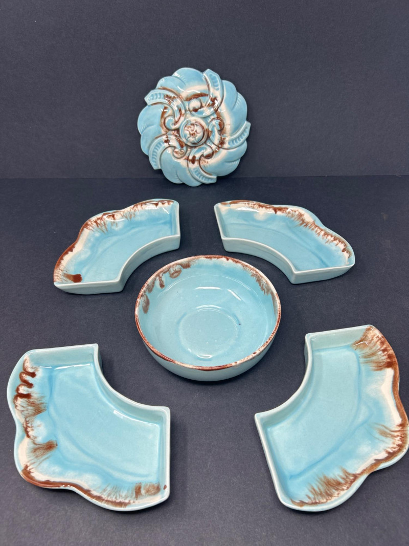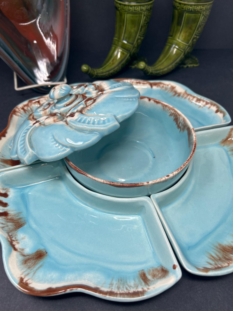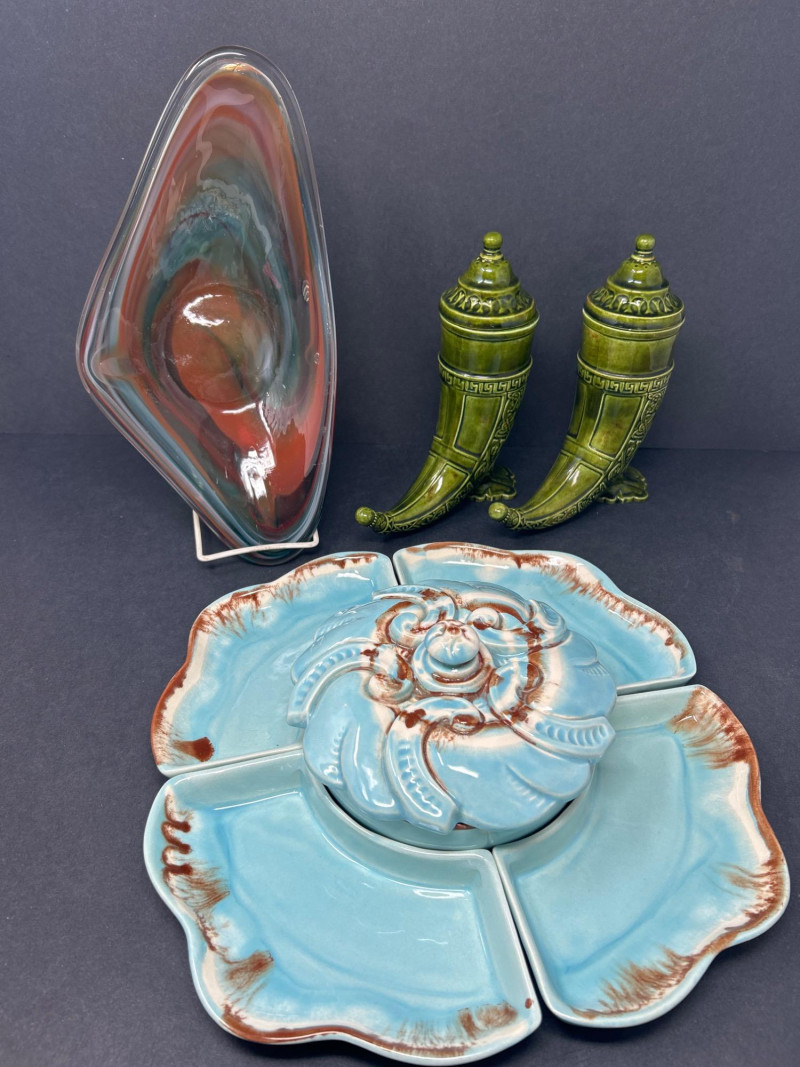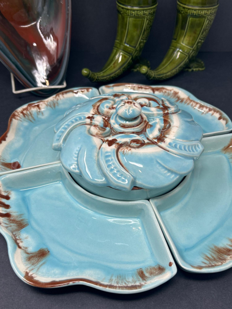 Dimensions: 13.5" diameter Material: Glazed ceramic Color: Soft turquoise blue with warm brown edge accents Design: Five-piece sectional tray with four removable petal-shaped dishes encircling a central round bowl. Lid features ornate scroll-and-floral embossing. Style: Mid-century entertaining ware; functional and decorative. Use: Ideal for hors d’oeuvres, candy, or snacks. Dimensions: 12.5" L × 6.5" W × 3" H Material: Blown art glass Color: Swirled teal, brick red, amber, and clear Design: Organic free-form shape with undulating rim and thick polished base. Style: Murano-inspired mid-century modern; dramatic and fluid. Use: Centerpiece, catch-all, or display accent. Dimensions: 10" H × 7" D Material: Glazed ceramic Color: Glossy olive green with tonal variation Design: Horn-shaped bodies with raised Greek key and Celtic scrollwork. Each urn has a domed lid with rounded finial and rests on a splayed footed base. Style: Neoclassical mid-century decorative pottery Use: Statement accents for mantel, console, or bookshelf styling.Turquoise Divided Serving Tray with Embossed Lidded Center Bowl