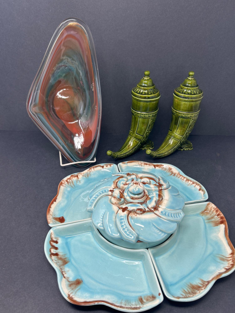 Lot # 104 - Mid-Century Ceramic & Art Glass Trio – Tray, Sculptural Bowl & Urns
