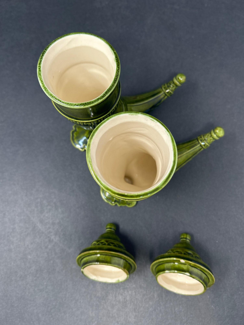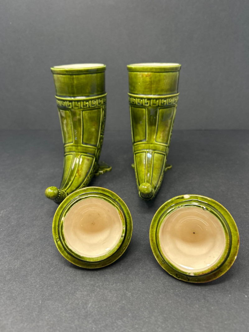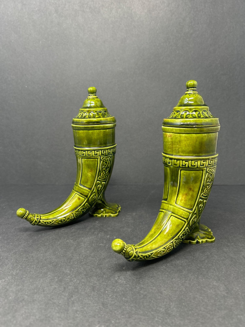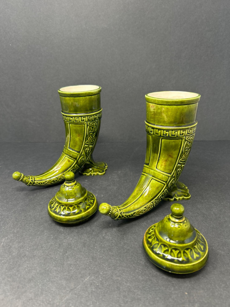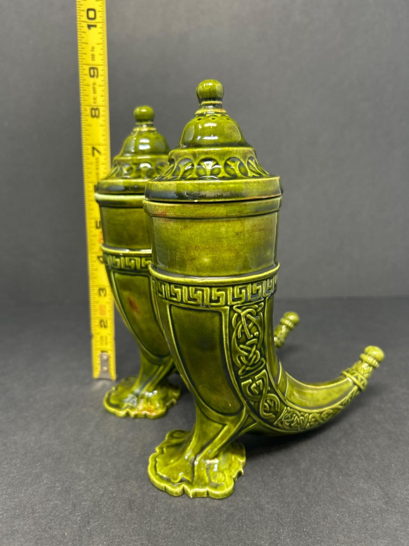 Pair of Ornate Cornucopia Urns – Green Glazed Ceramic