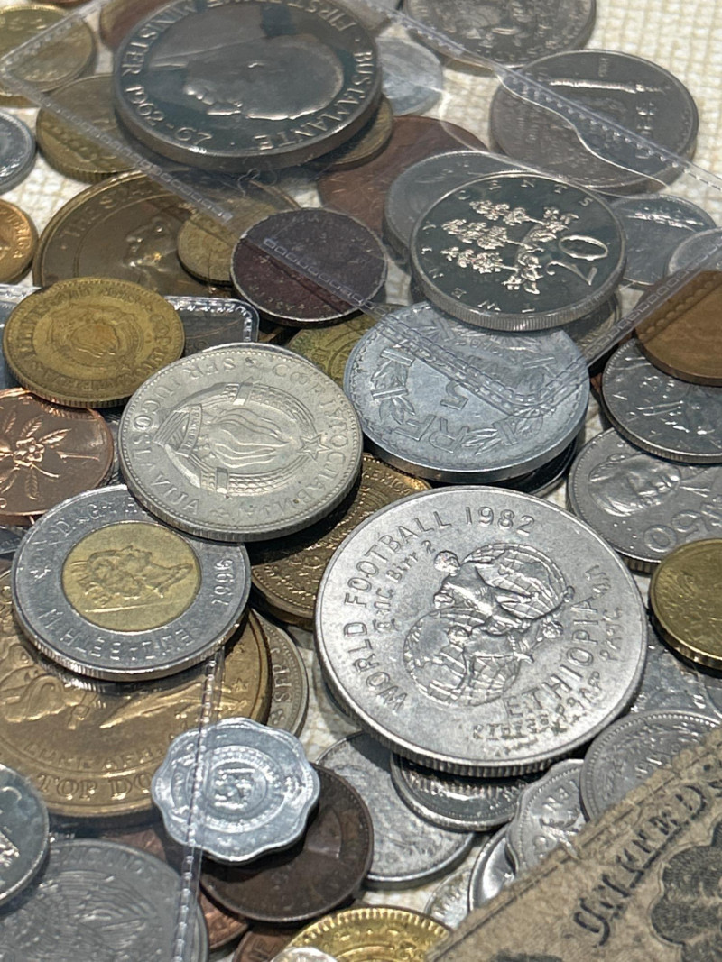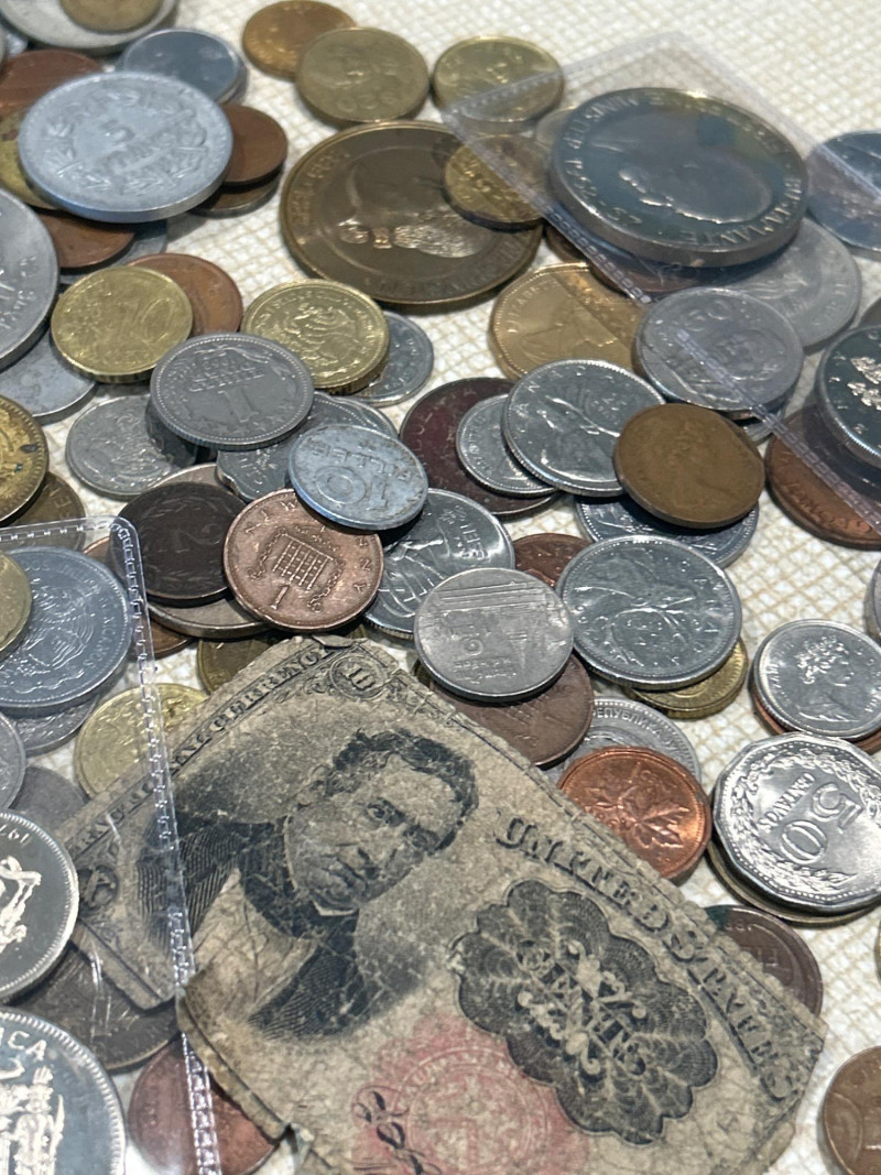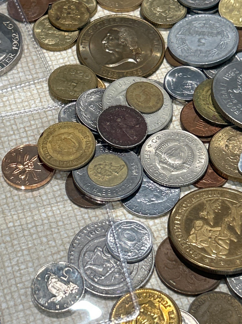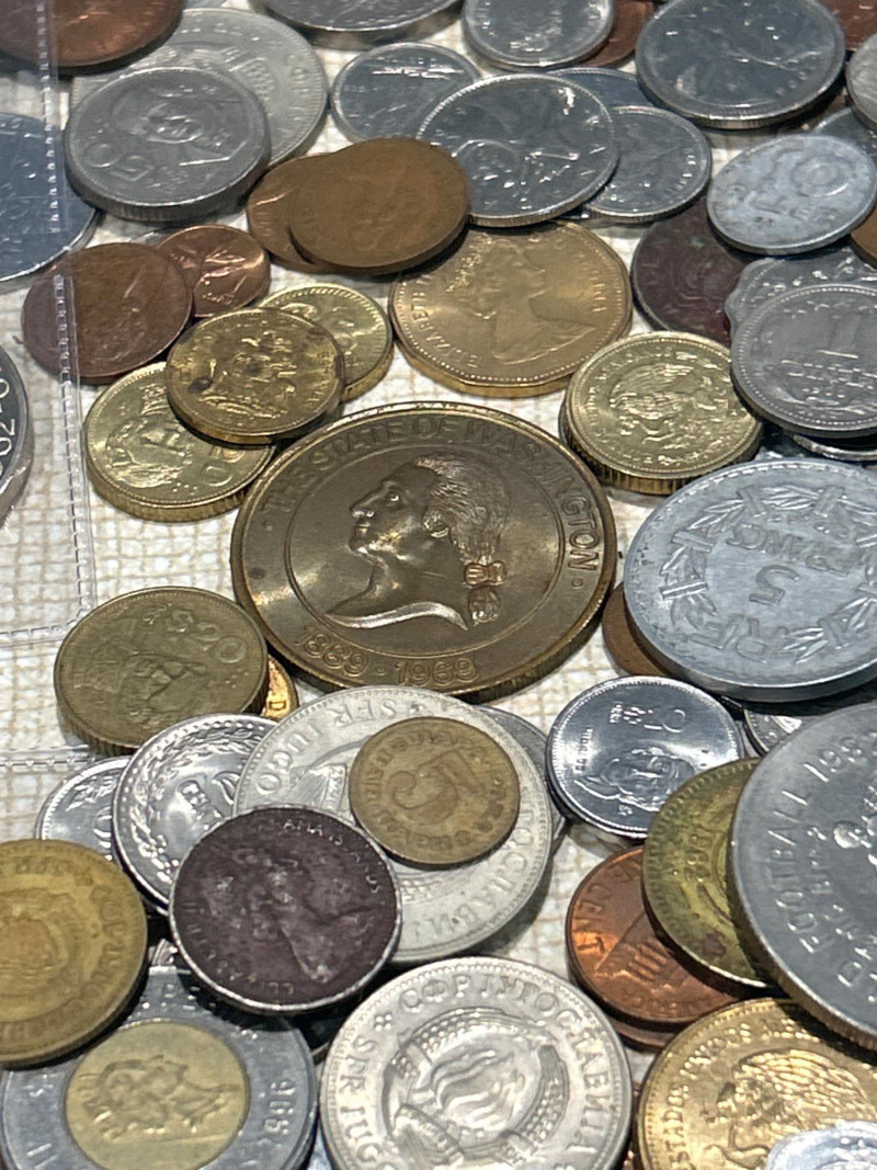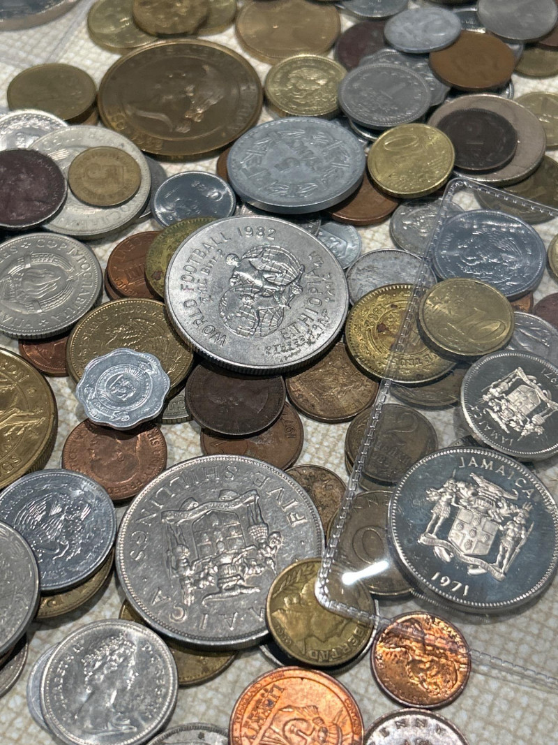 A vibrant and varied assortment of global coinage and vintage paper currency, ideal for collectors, resellers, or bulk stock buyers. This mixed lot includes: Copper, bronze, brass, nickel, and bimetallic issues from Europe, Asia, the Americas, and the Caribbean Notable examples include: Jamaica 5 Shillings 1971 – Crown-size coin with coat of arms Jamaica 5 Shillings 1962–1967 – Commemorative issue featuring Sir Alexander Bustamante Elizabeth II commemorative crowns & dollars – Includes Washington State Centennial 1889–1989 token/medal Mexican Peso & Cinco Pesos coins UK pennies, halfpennies, and two pence pieces Philippines 5 Piso & 1 Piso coins Additional visible coins from Germany, Italy, Hong Kong, and more Includes one well-worn U.S. fractional currency note Likely 19th-century design; shows heavy creasing and edge wear Includes coins and medals marking events such as World Football 1982, statehood anniversaries, and other souvenir strikes This lot offers a broad mix of countries, metals, and designs—perfect for: World coin enthusiasts Dealers seeking bulk inventory Hobbyists hunting for silver, copper, or low-mintage varietiesCirculating World Coins