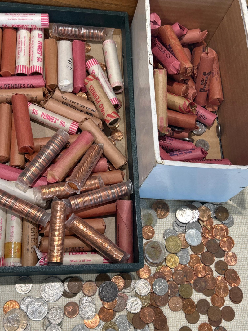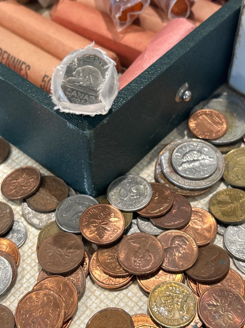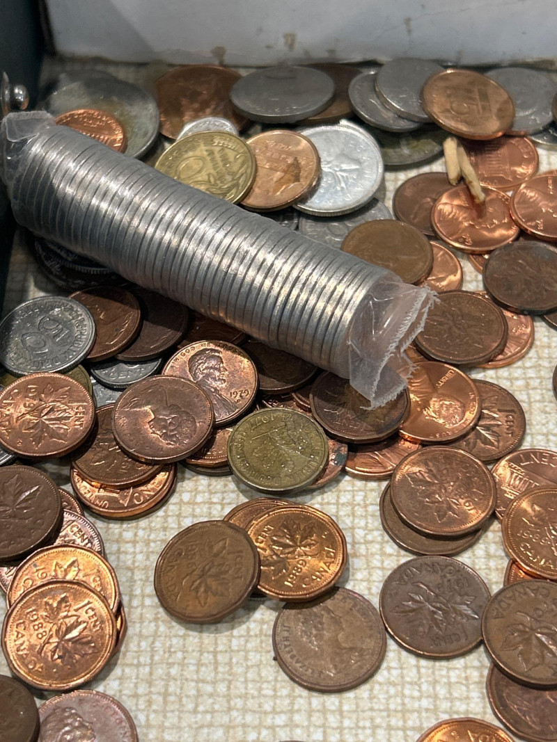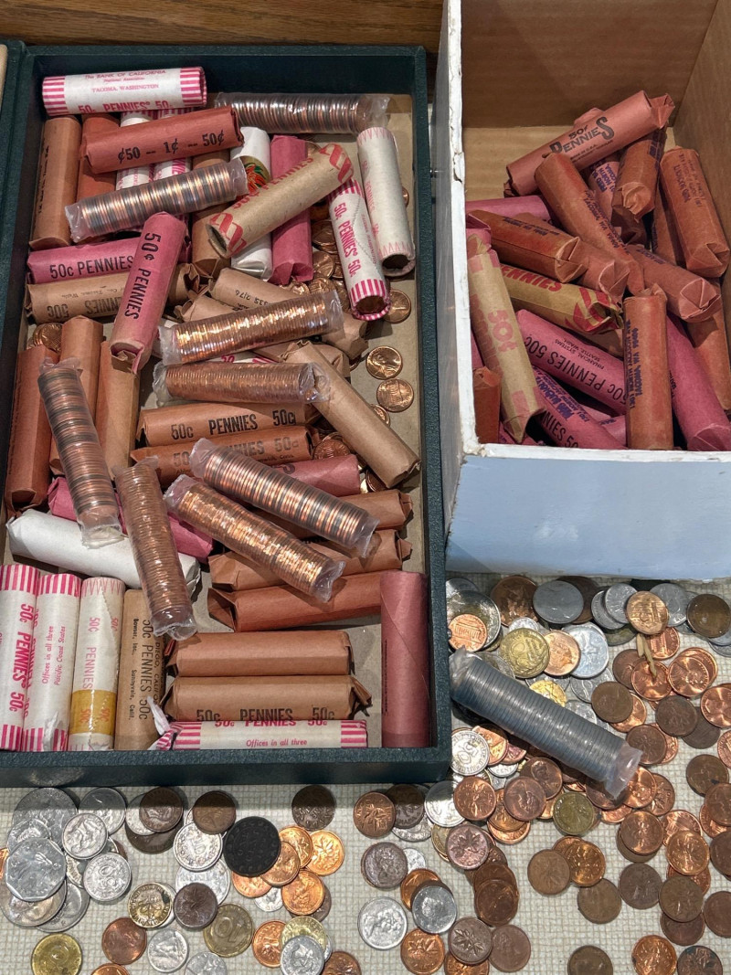 Contents: Approx. 50+ rolls of copper pennies Wrappers: Mixed paper and plastic, labeled “50¢ PENNIES” Banks/Labels: Includes “Franklin Savings” and other vintage wrappers Condition: Circulated coins; wrappers show age and handling Notes: Some rolls are transparent, revealing clean copper coins Contents: Canadian penny rolls + one Canadian dime roll Designs: Maple leaf motifs, Bluenose schooner visible on dime Color: Copper and silver-toned coins Condition: Circulated; some rolls sealed, others loosely packed Notes: Ideal for sorting, resale, or metal value Types: U.S. nickels, dimes, quarters + international coins Metals: Copper, silver, and gold-toned Condition: Circulated; mixed years and origins Notes: May include collectible or foreign piecesBox A – Bulk U.S. Penny Rolls