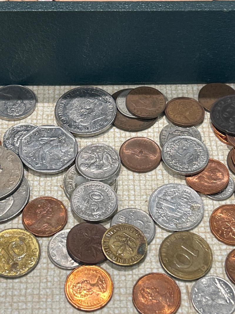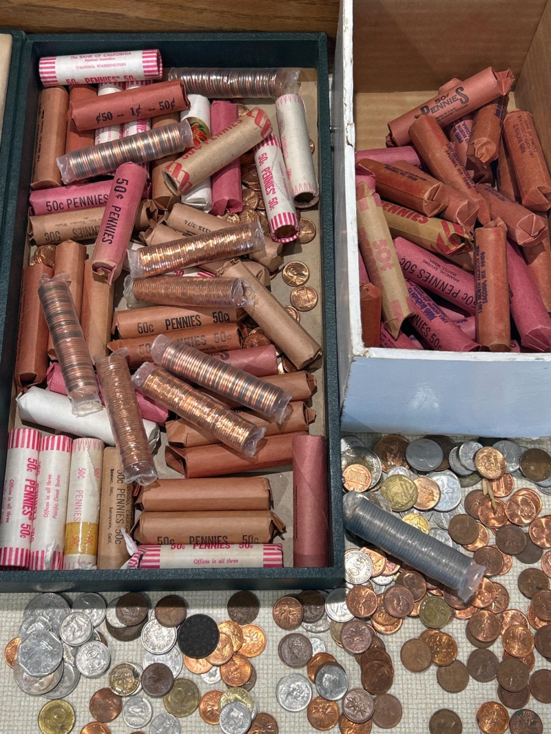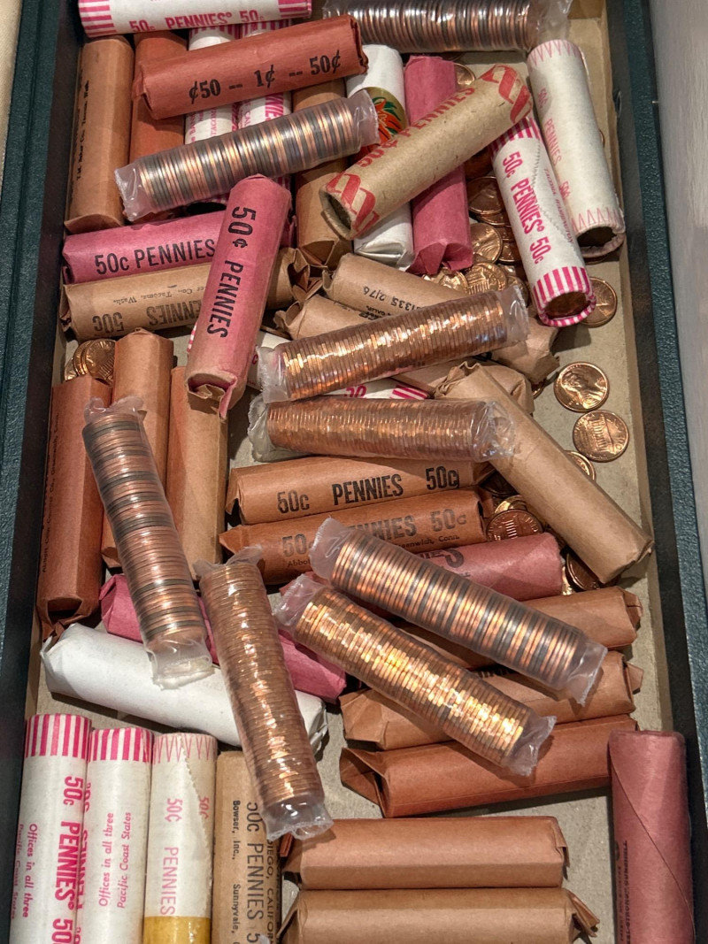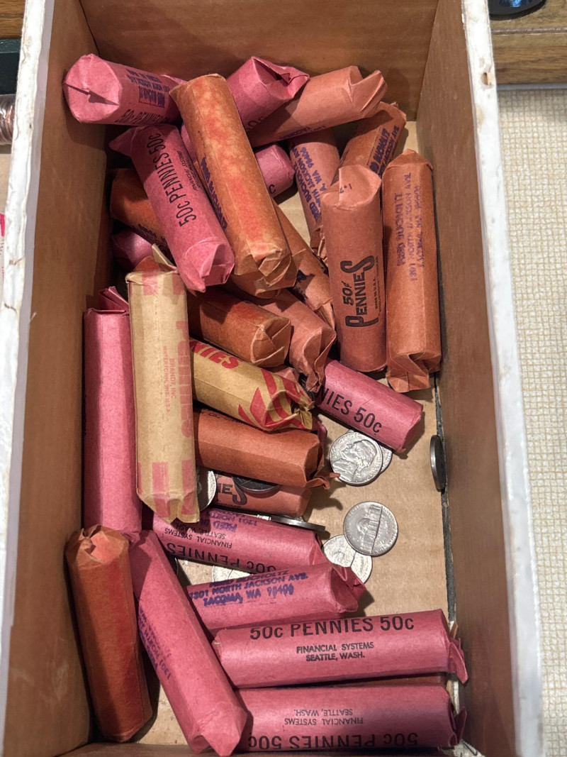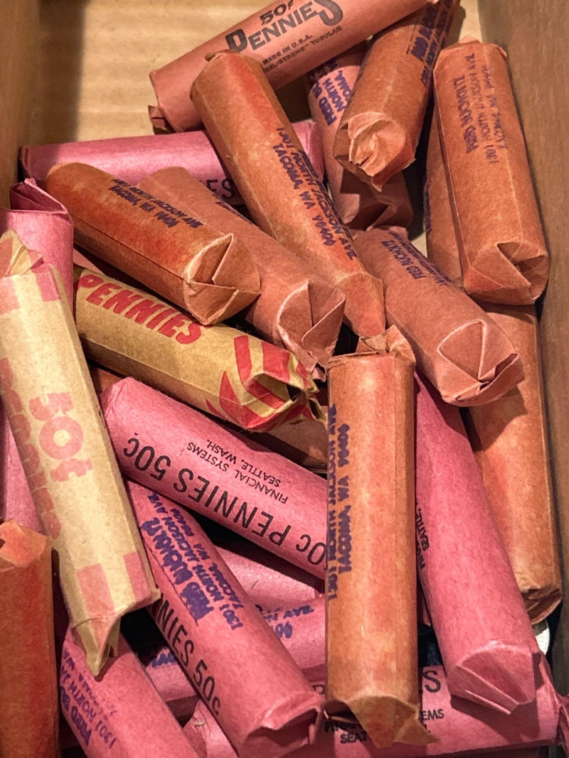 Contents: Approx. 50+ rolls of copper pennies Wrappers: Mixed paper and plastic, labeled “50¢ PENNIES” Banks/Labels: Includes “Franklin Savings” and other vintage wrappers Condition: Circulated coins; wrappers show age and handling Notes: Some rolls are transparent, revealing clean copper coins Contents: Canadian penny rolls + one Canadian dime roll Designs: Maple leaf motifs, Bluenose schooner visible on dime Color: Copper and silver-toned coins Condition: Circulated; some rolls sealed, others loosely packed Notes: Ideal for sorting, resale, or metal value Types: U.S. nickels, dimes, quarters + international coins Metals: Copper, silver, and gold-toned Condition: Circulated; mixed years and origins Notes: May include collectible or foreign piecesBox A – Bulk U.S. Penny Rolls