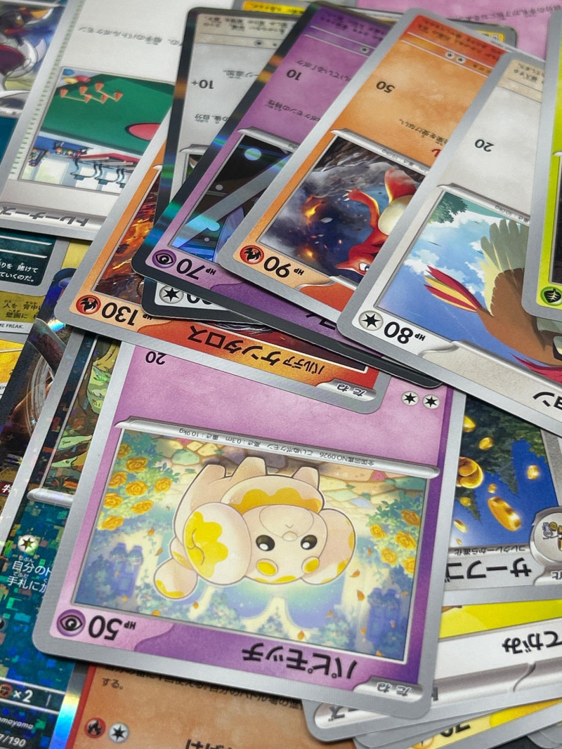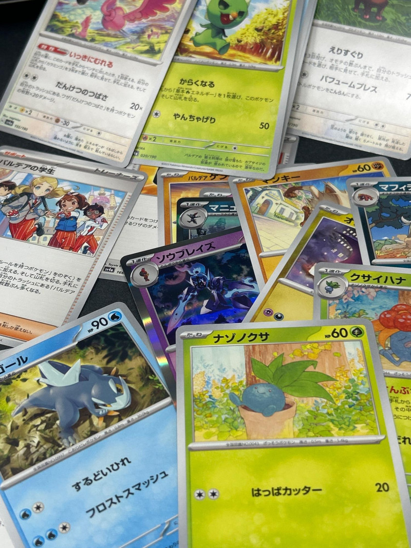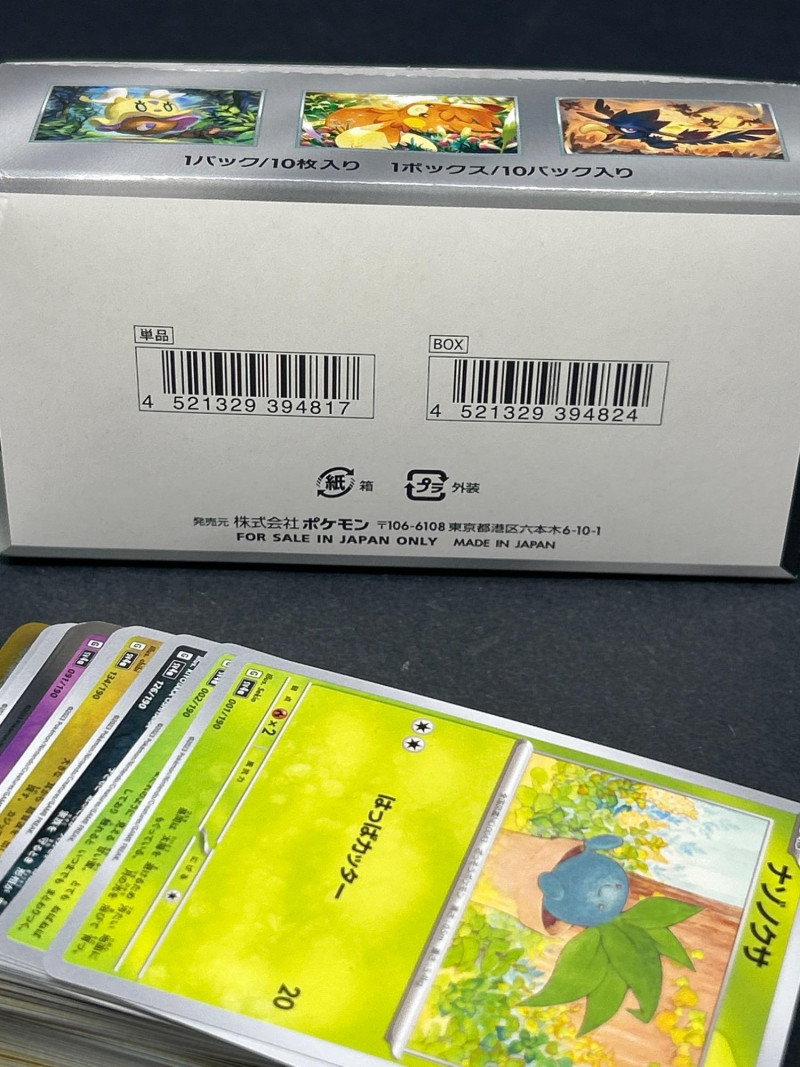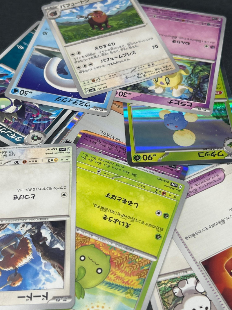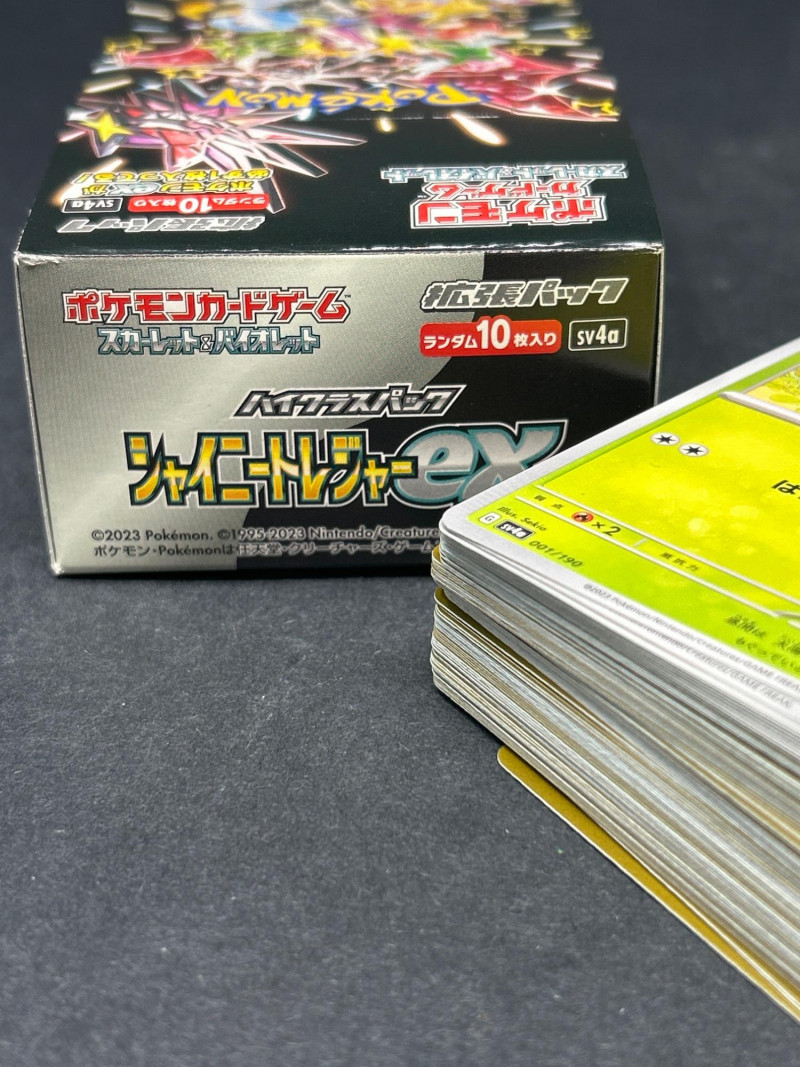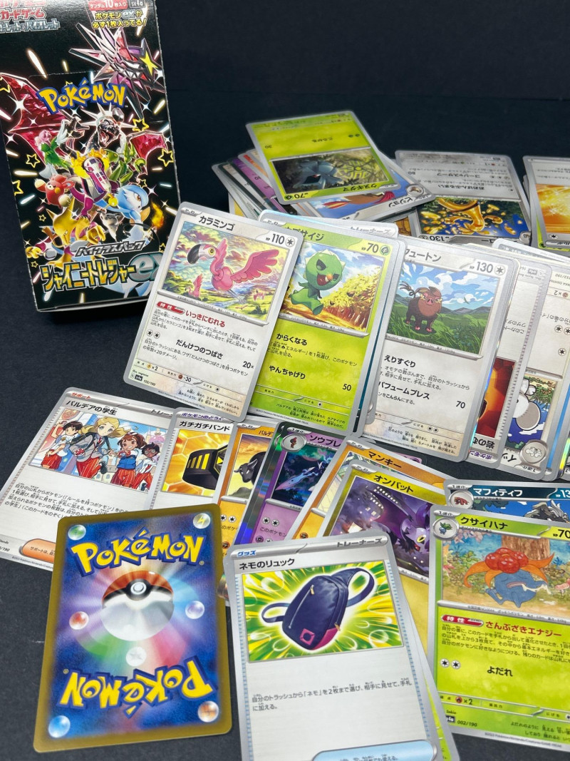 A vibrant and diverse assortment of Japanese Pokémon trading cards, featuring characters, energy types, and trainer cards from various series including the sought-after Shiny Treasure ex (SV4a) booster set. This lot includes: Series: Shiny Treasure ex (SV4a) Packaging: 1 sealed booster box Contents: 10 packs per box, 10 cards per pack Language: Japanese Copyright: ©2023 Pokémon / ©1995–2023 Nintendo / Creatures Inc. / GAME FREAK inc. Origin: Made in Japan Condition: Box appears sealed and in excellent condition Types Included: Pokémon, Trainer, and Energy cards Language: Japanese Notable Features: Holographic and non-holographic finishes Cards from multiple Pokémon types: Psychic, Grass, Fire, Electric, Fighting Includes Pokémon with moves such as: “たいあたり” (Tackle) – 20 damage “でんきショック” (Electric Shock) – 90 HP “パワフルプレス” (Powerful Press) – 70 damage “そだつリズム” (Growing Rhythm) One card features Oddish in a forest setting Includes energy cards and scenic trainer cardsBoxed Set: Shiny Treasure ex (SV4a)