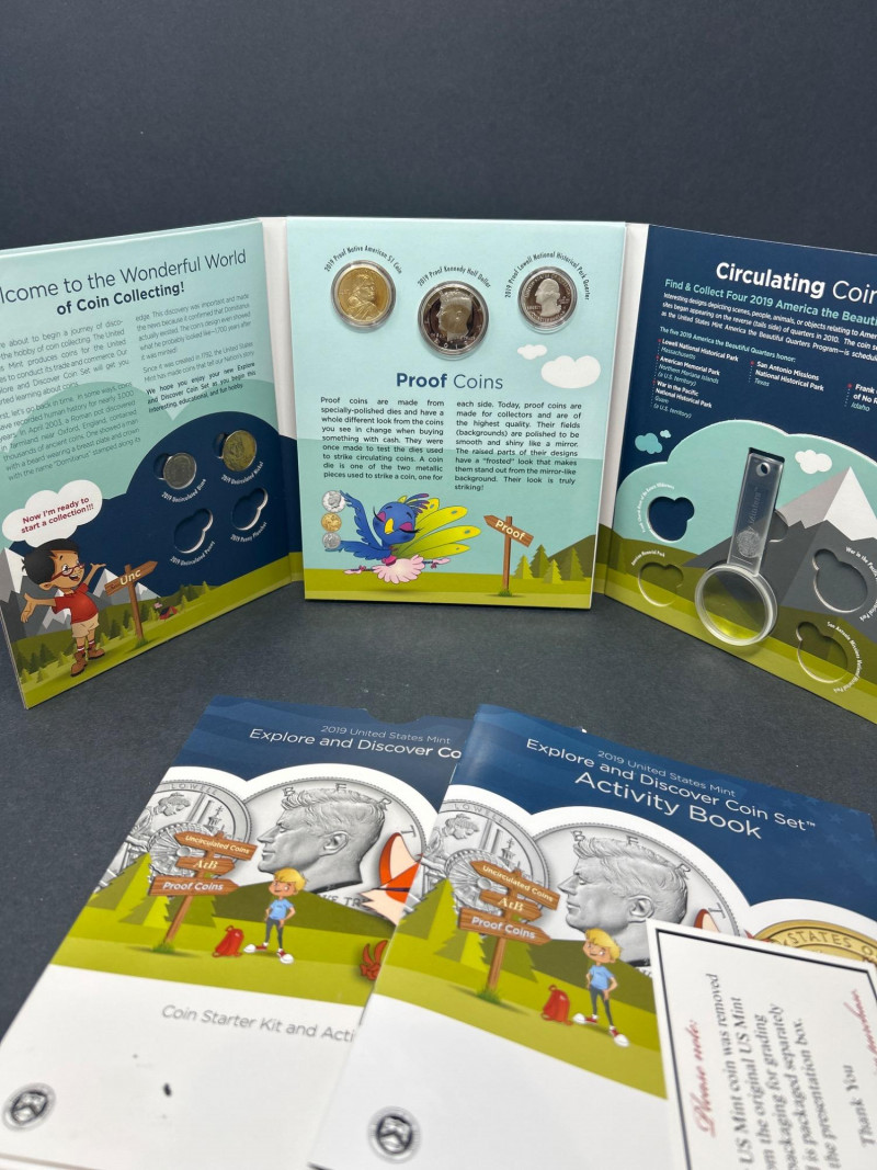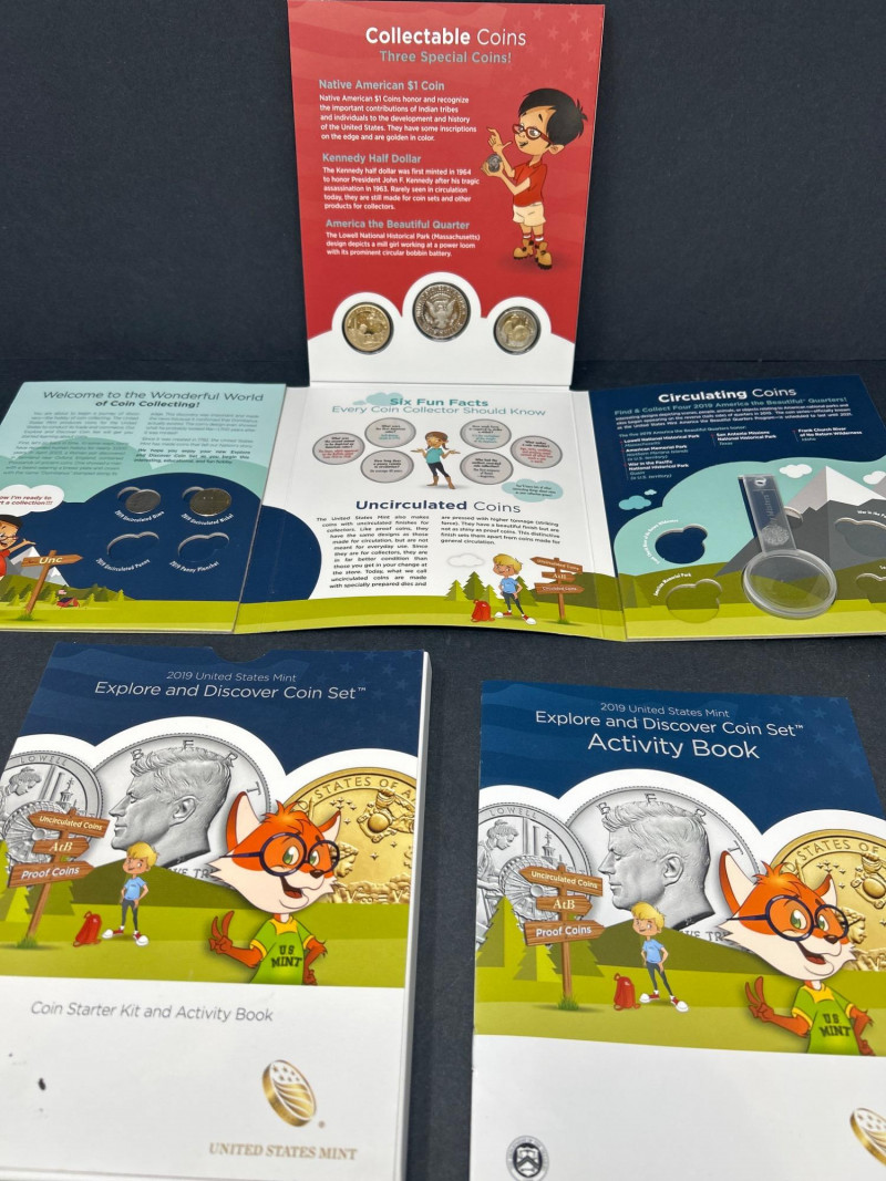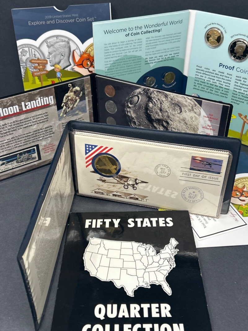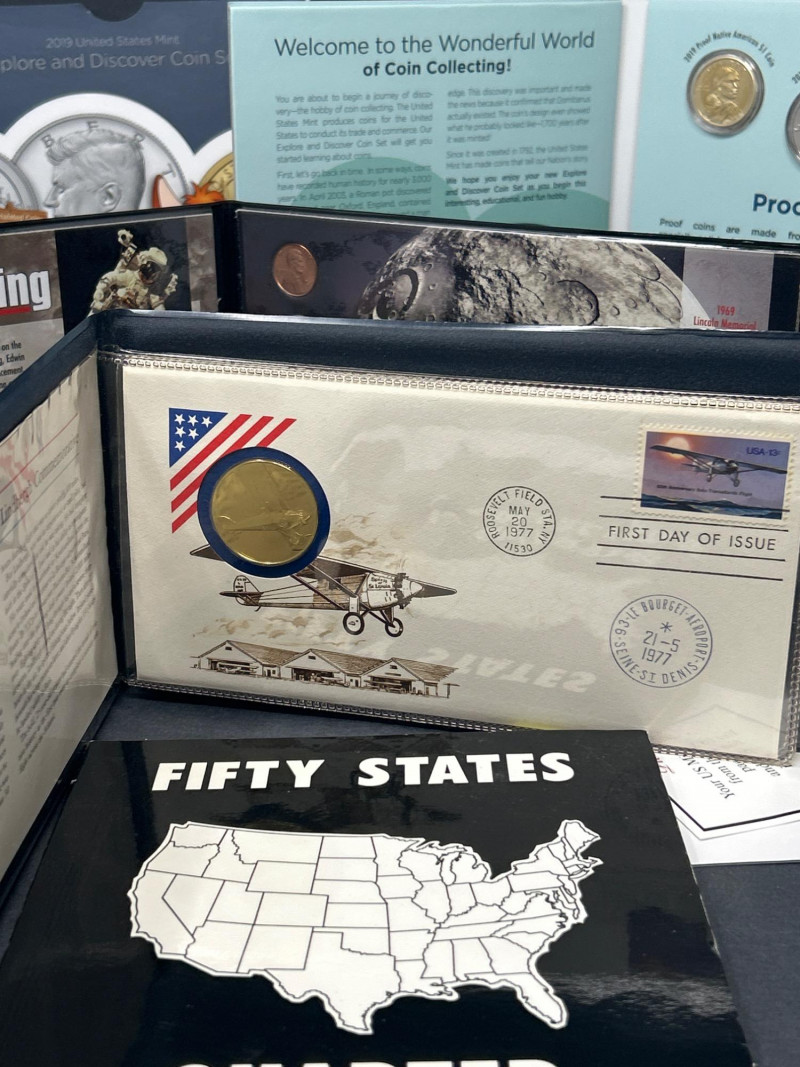 Contents: Uncirculated and proof examples: Kennedy Half Dollar, Native American $1, America the Beautiful Quarter Illustrated Coin Starter Kit & Activity Book Educational inserts on minting, proof coins, and collecting tips Highlights: Official U.S. Mint release Designed for entry-level collectors and educational use Combines collectible coins with engaging learning materials Contents: Labeled folder with slots for all 50 state quarters Many positions pre-filled with circulated examples Highlights: Classic black-and-white U.S. map cover Organized interior for state-by-state collecting Ready-made starter or completion set Contents: Selection of U.S. coins Historic Apollo 11 Moon Landing display Commemorative postage stamps Highlights: Honors America’s first lunar mission Attractive presentation for coin and space history collectors Philatelic and numismatic crossover Contents: Two First Day Covers Gold-plated Franklin Mint med alettes Roosevelt Field cancels dated May 20, 1977 Highlights: Celebrates Lindbergh’s 1927 transatlantic flight Artful cachets with aircraft and Eiffel Tower motifs Combines Medallia art, postal history, and aviation heritage2019 U.S. Mint “Explore and Discover Coin Set™”