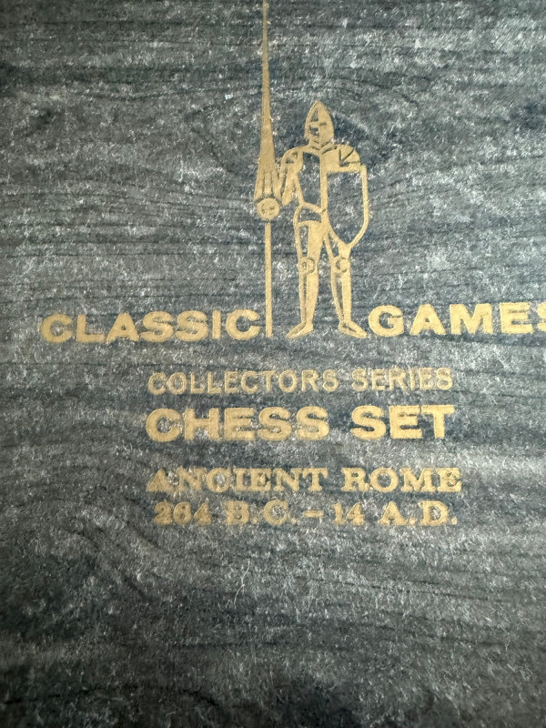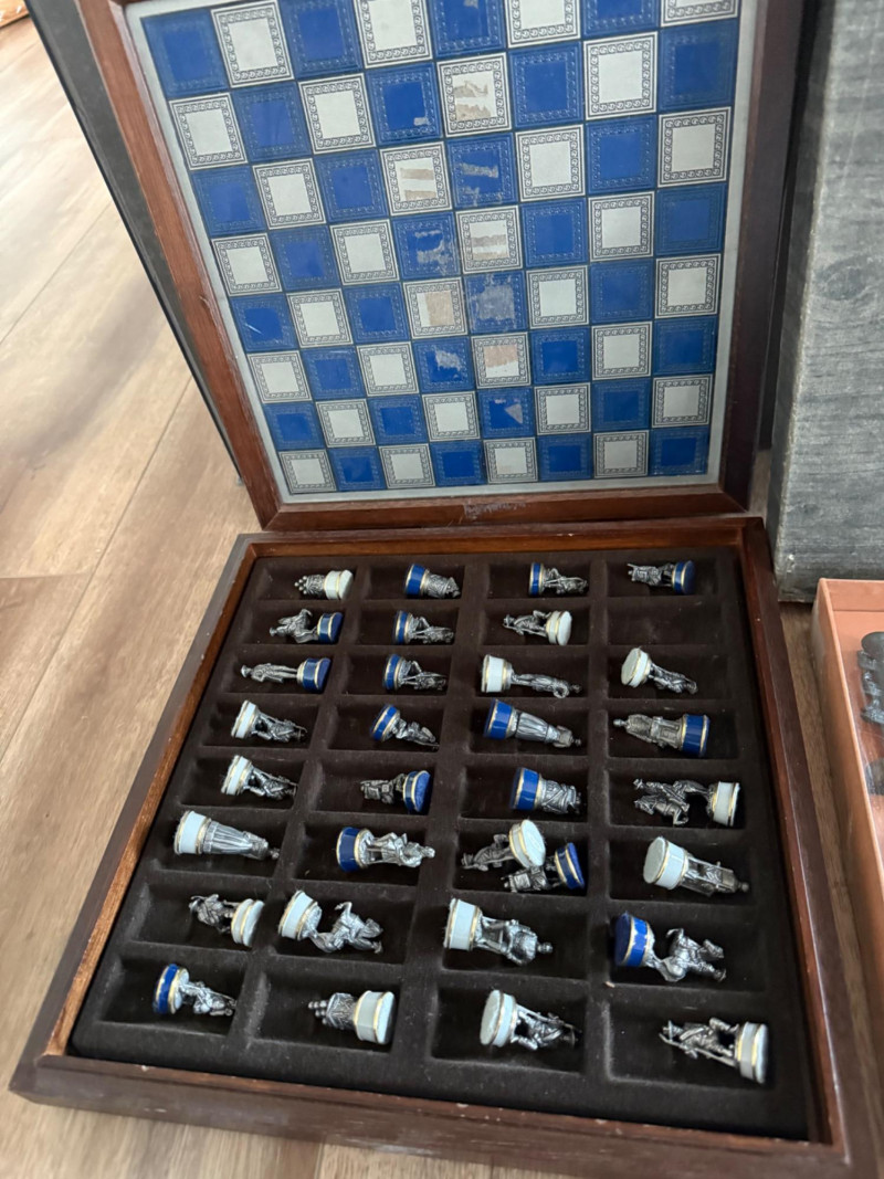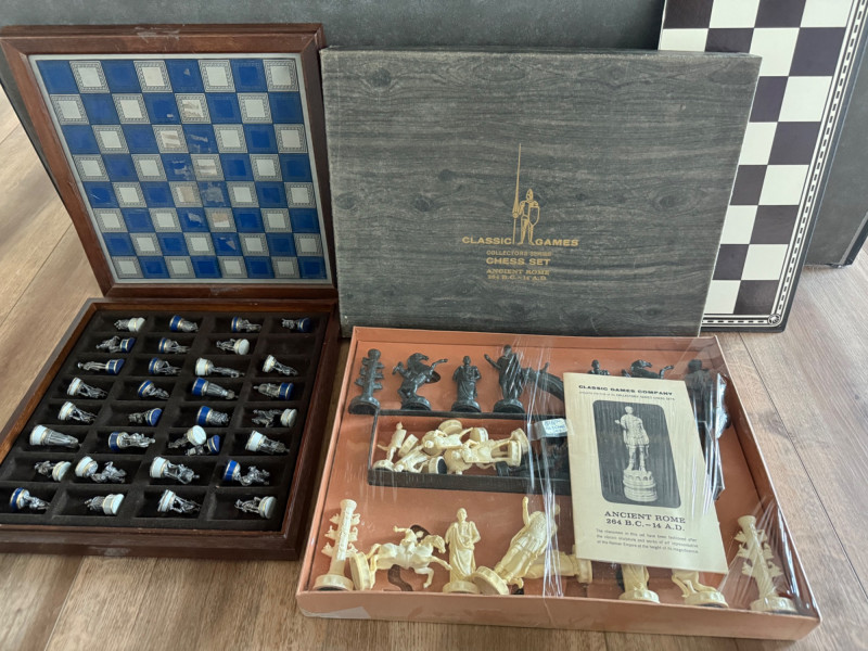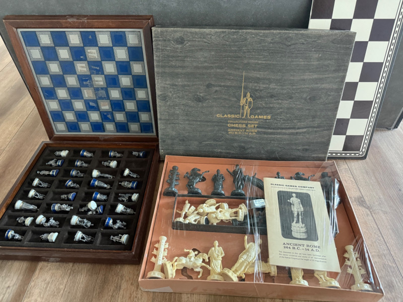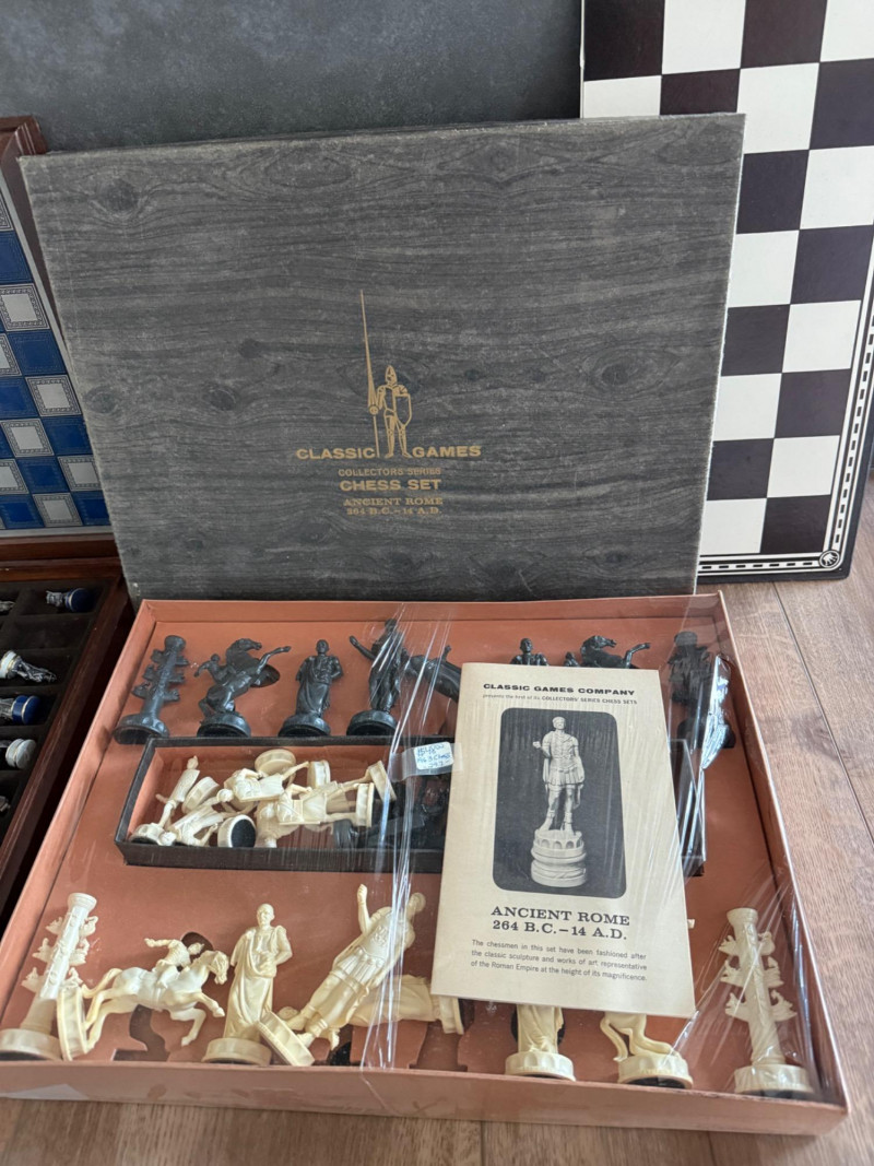 A pair of distinctive chess sets for the collector with an eye for history and display: Classic Games Ancient Rome Chess Set (Sealed): Featuring Roman soldiers and historical figures, this unopened set includes a 56 B.C.–44 A.D. pamphlet and sculptural pieces ideal for gifting or preservation. Blue & White Historical Chess Set in Wooden Box: Presented in a hinged case with a checkered board interior, this set includes individually housed pieces—possibly themed around cultural or historical icons—rendered in a striking blue and white palette. A refined offering from The Collector’s Vault, where retro icons meet artistic whimsy.