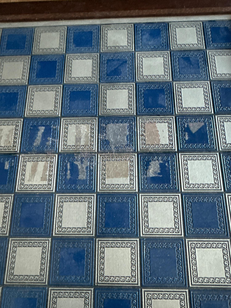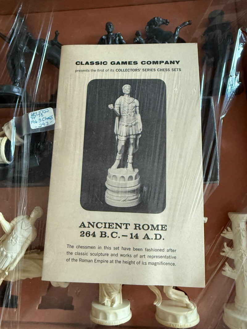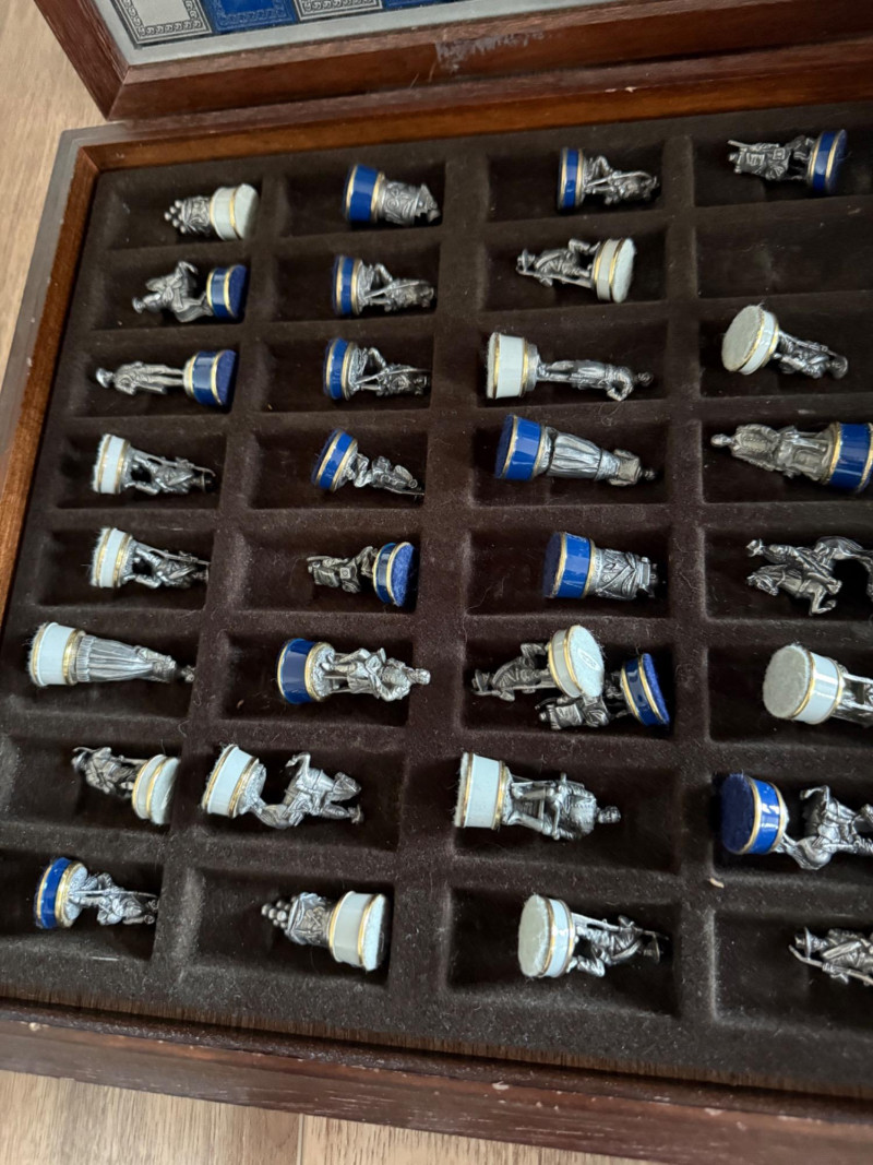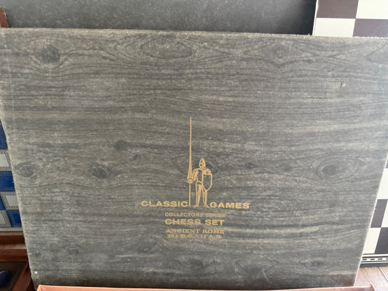 A pair of distinctive chess sets for the collector with an eye for history and display: Classic Games Ancient Rome Chess Set (Sealed): Featuring Roman soldiers and historical figures, this unopened set includes a 56 B.C.–44 A.D. pamphlet and sculptural pieces ideal for gifting or preservation. Blue & White Historical Chess Set in Wooden Box: Presented in a hinged case with a checkered board interior, this set includes individually housed pieces—possibly themed around cultural or historical icons—rendered in a striking blue and white palette. A refined offering from The Collector’s Vault, where retro icons meet artistic whimsy.