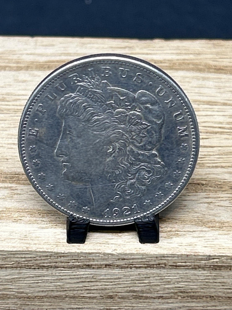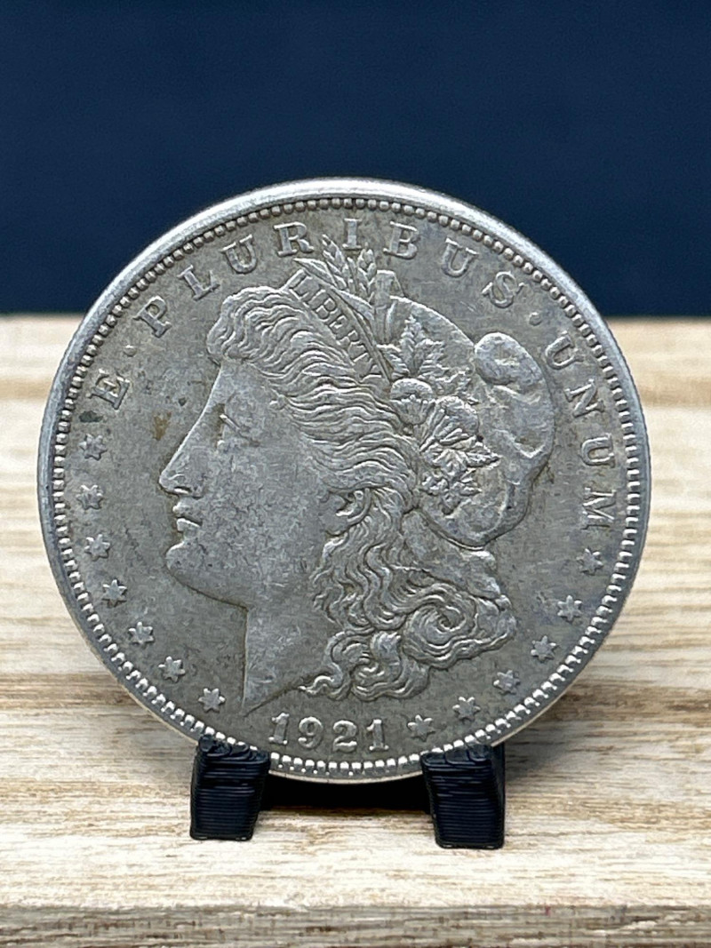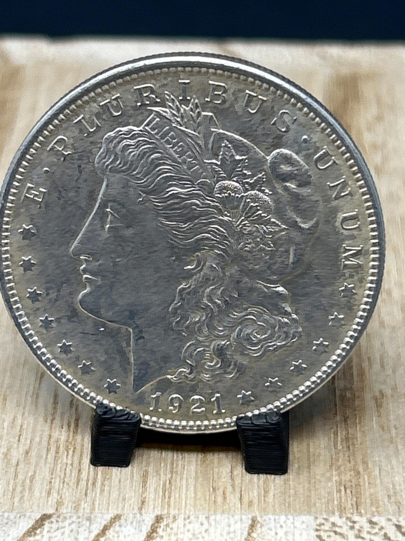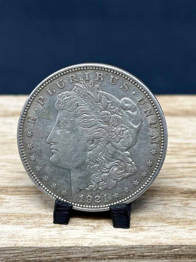 A classic 1921 Morgan silver dollar, minted in the final year of the series, featuring the iconic Liberty profile and heraldic eagle design. This coin represents a pivotal moment in U.S. numismatic history, bridging the transition from the Morgan to the Peace dollar. Specifications: Date: 1921 Mint: Philadelphia (no mint mark visible) Composition: 90% silver, 10% copper Diameter: 38.1 mm Weight: Approx. 26.73 grams Obverse: Lady Liberty wearing a Phrygian cap adorned with wheat and cotton; inscribed “E PLURIBUS UNUM” and dated 1921 Reverse: Eagle with outstretched wings clutching arrows and olive branch; surrounded by “UNITED STATES OF AMERICA,” “IN GOD WE TRUST,” and “ONE DOLLAR” Presentation: Displayed on a black coin stand atop a wooden base Highlights: Final-year Morgan dollar, ideal for collectors and silver investors Strong historical appeal and classic American design A foundational piece for any U.S. coin collection