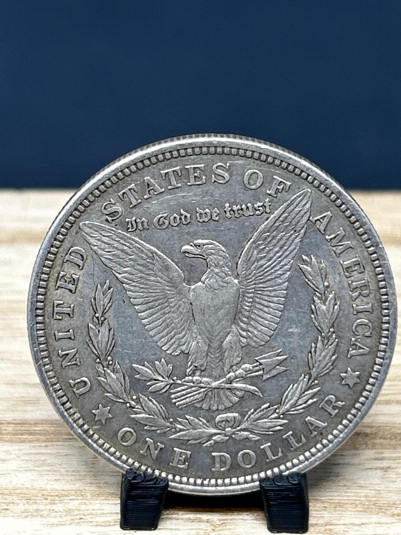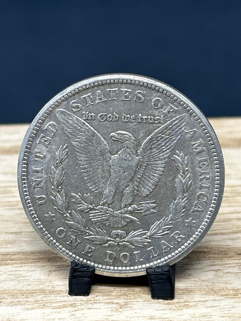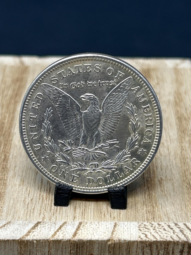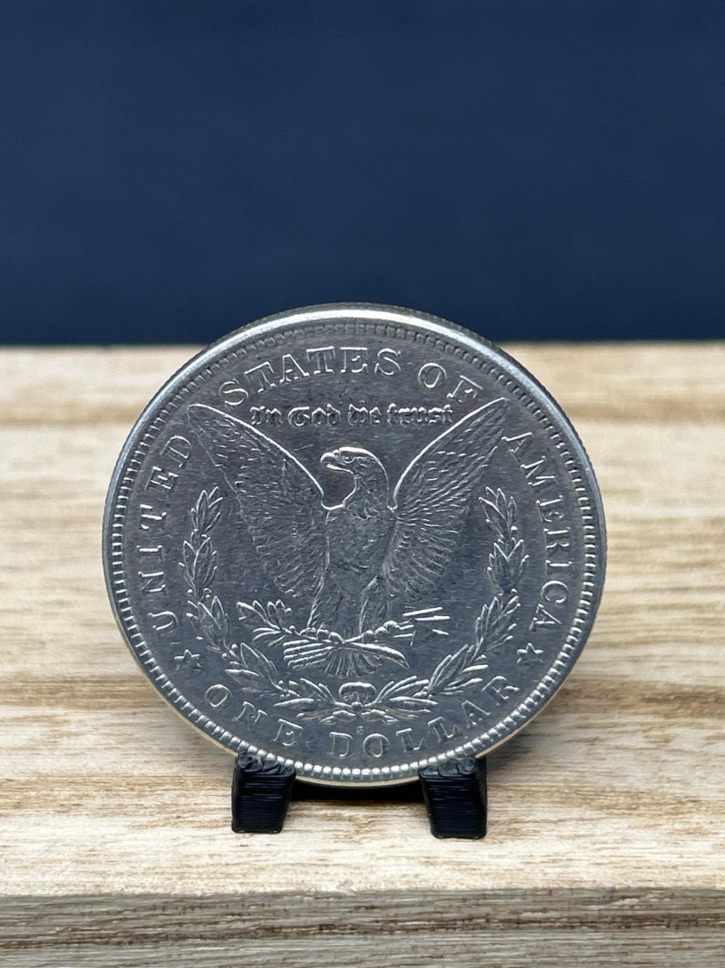 A classic 1921 Morgan silver dollar, minted in the final year of the series, featuring the iconic Liberty profile and heraldic eagle design. This coin represents a pivotal moment in U.S. numismatic history, bridging the transition from the Morgan to the Peace dollar. Specifications: Date: 1921 Mint: Philadelphia (no mint mark visible) Composition: 90% silver, 10% copper Diameter: 38.1 mm Weight: Approx. 26.73 grams Obverse: Lady Liberty wearing a Phrygian cap adorned with wheat and cotton; inscribed “E PLURIBUS UNUM” and dated 1921 Reverse: Eagle with outstretched wings clutching arrows and olive branch; surrounded by “UNITED STATES OF AMERICA,” “IN GOD WE TRUST,” and “ONE DOLLAR” Presentation: Displayed on a black coin stand atop a wooden base Highlights: Final-year Morgan dollar, ideal for collectors and silver investors Strong historical appeal and classic American design A foundational piece for any U.S. coin collection