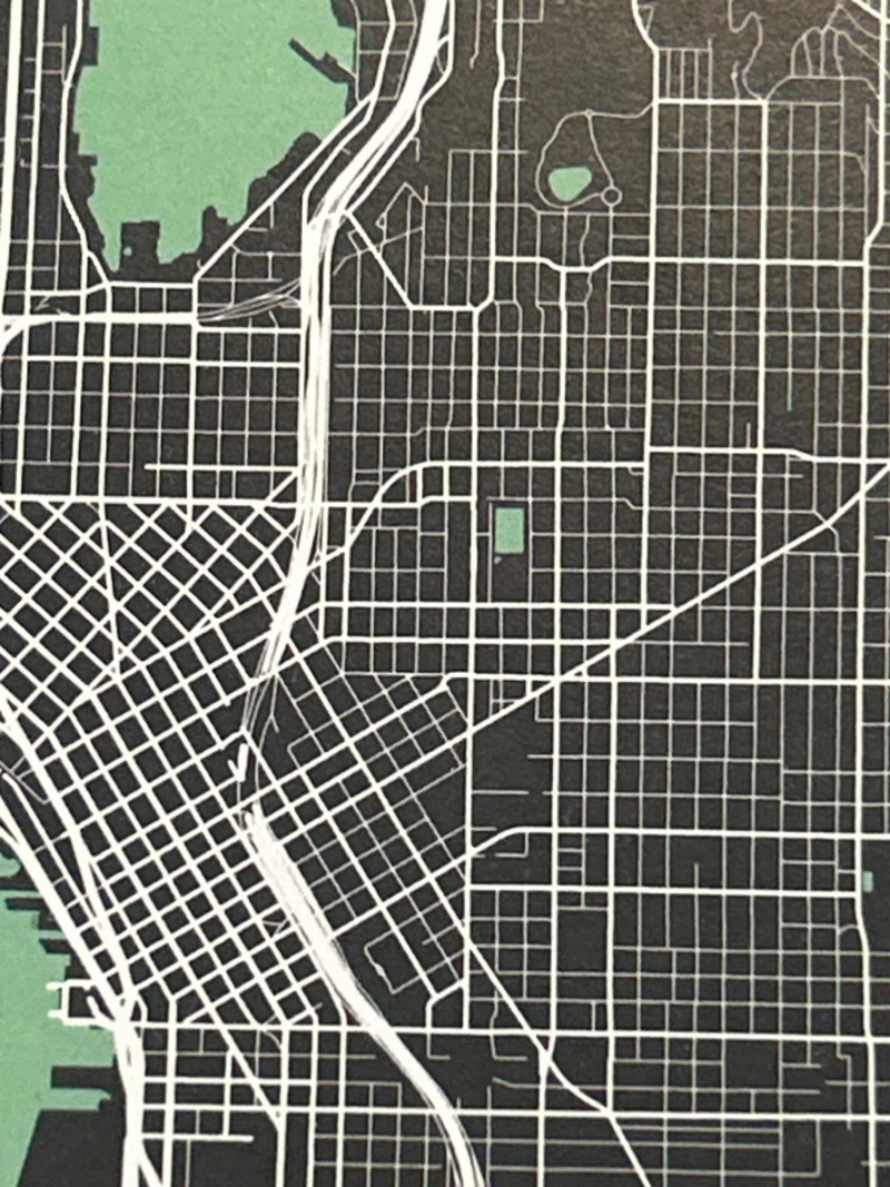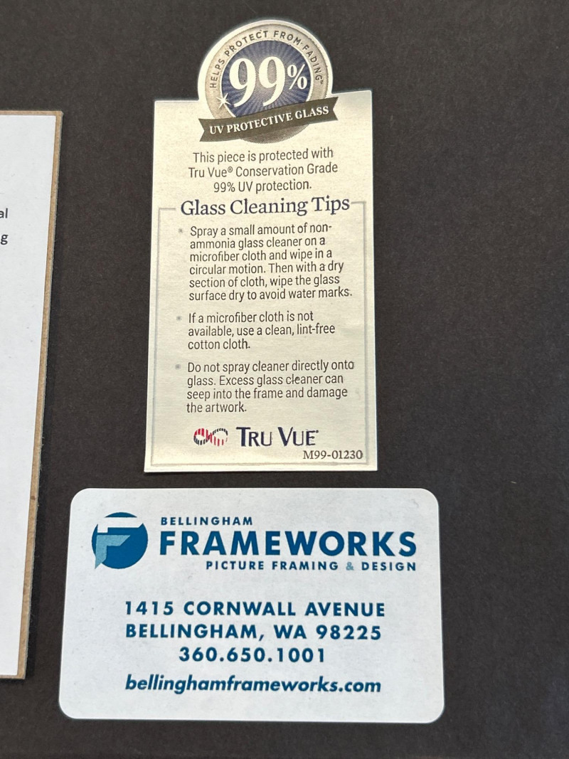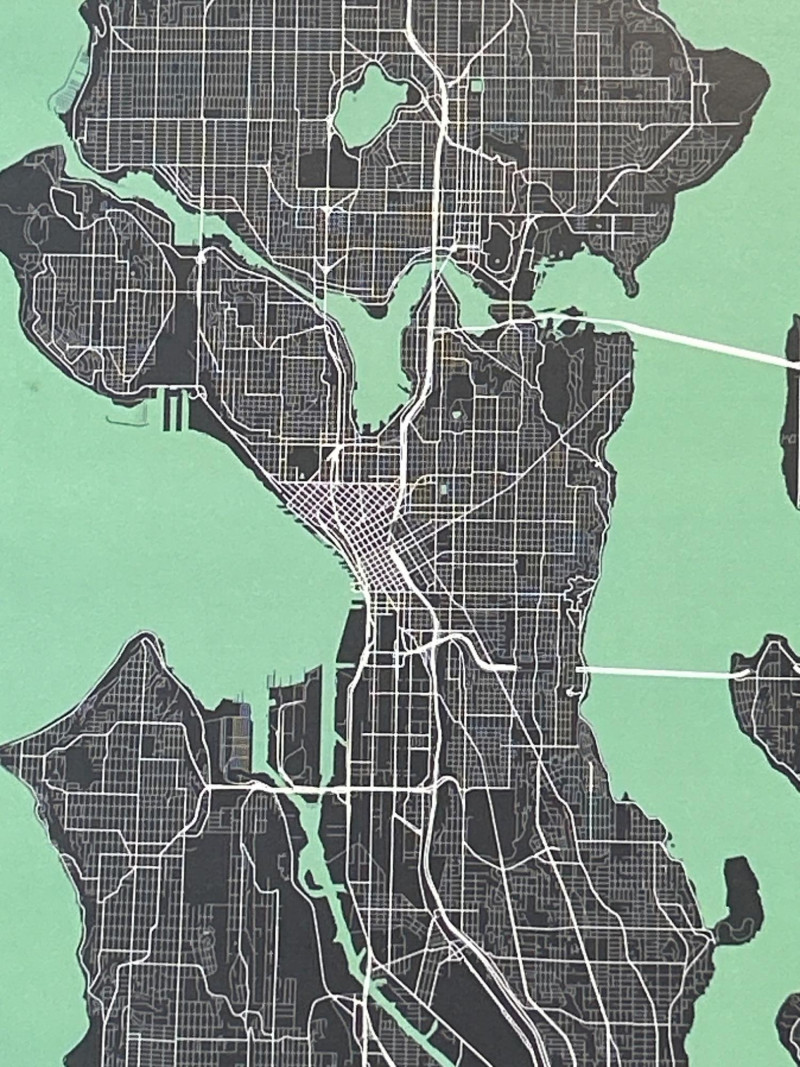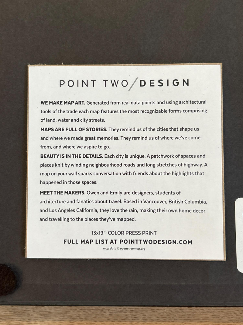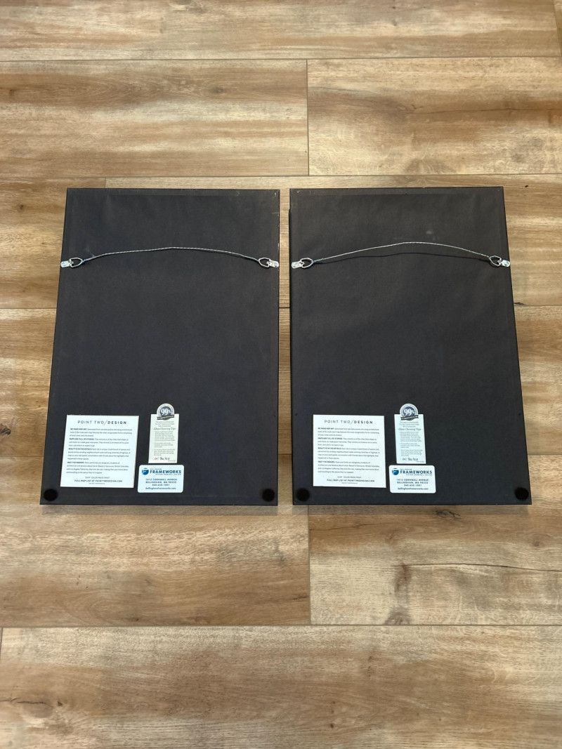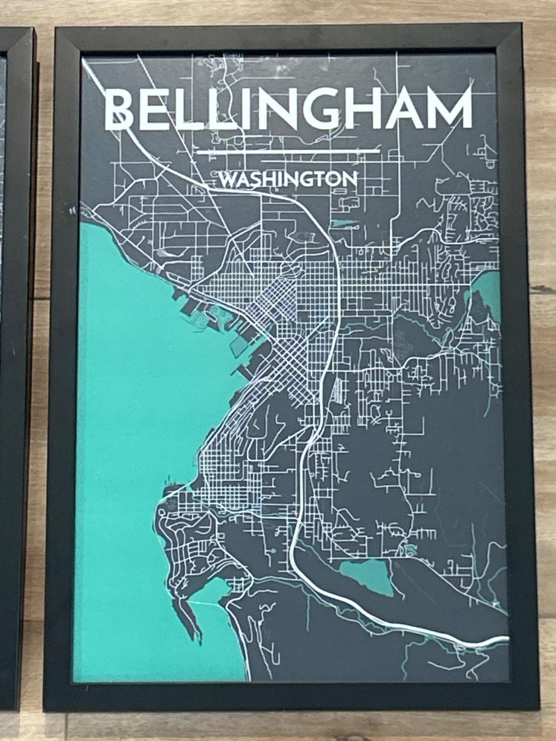 A striking duo of modern city map prints by Point Two Design, showcasing Seattle and Bellingham, Washington. Each map is crafted using authentic geographic data (OpenStreetMap), highlighting the distinctive street grids, land contours, and waterways of each city. The minimalist aesthetic features a teal and charcoal palette with crisp white labeling—ideal for contemporary interiors. Professionally matted and framed by Bellingham Frameworks (WA), both pieces are protected under Tru Vue® Conservation Grade glass offering 99% UV protection to preserve color and detail. Each frame includes a secure wire mount and back labels with artist statement, map source, and care instructions. Details: Maker: Point Two Design (Vancouver & Los Angeles–based studio) Medium: Color press print on paper Framing: Conservation-grade glass by Bellingham Frameworks Glass Typer Vue® Conservation Grade (99% UV Protection) Size (Print): Approx. 13" x 19" Size (Framed): Approx. 15" x 21" Mounting: Ready to hang with wire backing Back Labels: Artist statement, map source, cleaning instructions Why It’s Special: Museum-quality framing meets data-driven design. These prints are perfect for travel lovers, urban design enthusiasts, or anyone with a personal connection to Seattle or Bellingham. A stylish and meaningful addition to any space.