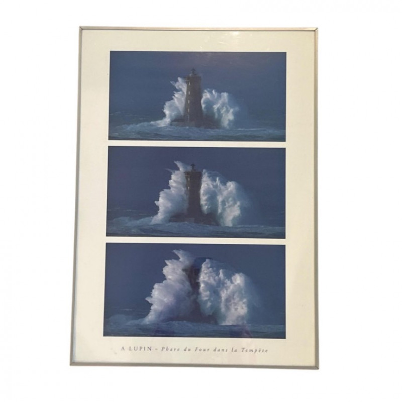 A striking framed triptych capturing the dramatic resilience of the Phare du Four lighthouse amid a tempestuous sea. This photographic sequence features three vertically arranged images, each documenting a moment of impact as colossal waves crash against the historic French lighthouse. The composition showcases nature’s raw power juxtaposed with human engineering, evoking themes of endurance and solitude. Dimensions: 29" x 28" (including frame) Medium: High-resolution photographic print on archival paper Presentation: Professionally mounted in a black wood frame with protective glazing Subject: Phare du Four lighthouse, Brittany coast, France Language Note: Captioned in French: “A LUPIN – Phare du Four dans la Tempête” This piece is ideal for collectors of maritime photography, coastal memorabilia, or those drawn to the poetic tension between sea and structure. A visually arresting addition to any wall.
