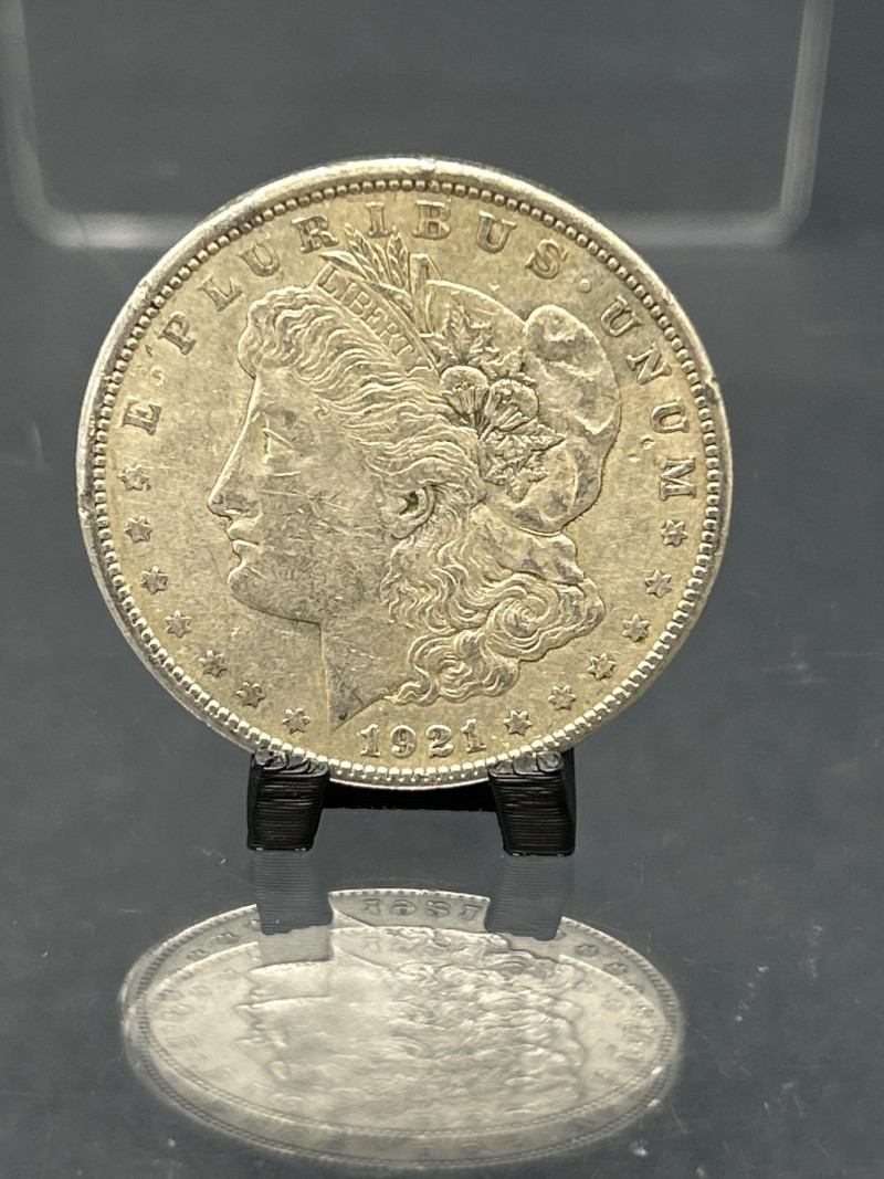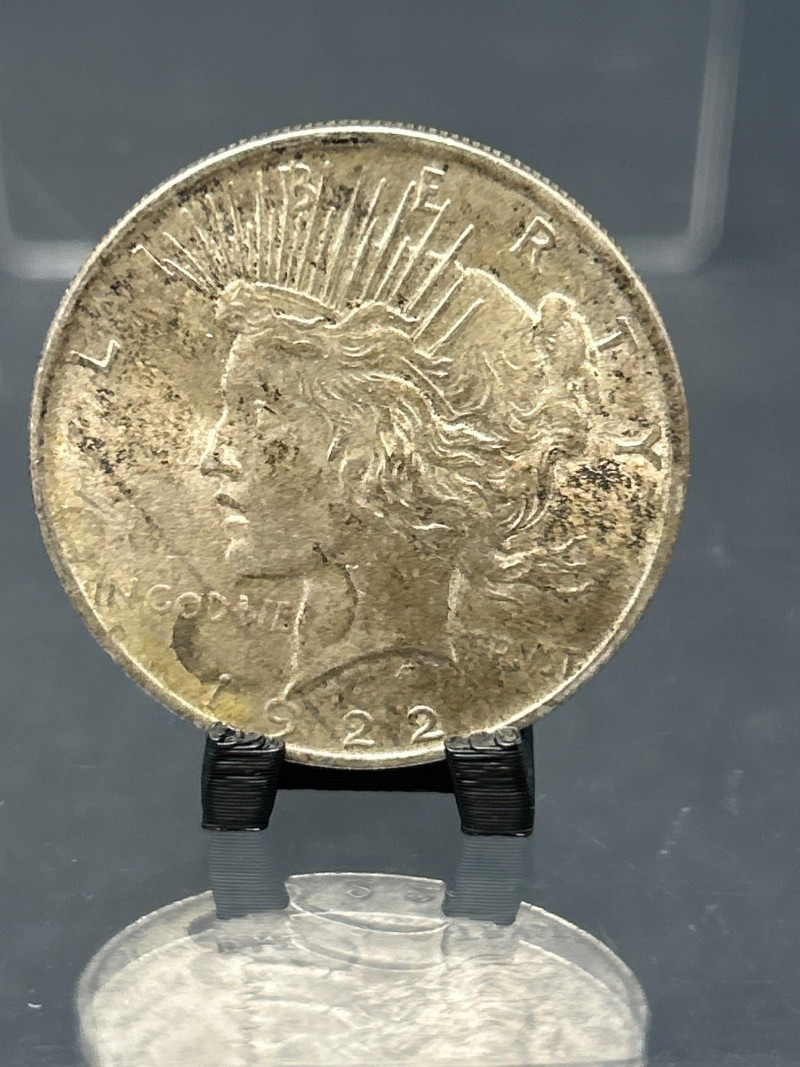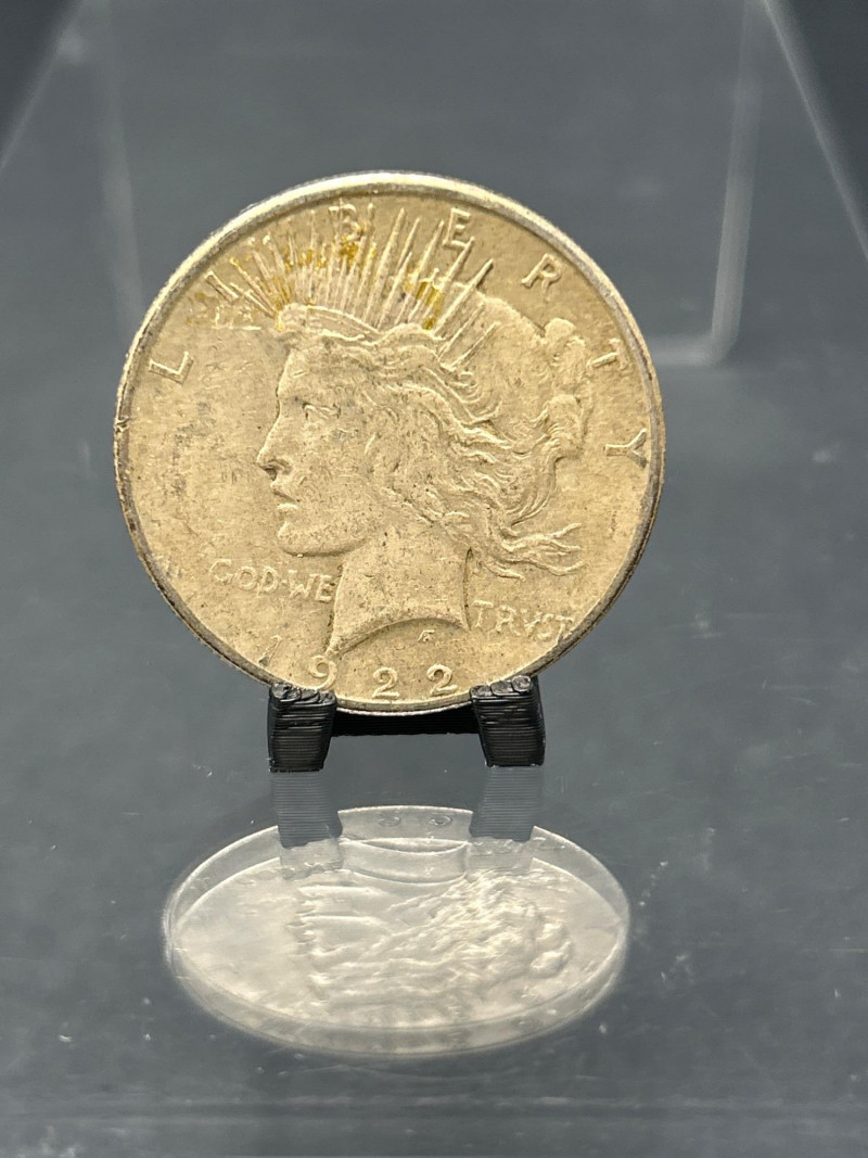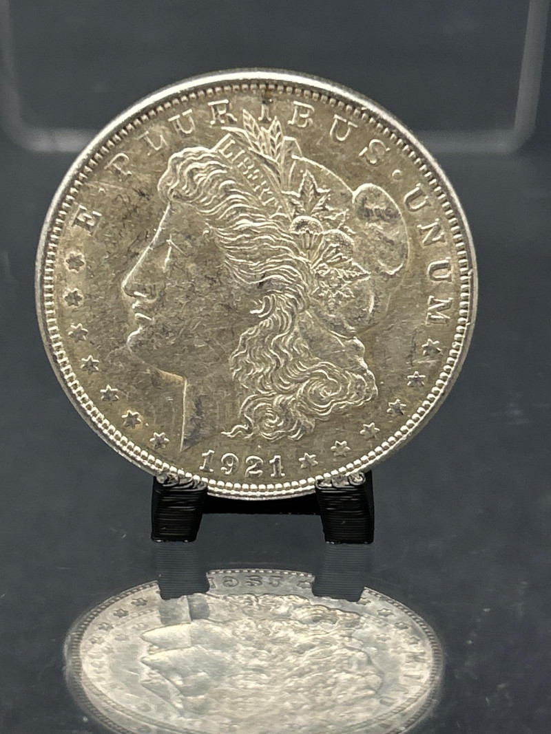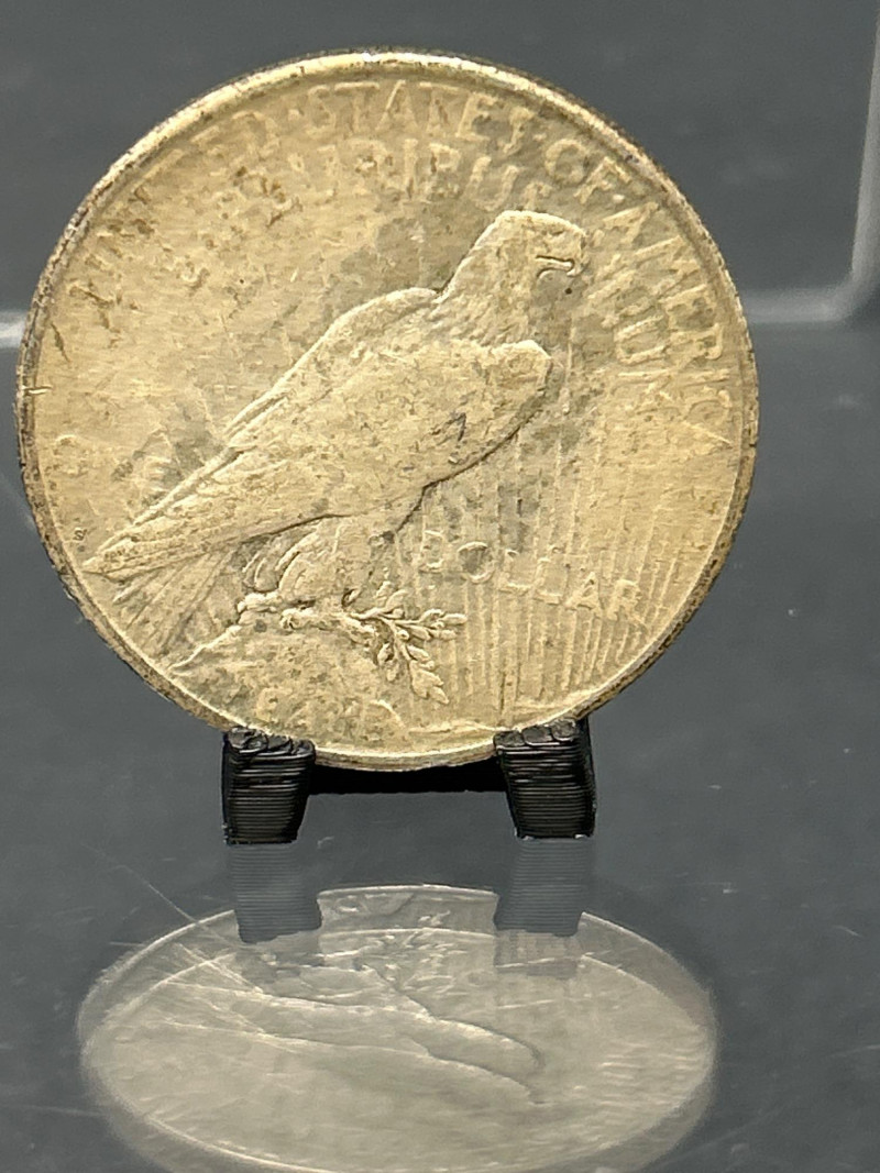 A compelling collector’s lot featuring five vintage U.S. silver dollars, comprising three Morgan Dollars and two Peace Dollars, each presented on individual black coin stands for display. Included Coins: Morgan Dollars (3 coins): 1921 (2 examples) – Final year of Morgan Dollar mintage, showcasing Lady Liberty in a Phrygian cap with “E PLURIBUS UNUM” encircling the obverse. Reverse features a heraldic eagle clutching arrows and olive branch. 1887 – A classic late 19th-century issue with sharp relief and well-preserved details. Peace Dollars (2 coins): 1922 & 1923 – Early issues of the Peace Dollar series, designed to commemorate the end of World War I. Obverse features Lady Liberty with a radiating crown; reverse depicts a perched eagle with “PEACE” inscribed below. Highlights: All coins are composed of 90% silver. Obverse and reverse details remain legible, with visible inscriptions and dates. Coins are ungraded but present well for display or further numismatic evaluation. Ideal for collectors seeking transitional examples between the Morgan and Peace series.