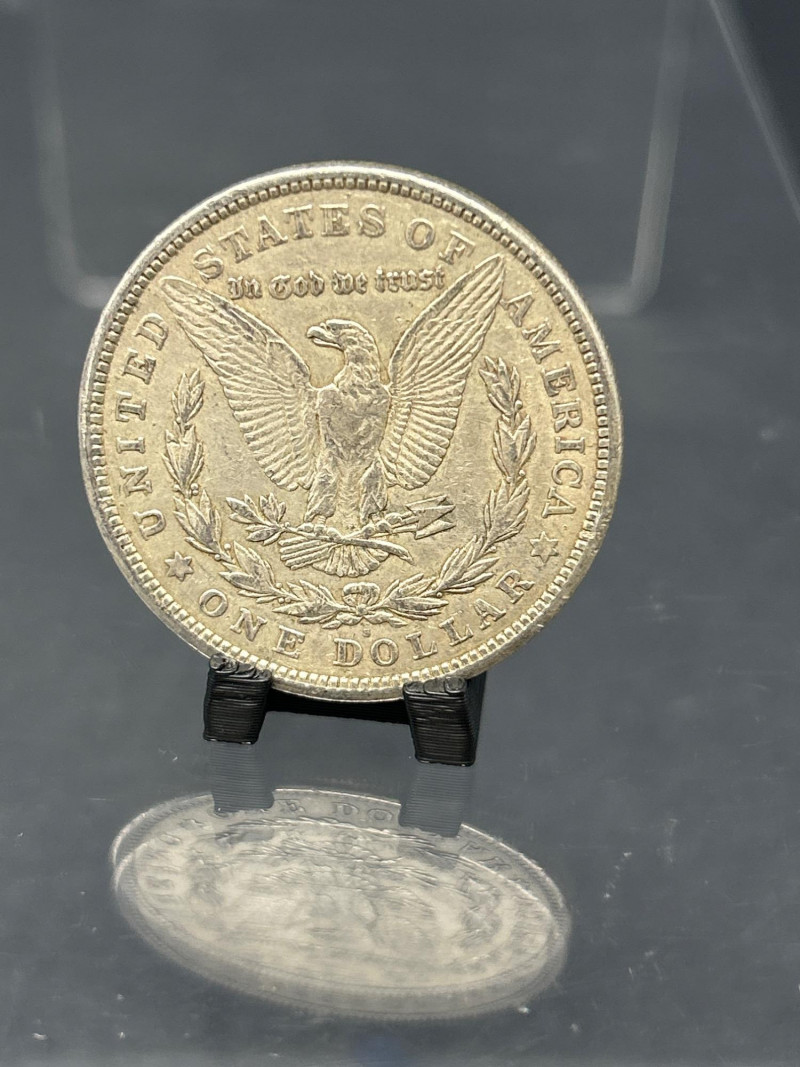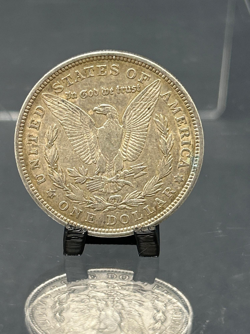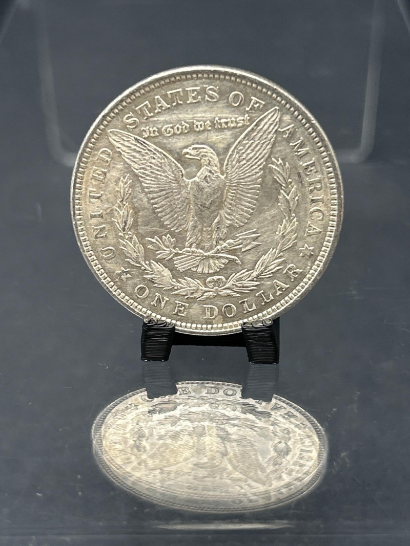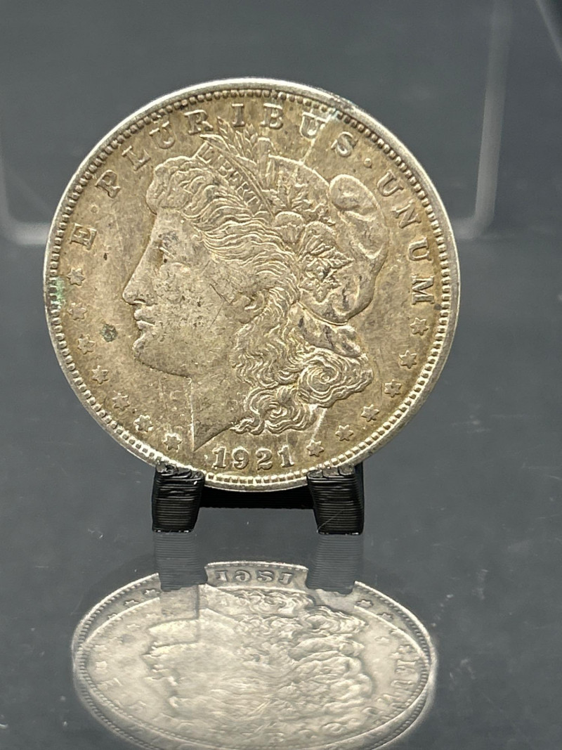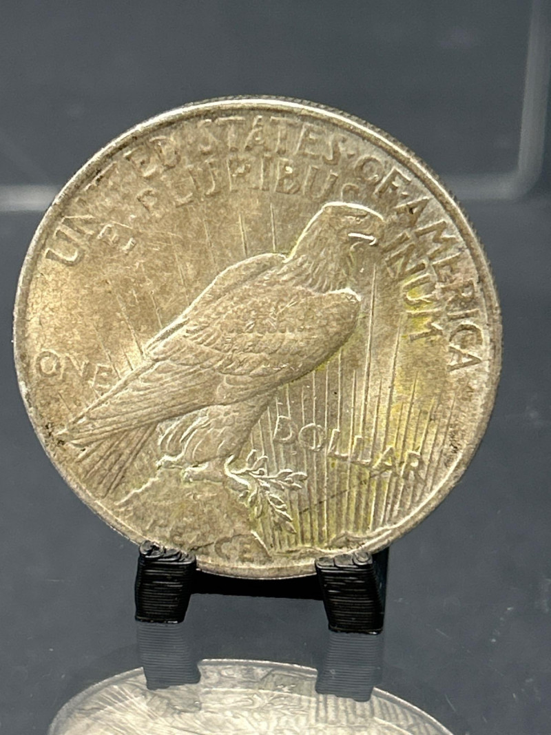 A compelling collector’s lot featuring five vintage U.S. silver dollars, comprising three Morgan Dollars and two Peace Dollars, each presented on individual black coin stands for display. Included Coins: Morgan Dollars (3 coins): 1921 (2 examples) – Final year of Morgan Dollar mintage, showcasing Lady Liberty in a Phrygian cap with “E PLURIBUS UNUM” encircling the obverse. Reverse features a heraldic eagle clutching arrows and olive branch. 1887 – A classic late 19th-century issue with sharp relief and well-preserved details. Peace Dollars (2 coins): 1922 & 1923 – Early issues of the Peace Dollar series, designed to commemorate the end of World War I. Obverse features Lady Liberty with a radiating crown; reverse depicts a perched eagle with “PEACE” inscribed below. Highlights: All coins are composed of 90% silver. Obverse and reverse details remain legible, with visible inscriptions and dates. Coins are ungraded but present well for display or further numismatic evaluation. Ideal for collectors seeking transitional examples between the Morgan and Peace series.