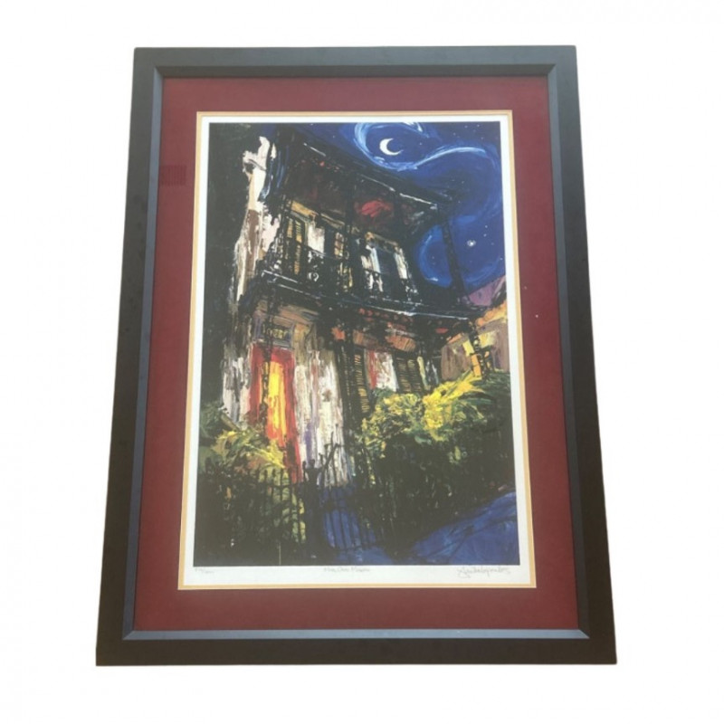 Size: approx. 41 × 30 in. A dramatic night scene by renowned New Orleans artist James Michalopoulos, known for his vibrant, distorted portrayals of the city’s architecture. Moon Over Miasma captures a French Quarter residence beneath a swirling indigo sky and crescent moon, rendered in his signature bold palette and expressive brushwork. Hand-signed lower right, titled in pencil lower center, and numbered 875/1001. Elegantly framed with deep red matting; artist bio mounted on verso. James Michalopoulos’ works are held in notable collections including the New Orleans Museum of Art and DaimlerChrysler Corporation, and are favored by collectors such as Bruce Willis, Sharon Stone, and Bonnie Raitt. He is also celebrated for his official New Orleans Jazz & Heritage Festival posters, several of which became record-breaking best sellers.About the Artist: