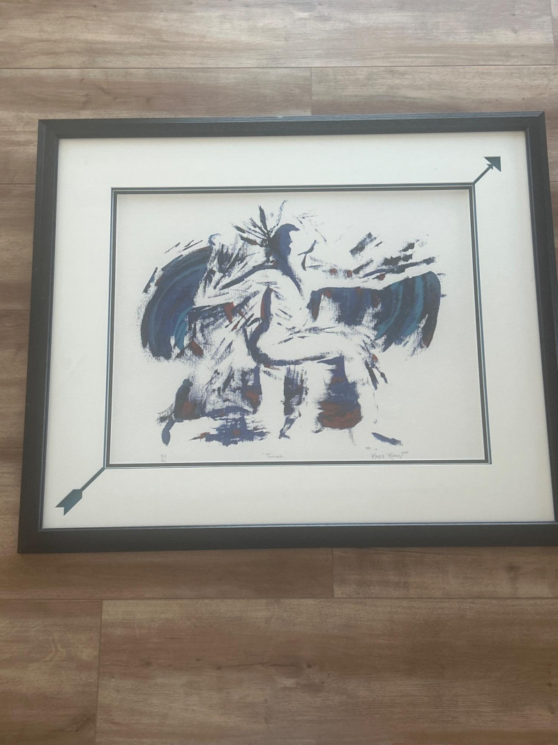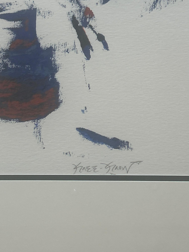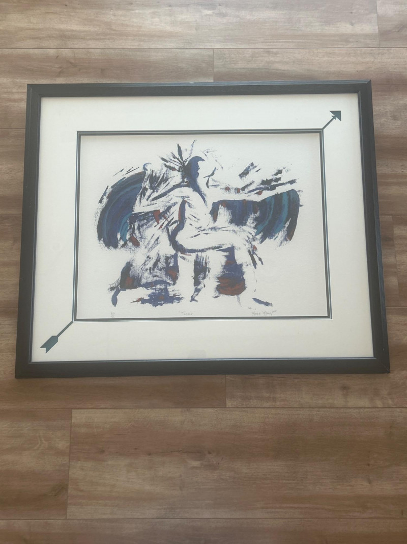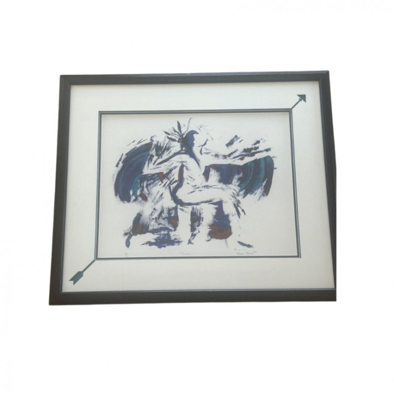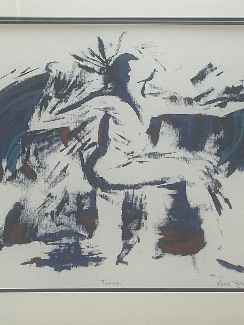 Title: Tanoah Artist: Knee Know (signed lower right) Medium: Limited edition serigraph (screenprint) on heavy wove paper Edition: 87/90 Size: Approx. 28" H × 34" W Striking limited edition serigraph by Knee Know, titled Tanoah. The composition features a dynamic Native American figure rendered in sweeping, gestural strokes of deep indigo and earthy crimson against a stark white ground. The abstracted form evokes both motion and spiritual resonance, with visual cues suggestive of ceremonial dance or ancestral presence. Signed in pencil by the artist at lower right, titled at center, and hand-numbered 87/90 at lower left. Knee Know is recognized for producing small-run, Native American–inspired prints during the late 20th century. His works often blend abstract expressionism with cultural motifs, and editions such as this—limited to just 90 impressions—are seldom encountered on the secondary market. A compelling acquisition for collectors of Indigenous-themed contemporary printmaking.Collecting Note: