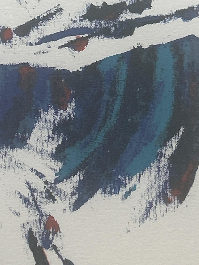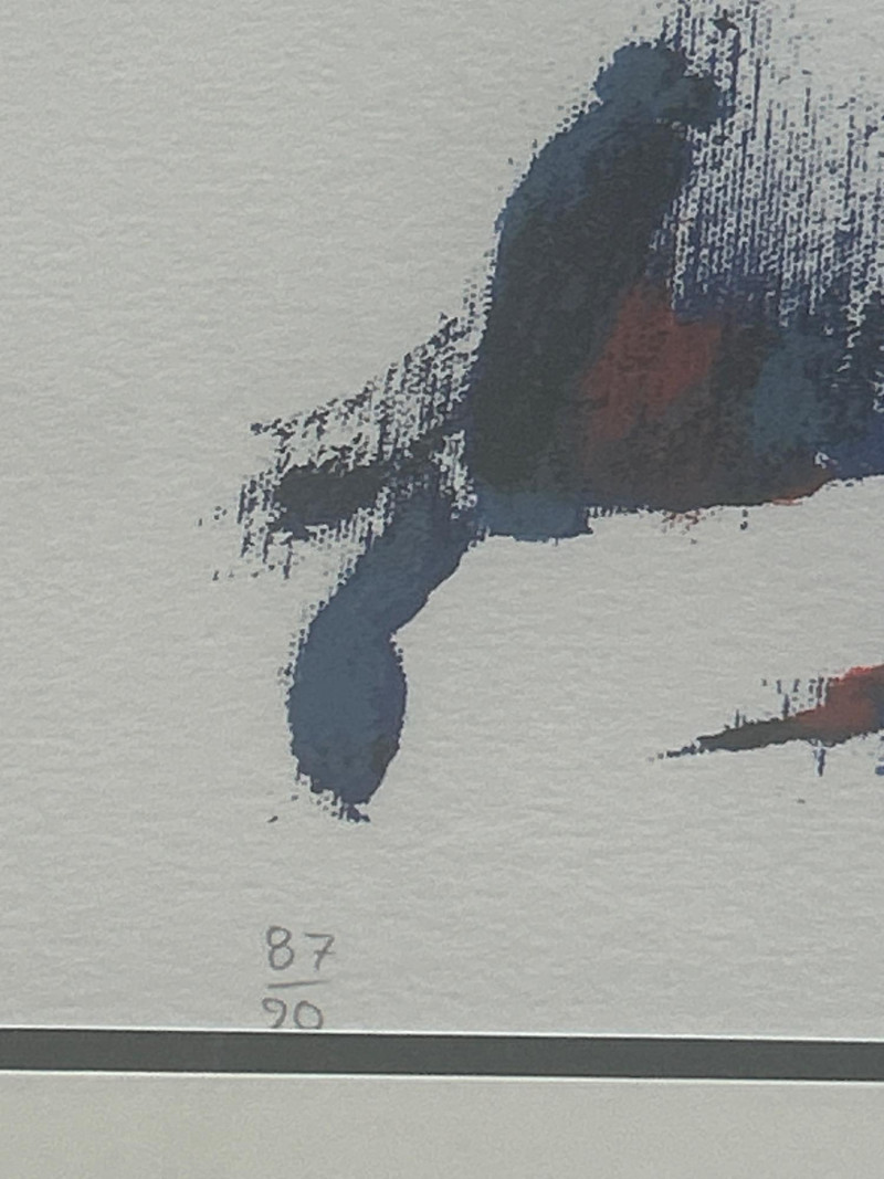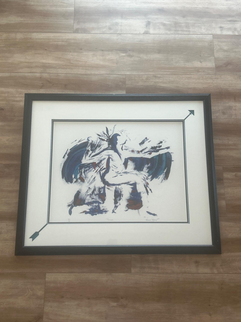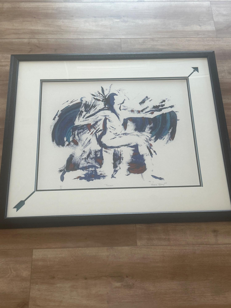Title: Tanoah Artist: Knee Know (signed lower right) Medium: Limited edition serigraph (screenprint) on heavy wove paper Edition: 87/90 Size: Approx. 28" H × 34" W Striking limited edition serigraph by Knee Know, titled Tanoah. The composition features a dynamic Native American figure rendered in sweeping, gestural strokes of deep indigo and earthy crimson against a stark white ground. The abstracted form evokes both motion and spiritual resonance, with visual cues suggestive of ceremonial dance or ancestral presence. Signed in pencil by the artist at lower right, titled at center, and hand-numbered 87/90 at lower left. Knee Know is recognized for producing small-run, Native American–inspired prints during the late 20th century. His works often blend abstract expressionism with cultural motifs, and editions such as this—limited to just 90 impressions—are seldom encountered on the secondary market. A compelling acquisition for collectors of Indigenous-themed contemporary printmaking.Collecting Note: