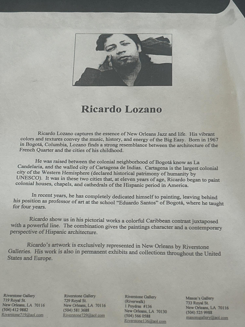 Ricardo Lozano is a Colombian-born artist renowned for his vibrant portrayals of New Orleans jazz culture. A former art professor in Bogotá, his work has been exhibited across the U.S. and Europe. Represented by Riverstone Gallery in New Orleans, Lozano blends Caribbean color sensibilities with Hispanic architectural motifs, creating pieces that resonate with rhythm and heritage. Collecting Note:
