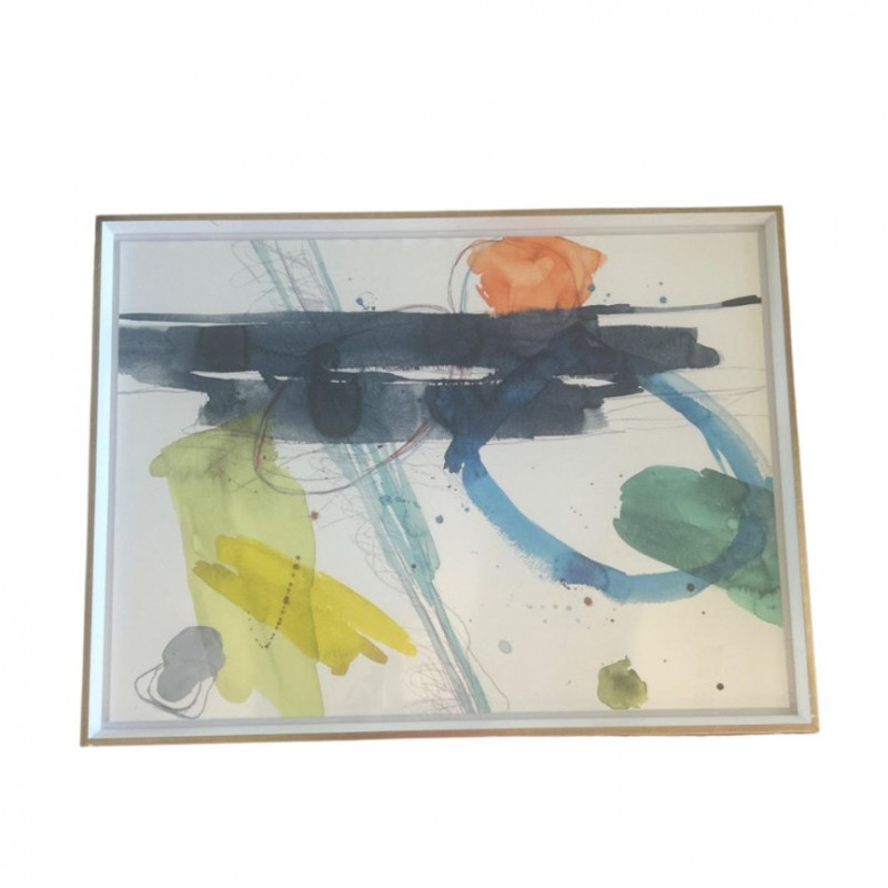 Notes: Unsigned; likely a contemporary decorative work, acquired circa 2020 A striking contemporary abstract rendered in mixed media, this large-format composition features fluid washes of deep indigo, sky blue, citrus yellow, and moss green, punctuated by spontaneous splashes of orange and delicate graphite linework. The interplay of layered transparency and expressive brushstrokes evokes a sense of motion and depth, while the dripped accents lend a raw, organic energy. Float-mounted for a clean, gallery-style presentation, this piece offers a bold yet airy aesthetic ideal for modern interiors.