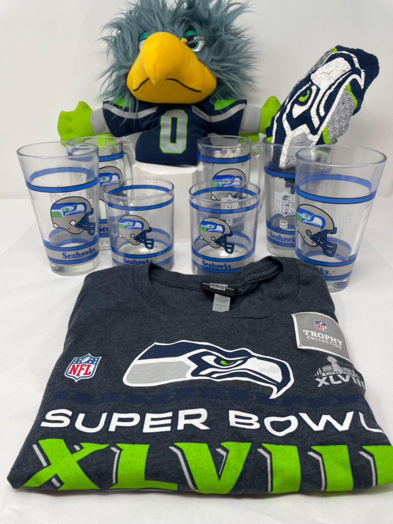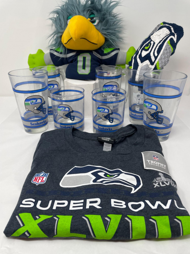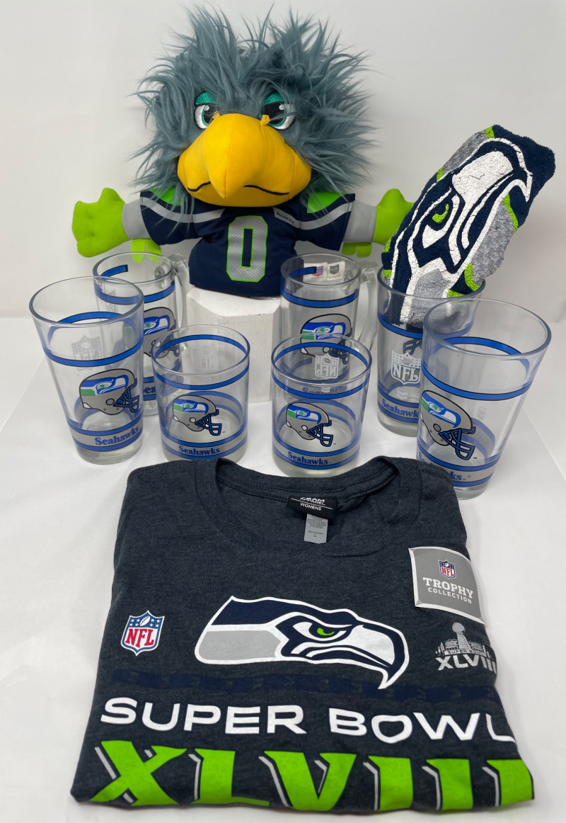 Lot # 166 - Seahawks drinking Glasses, Blitz Puppet and Women's Shirt