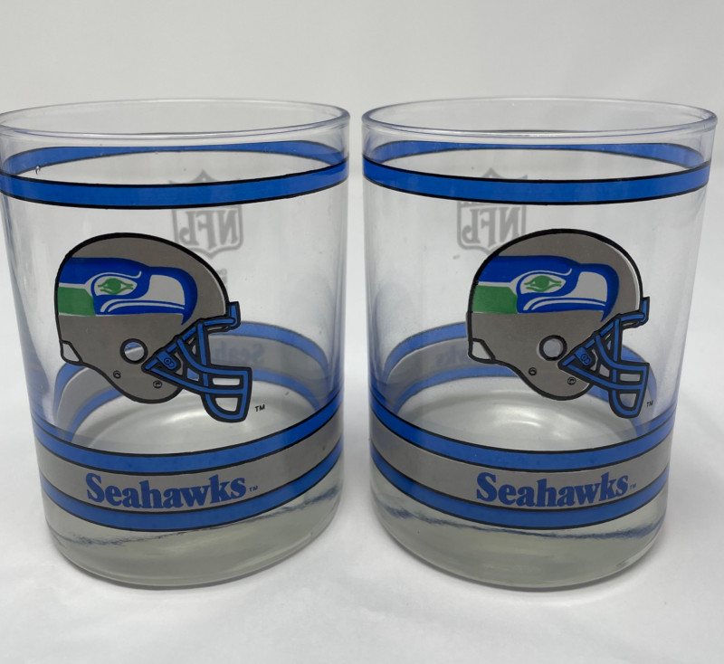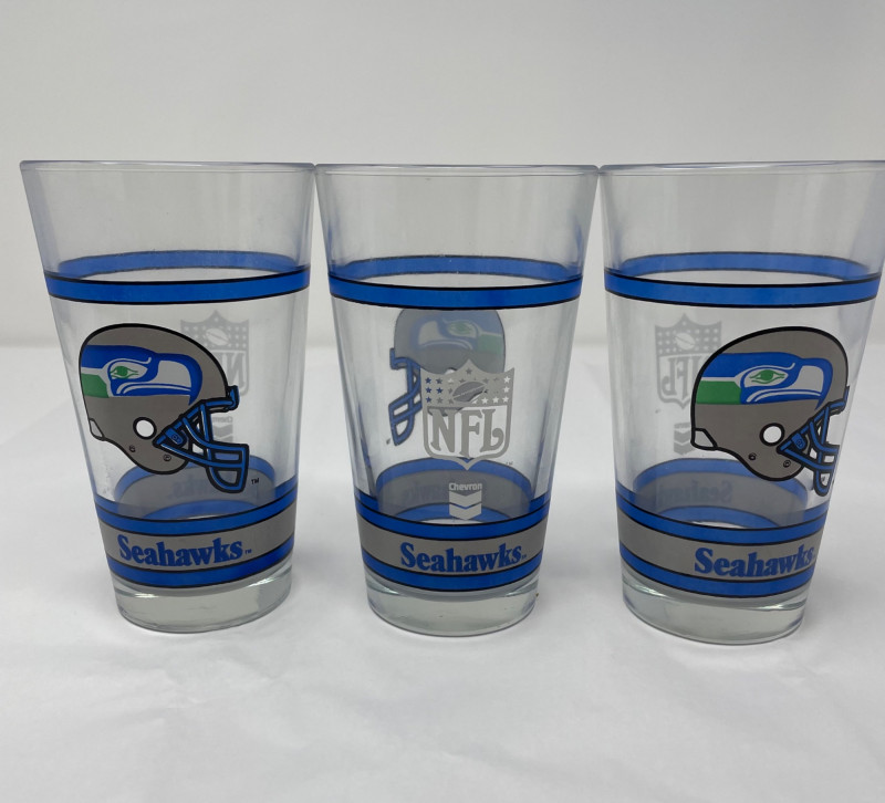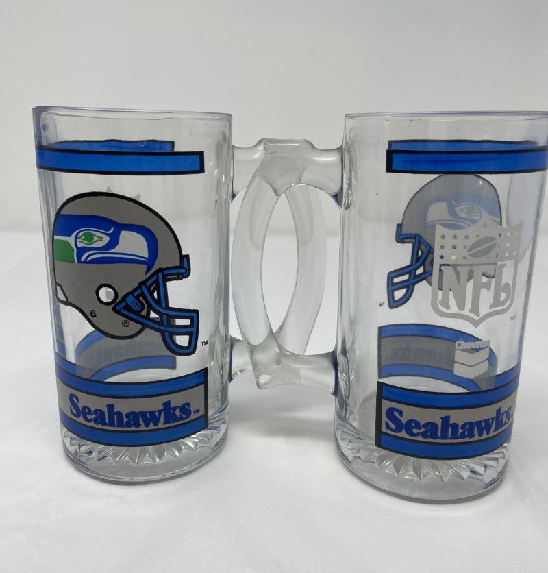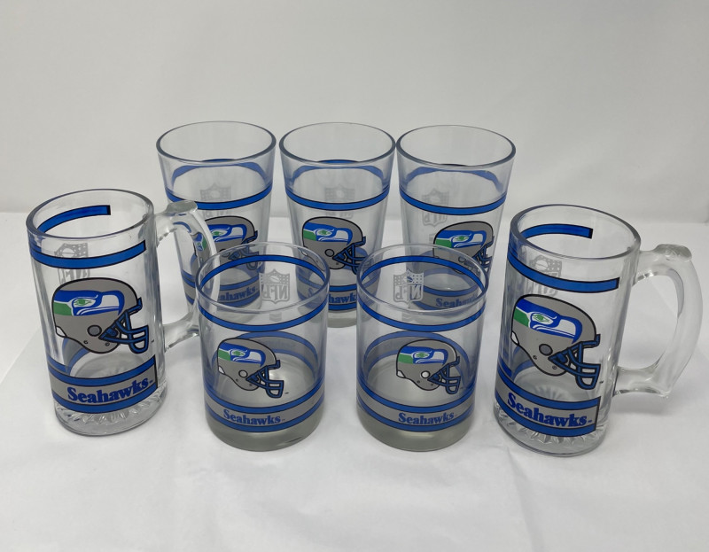 Seattle Seahawks fan collection with several themed items: Set of Drinking Glasses Blitz Puppet (Team Mascot) Women’s T-Shirt Additional Item Two Tumbler Glasses Three Pint Glasses Two Beer Steins Blitz Hand Puppet One Small Hand TowelItems Included