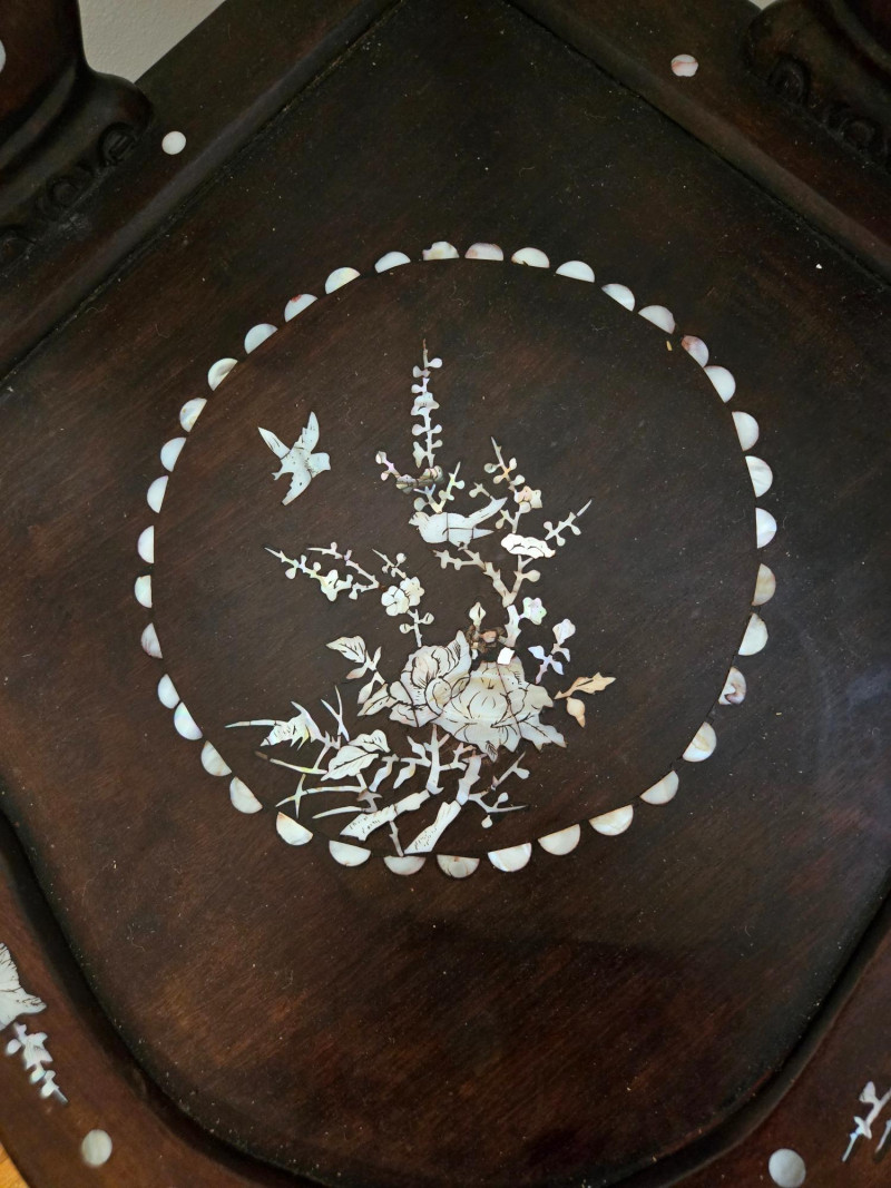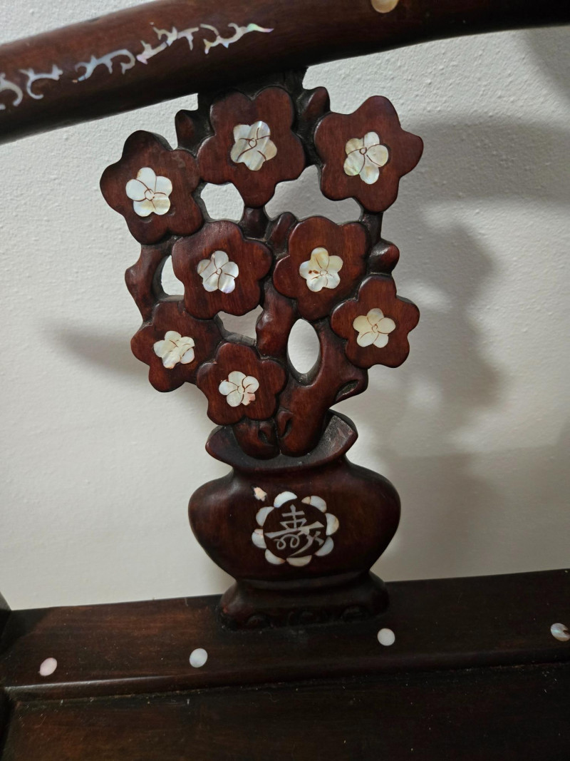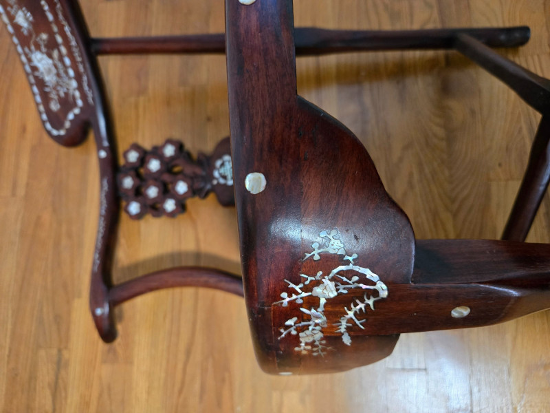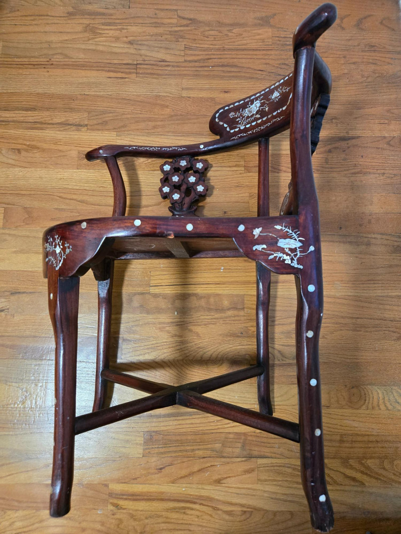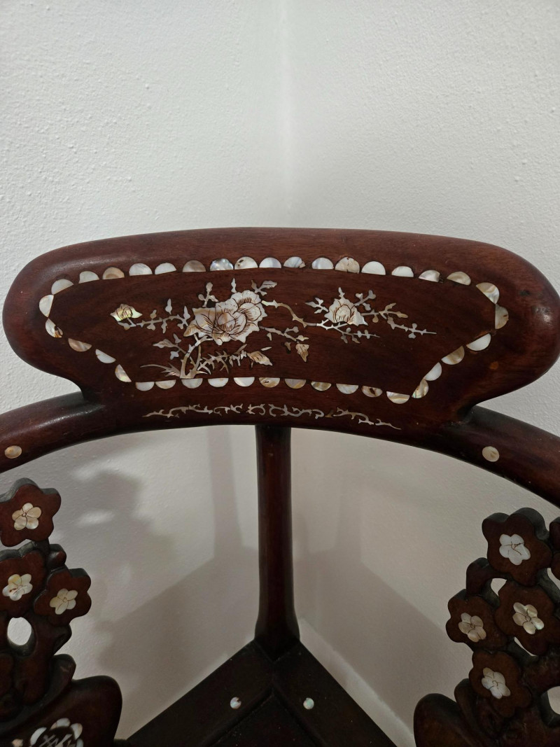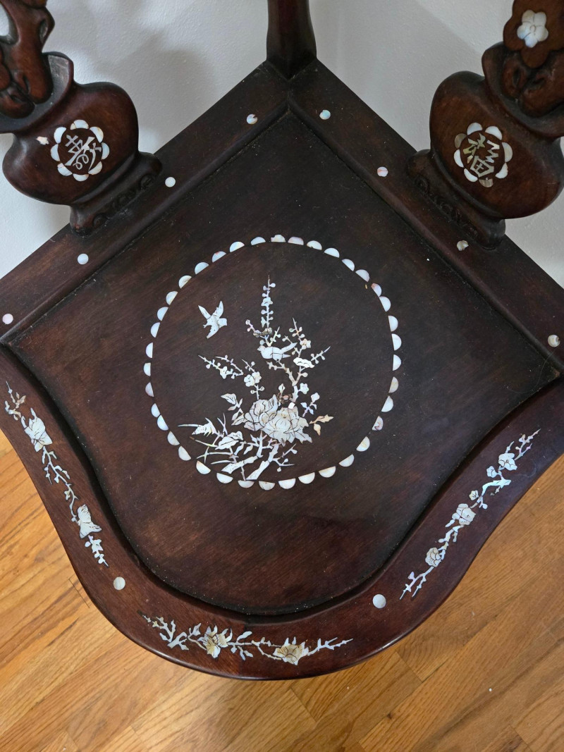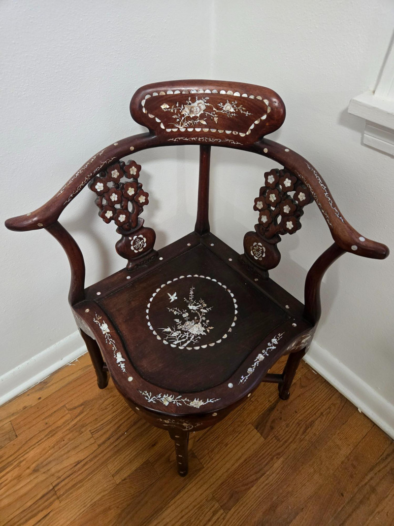 A vintage Chinese corner chair, masterfully constructed from dark hardwood and adorned with intricate mother-of-pearl inlay. The chair features a curved backrest and armrests, with floral carvings and decorative motifs that echo traditional Chinese artistry. The seat panel showcases a circular inlay with a bird and floral design, while additional inlays embellish the legs and edges. Its compact, angular form makes it ideal for corner placement, blending elegance with spatial efficiency.Item Description: