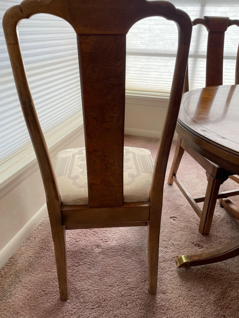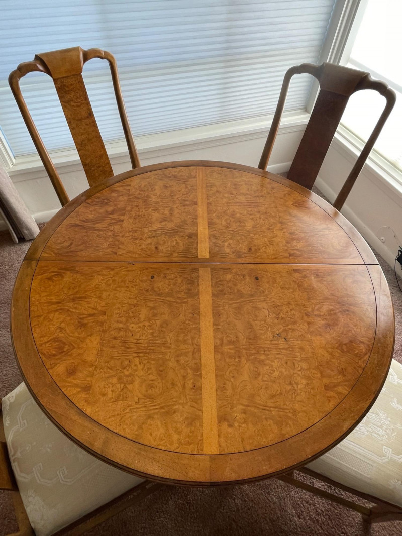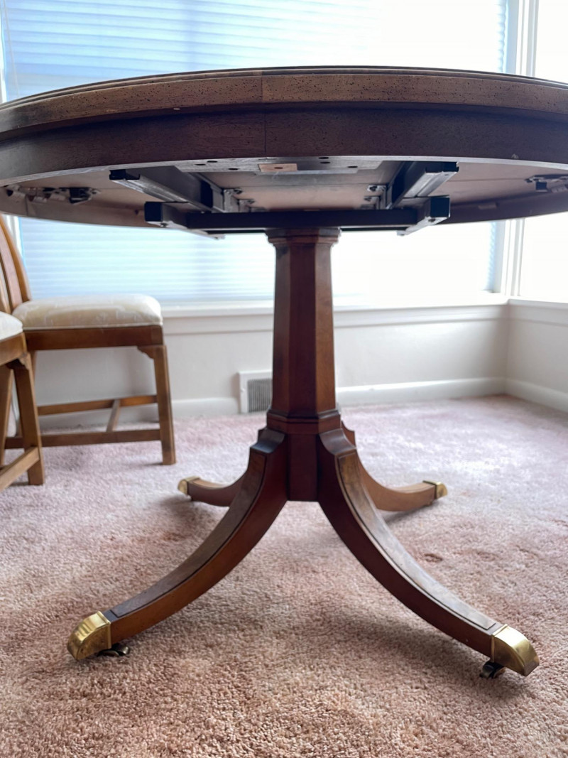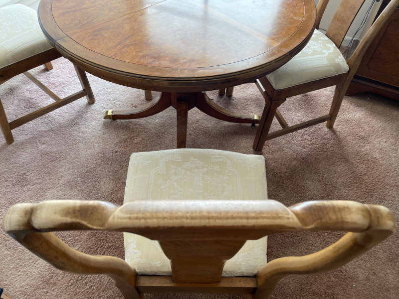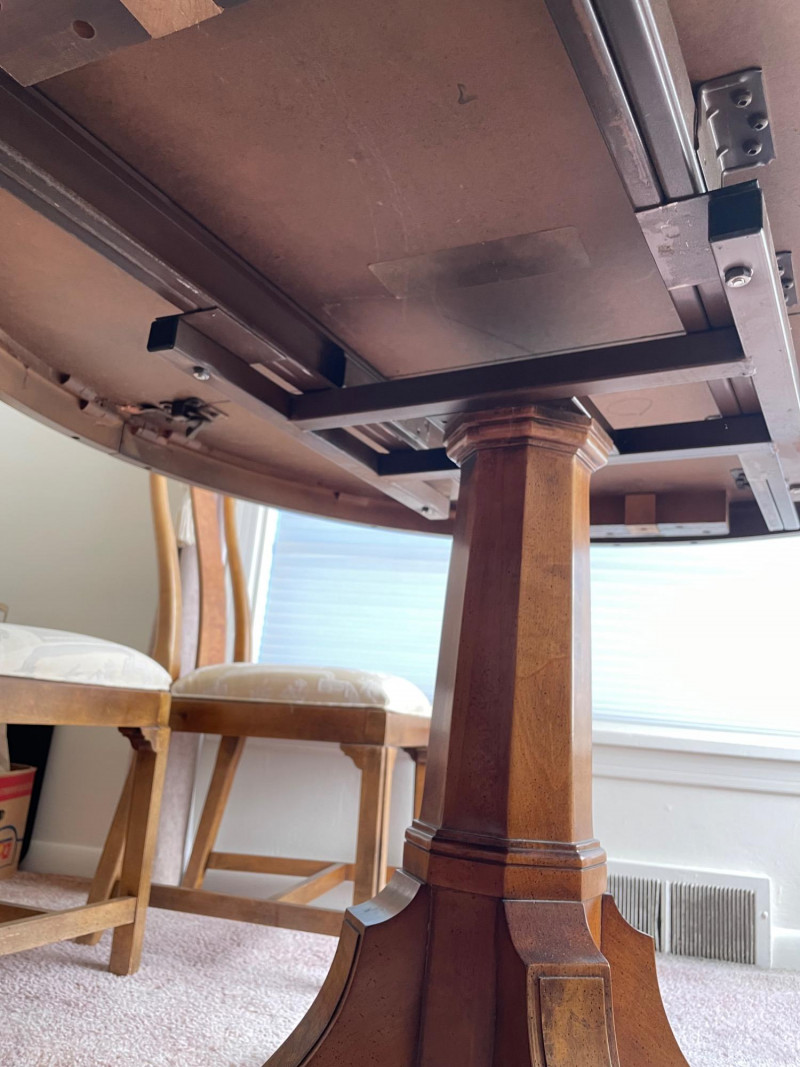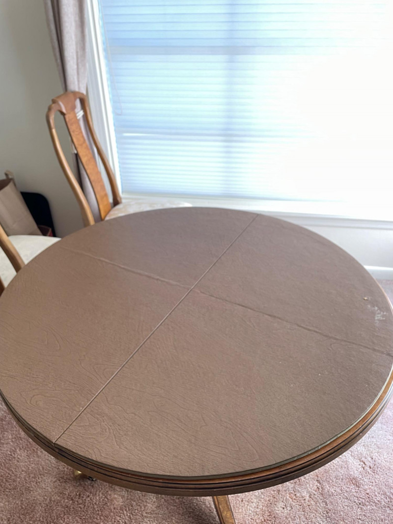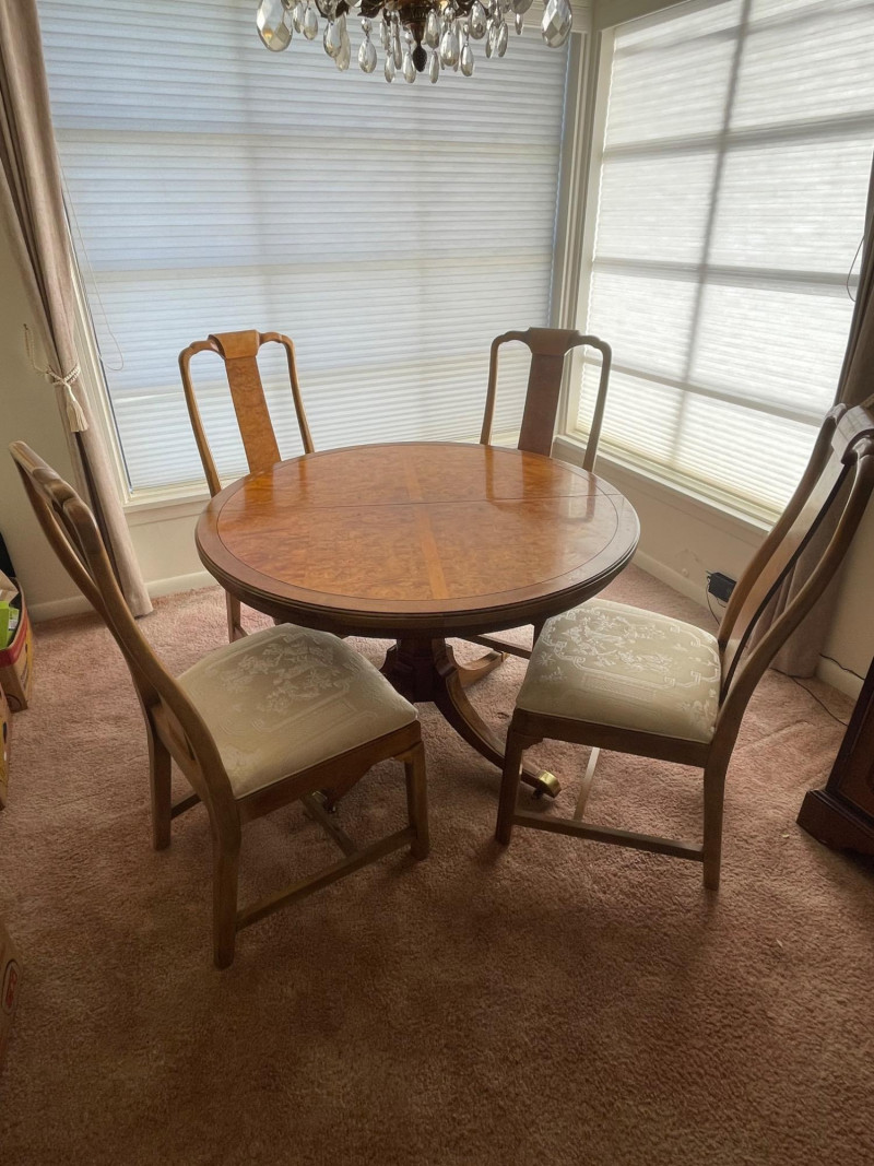 42” Round Table with some wear, tabletop lose may need tightening/fixing. 4 chairs with wear, see pictures. Chair size 41 1/2 “high and seat are 17 1/2 x 18” Table Leaf Adds 20” also includes table pad Cozy dining area featuring: Dining Table: Chairs: Bonus: Includes a custom table pad for added protection and preservation. ON THESE PIECES, PLEASE BRING STRONG HELP, THERE WILL BE NO ONE HERE TO HELP YOU.Main Elements