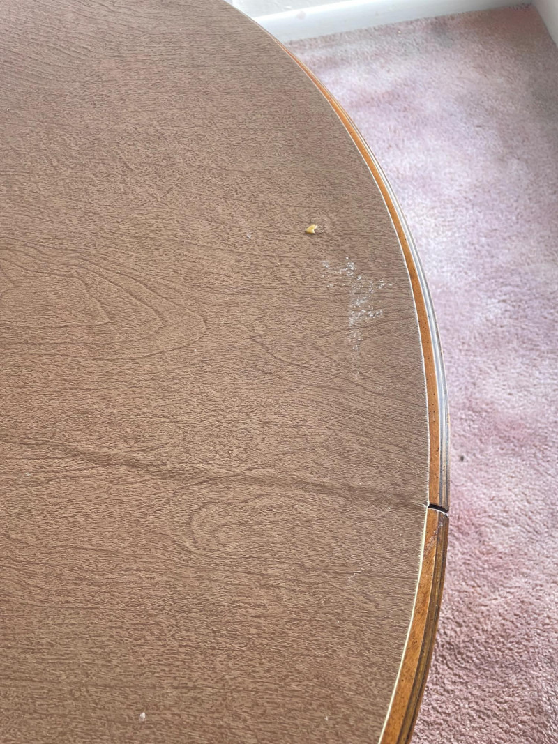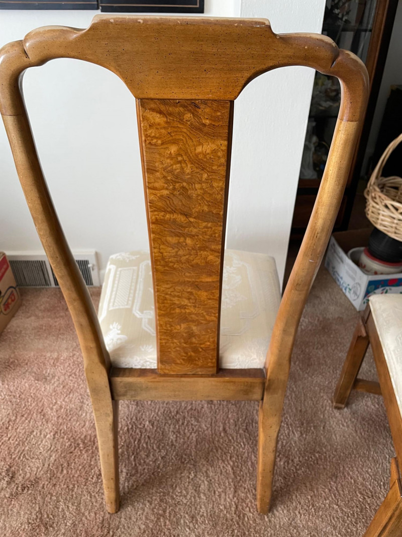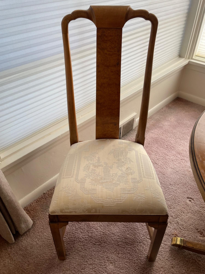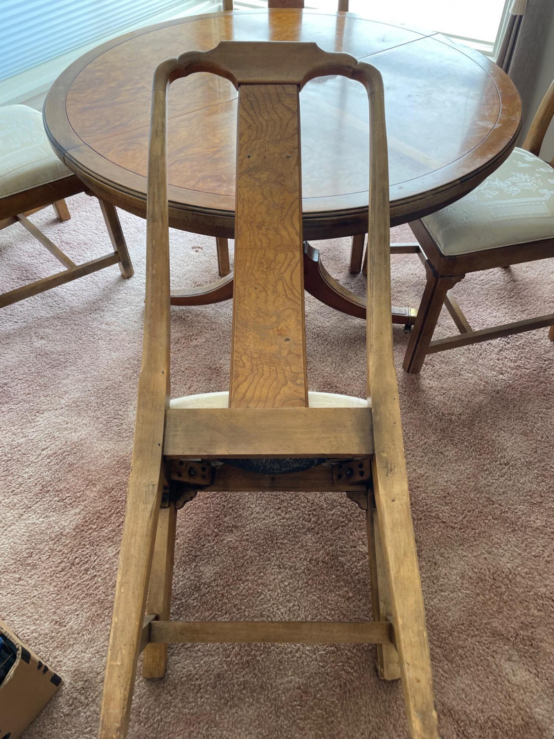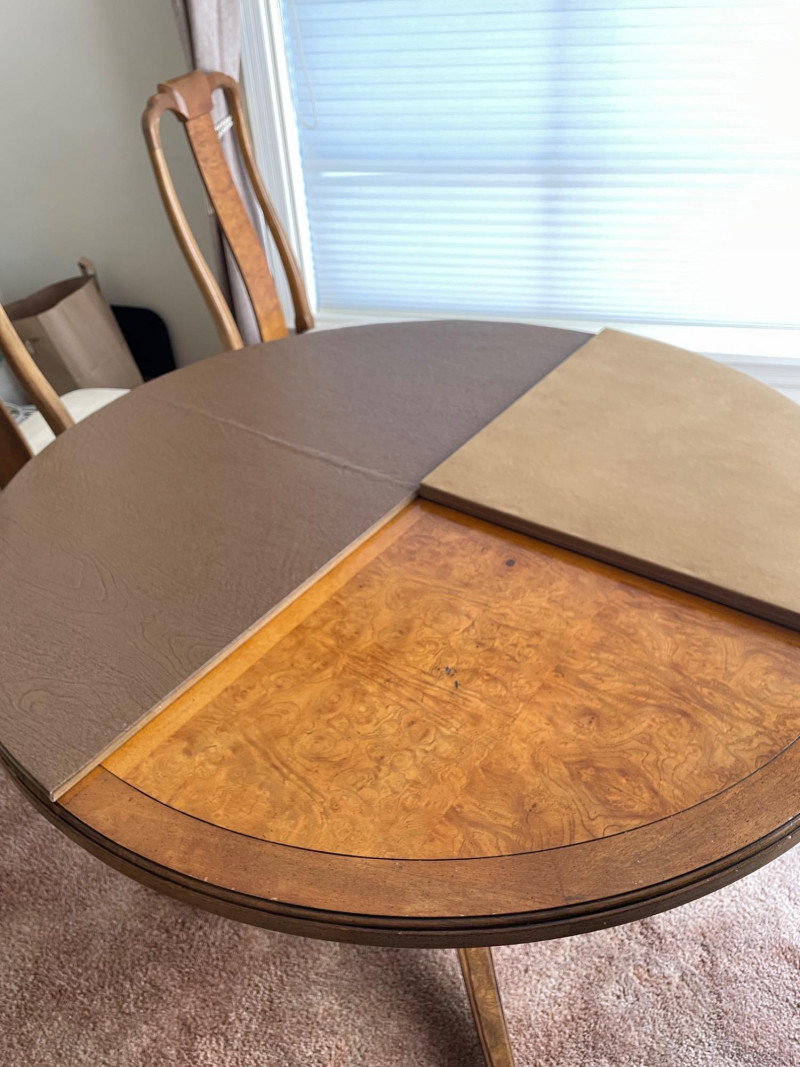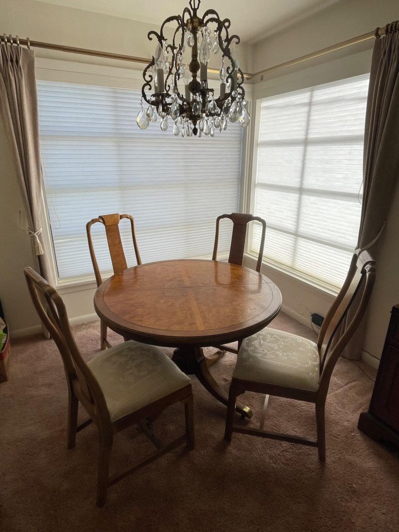 42” Round Table with some wear, tabletop lose may need tightening/fixing. 4 chairs with wear, see pictures. Chair size 41 1/2 “high and seat are 17 1/2 x 18” Table Leaf Adds 20” also includes table pad Cozy dining area featuring: Dining Table: Chairs: Bonus: Includes a custom table pad for added protection and preservation. ON THESE PIECES, PLEASE BRING STRONG HELP, THERE WILL BE NO ONE HERE TO HELP YOU.Main Elements