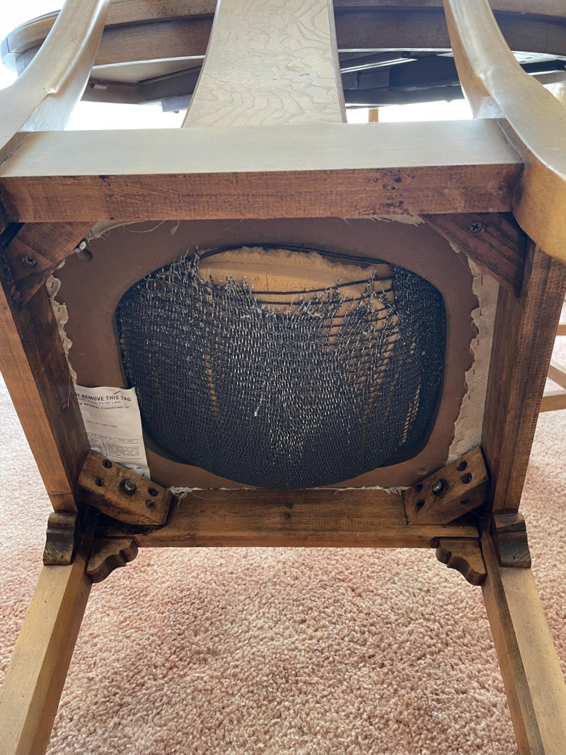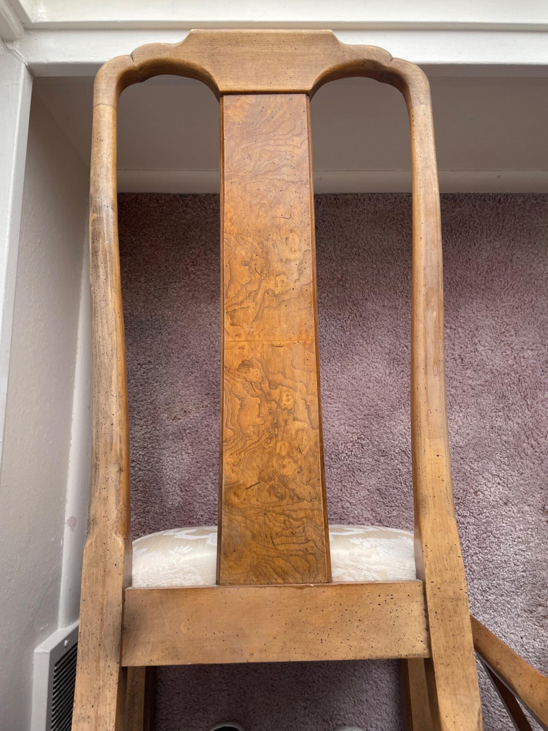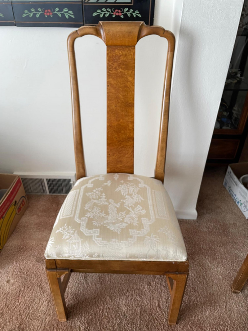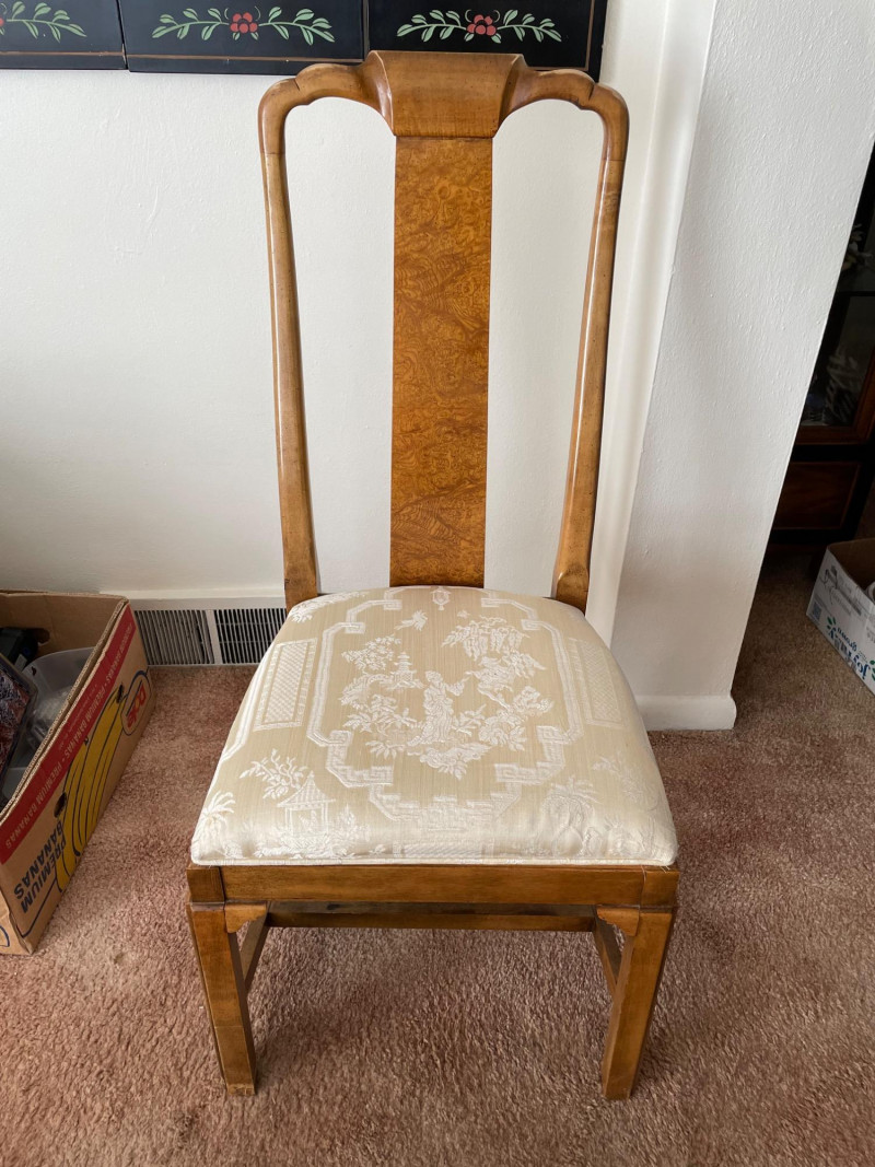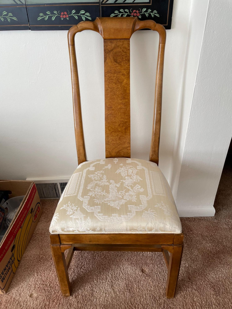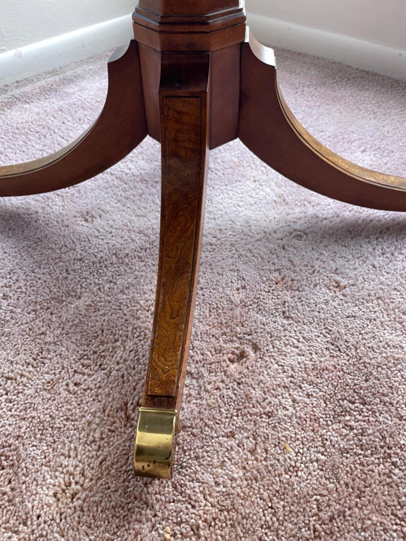 42” Round Table with some wear, tabletop lose may need tightening/fixing. 4 chairs with wear, see pictures. Chair size 41 1/2 “high and seat are 17 1/2 x 18” Table Leaf Adds 20” also includes table pad Cozy dining area featuring: Dining Table: Chairs: Bonus: Includes a custom table pad for added protection and preservation. ON THESE PIECES, PLEASE BRING STRONG HELP, THERE WILL BE NO ONE HERE TO HELP YOU.Main Elements