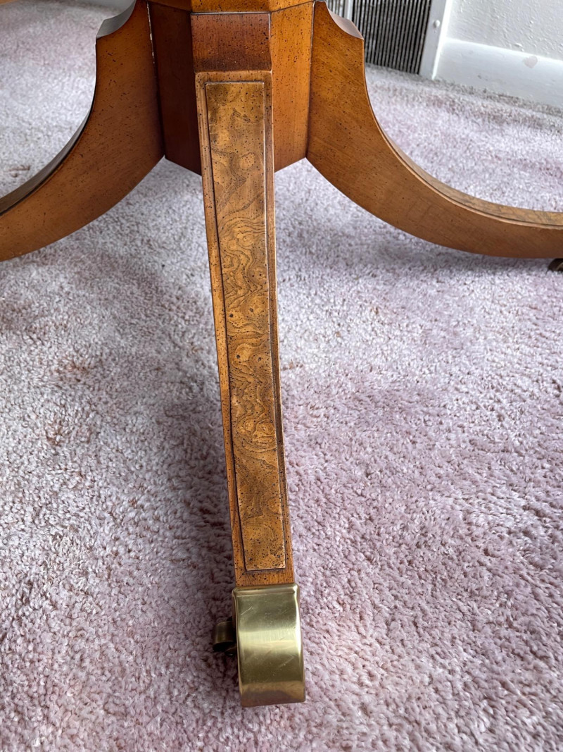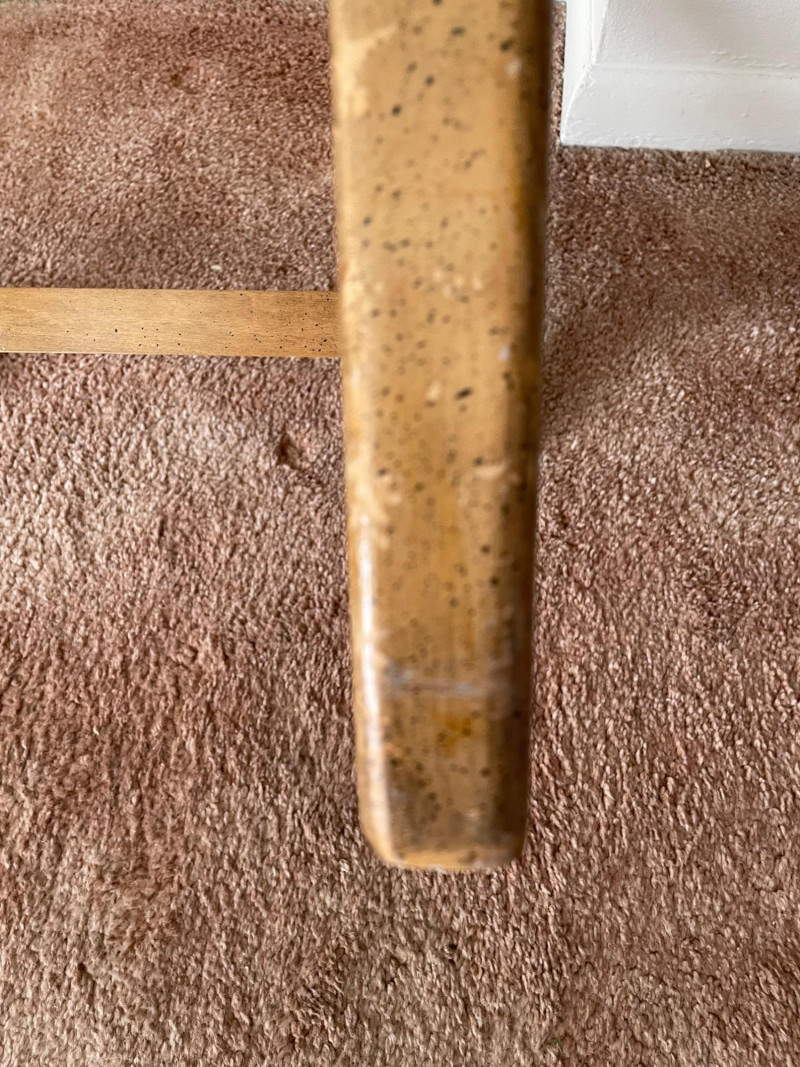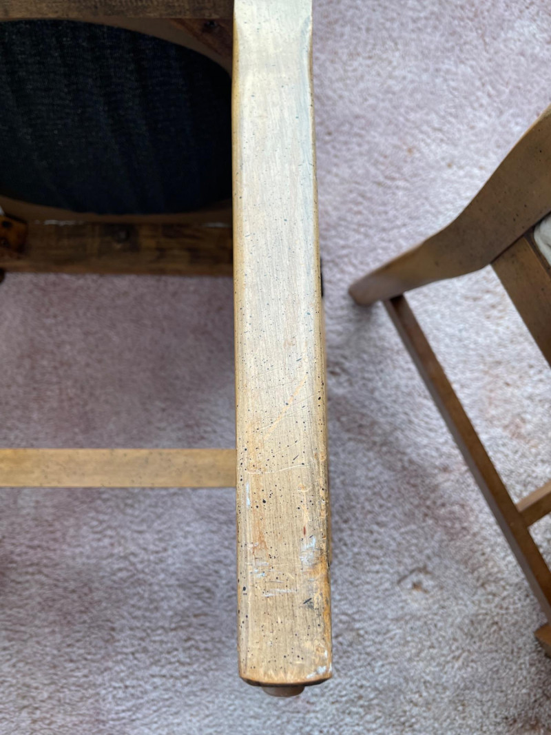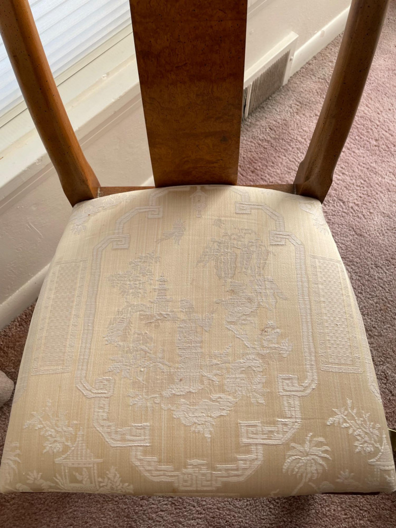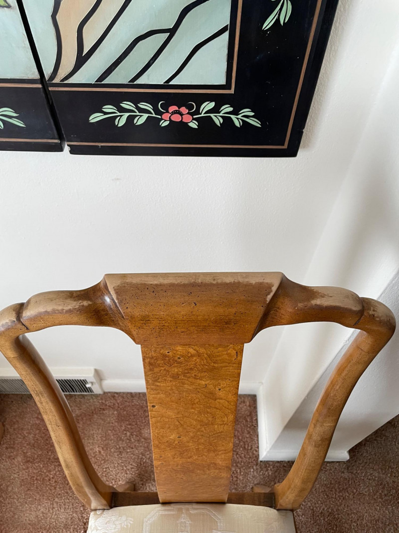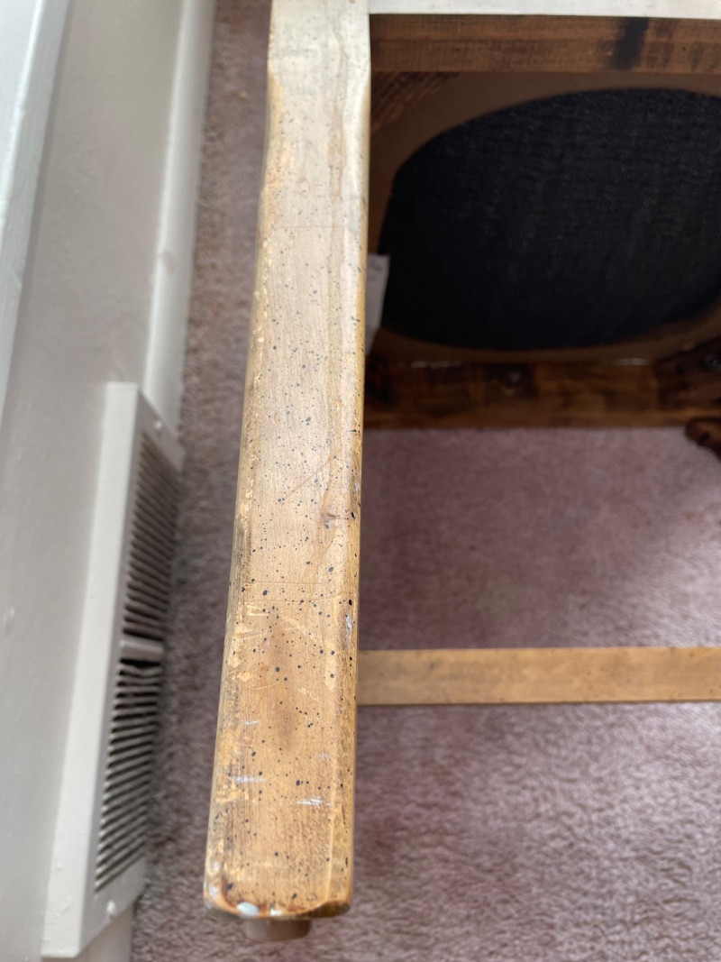 42” Round Table with some wear, tabletop lose may need tightening/fixing. 4 chairs with wear, see pictures. Chair size 41 1/2 “high and seat are 17 1/2 x 18” Table Leaf Adds 20” also includes table pad Cozy dining area featuring: Dining Table: Chairs: Bonus: Includes a custom table pad for added protection and preservation. ON THESE PIECES, PLEASE BRING STRONG HELP, THERE WILL BE NO ONE HERE TO HELP YOU.Main Elements