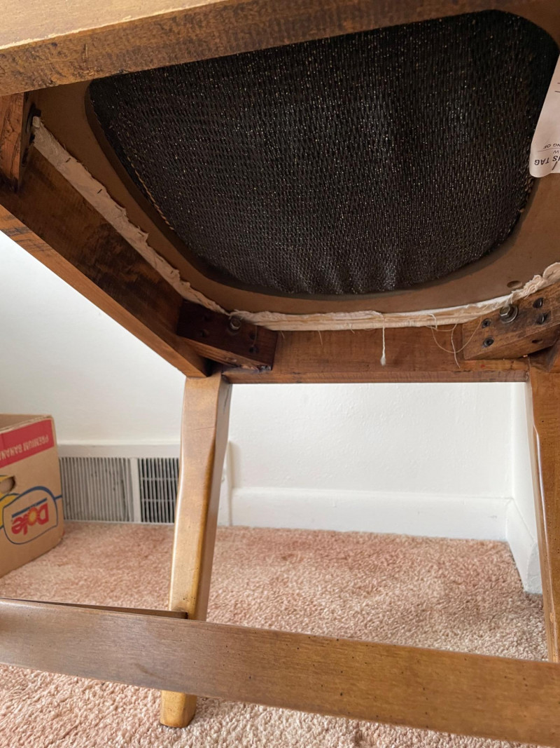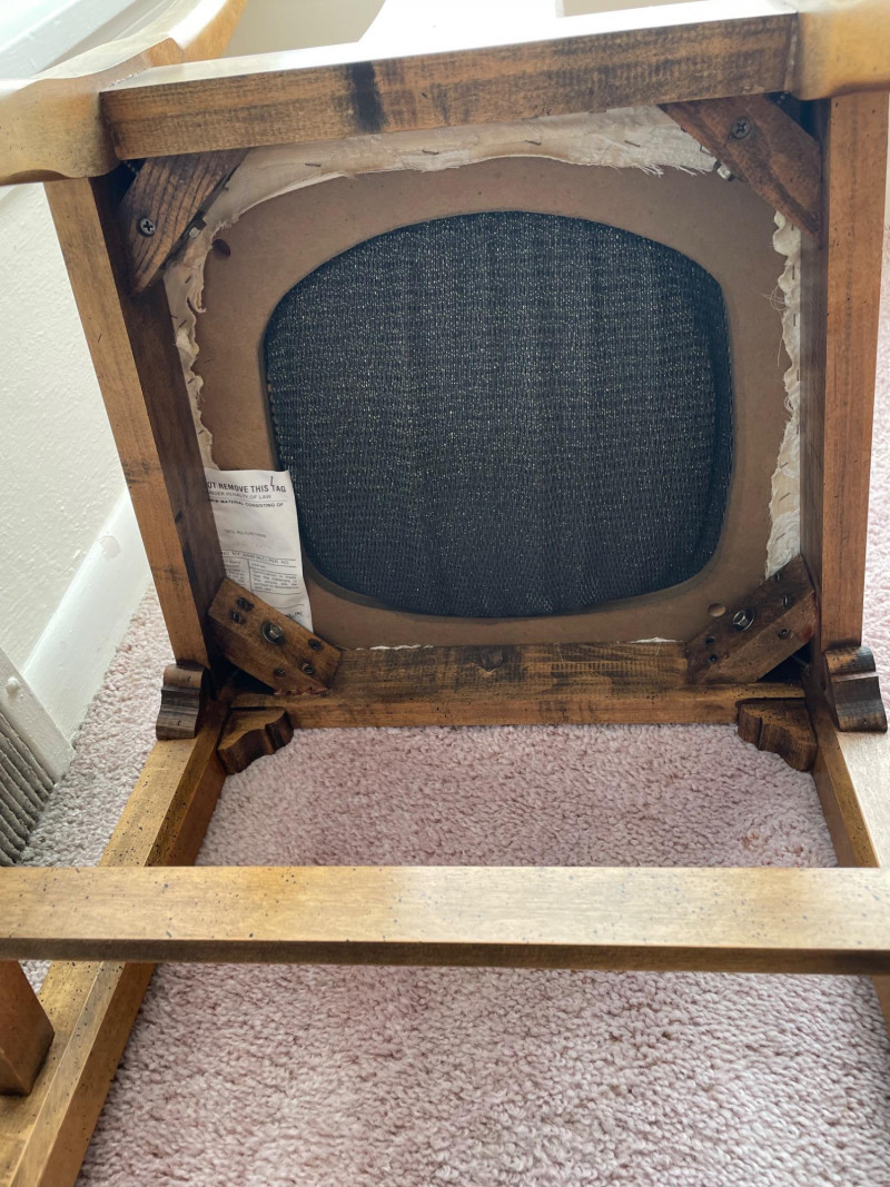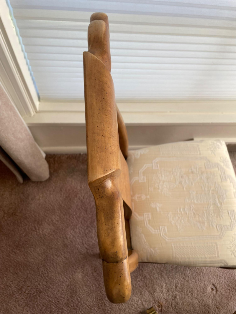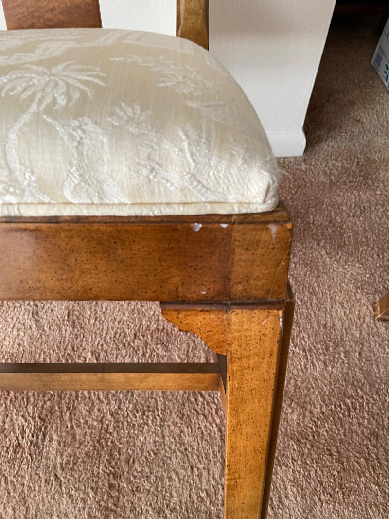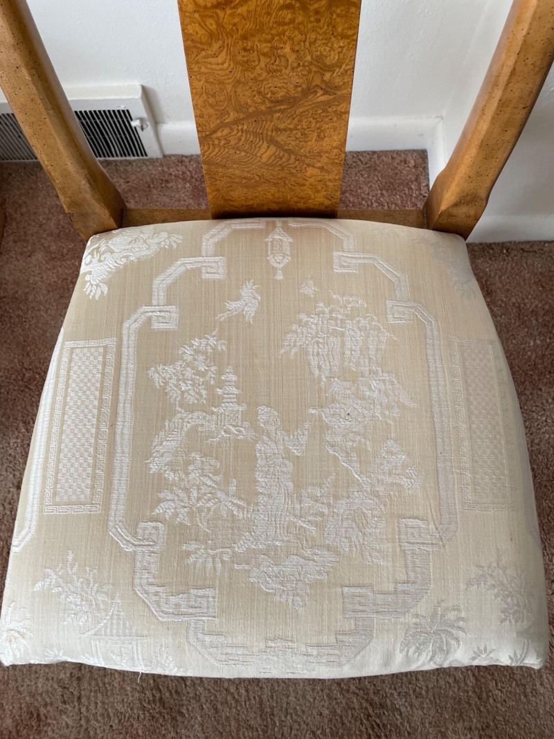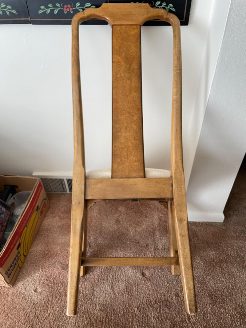 42” Round Table with some wear, tabletop lose may need tightening/fixing. 4 chairs with wear, see pictures. Chair size 41 1/2 “high and seat are 17 1/2 x 18” Table Leaf Adds 20” also includes table pad Cozy dining area featuring: Dining Table: Chairs: Bonus: Includes a custom table pad for added protection and preservation. ON THESE PIECES, PLEASE BRING STRONG HELP, THERE WILL BE NO ONE HERE TO HELP YOU.Main Elements