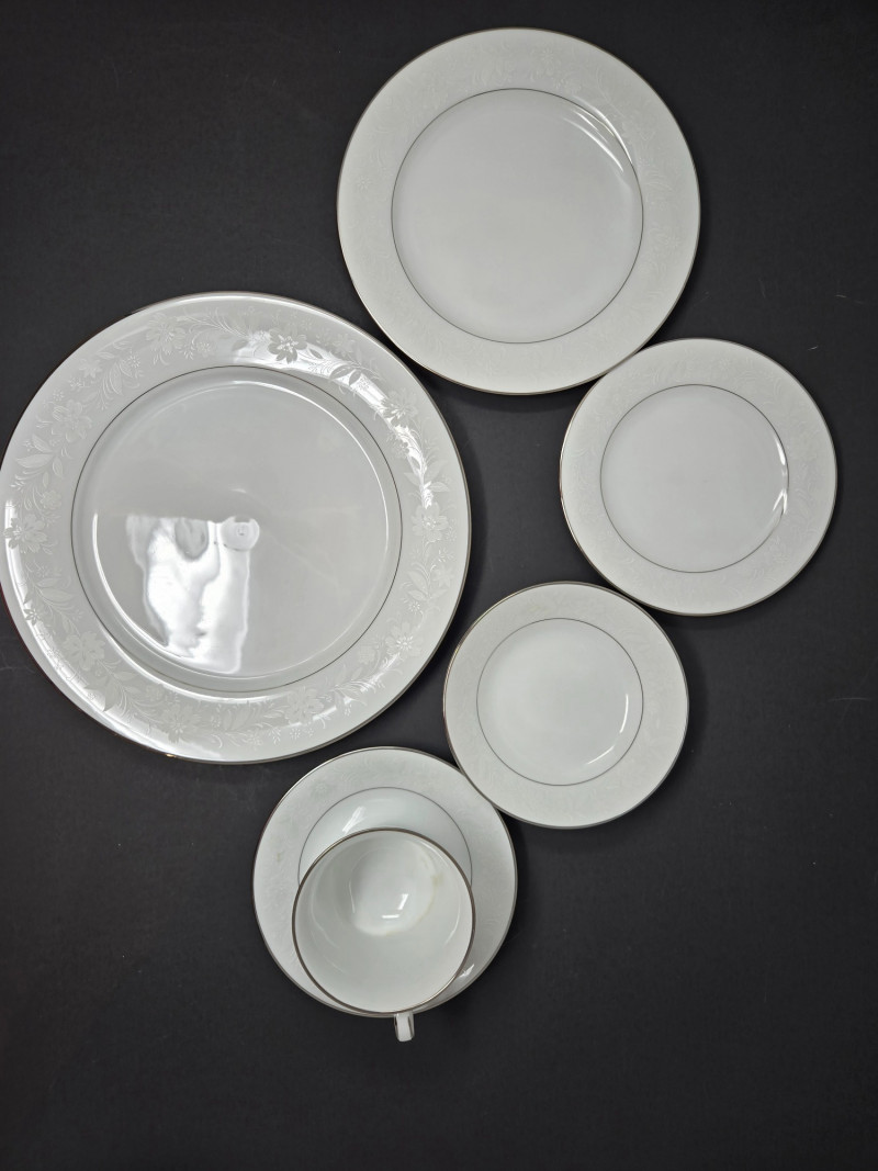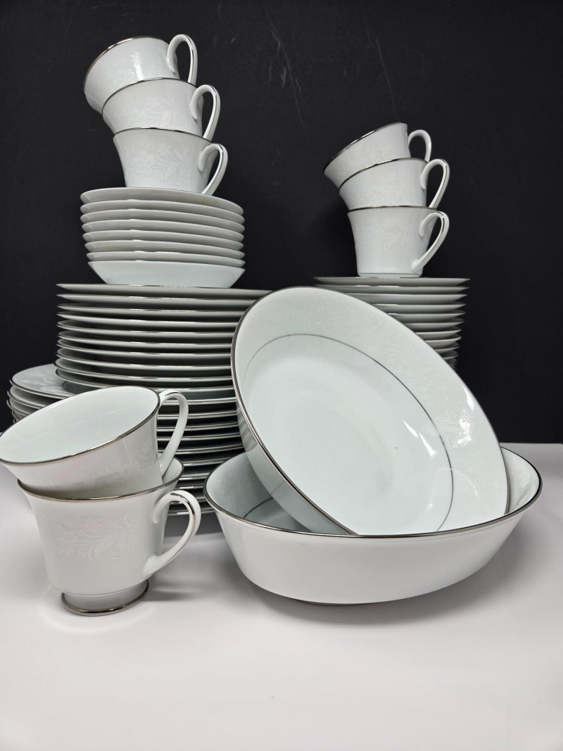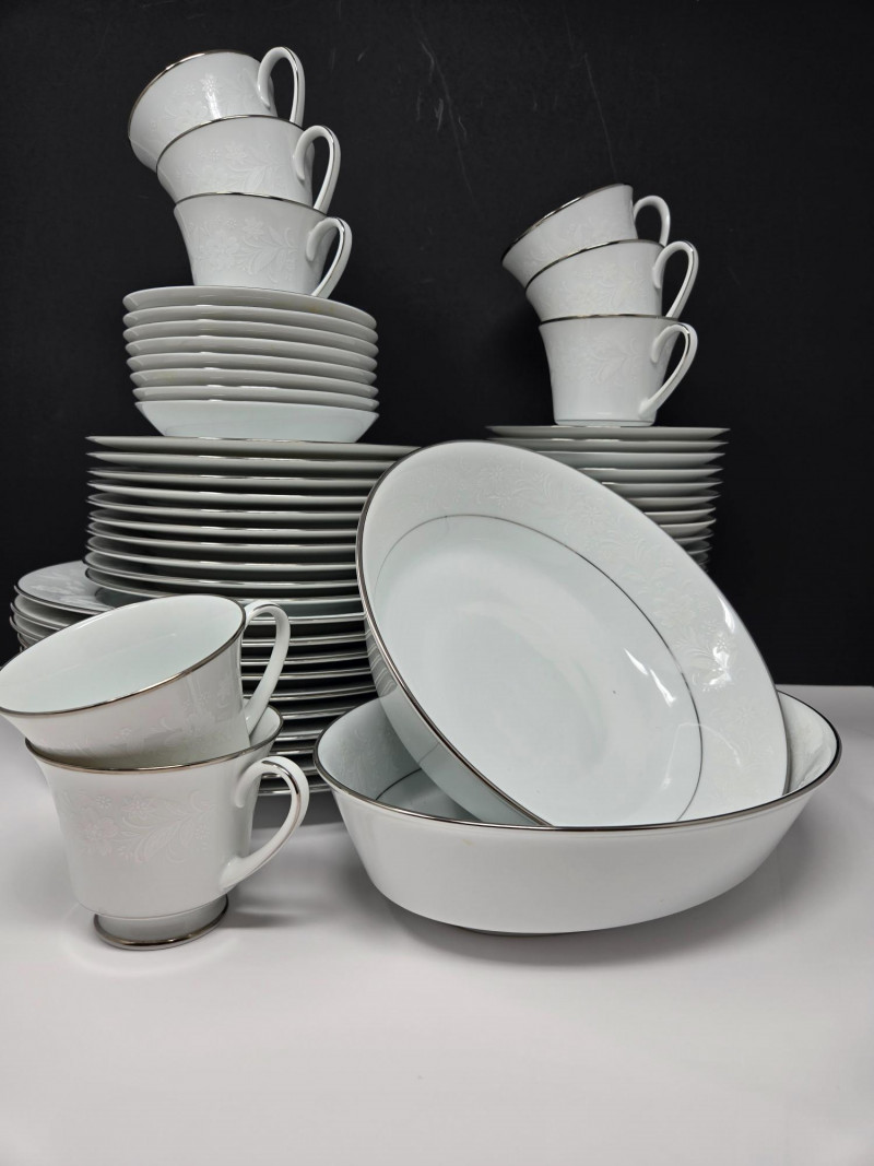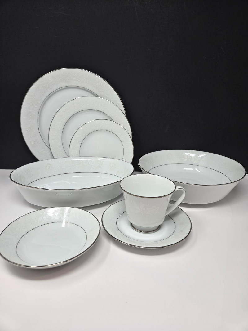 Elegant Noritake 6909 Ranier White fine china set featuring a classic white design with subtle floral embossing and platinum trim. This timeless pattern adds sophistication to any dining occasion. Includes (56 pieces): 10 Dinner Plates 10 Salad/Dessert Plates 10 Bread & Butter Plates 8 Cups & 10 Saucers 2 Serving Bowls / Platters Pattern: Noritake 6909 Ranier White Material: Fine China with Platinum Trim Condition: Excellent vintage condition with minimal signs of use Era: Discontinued patternNoritake 6909 “Ranier White” China – 56-Piece Set