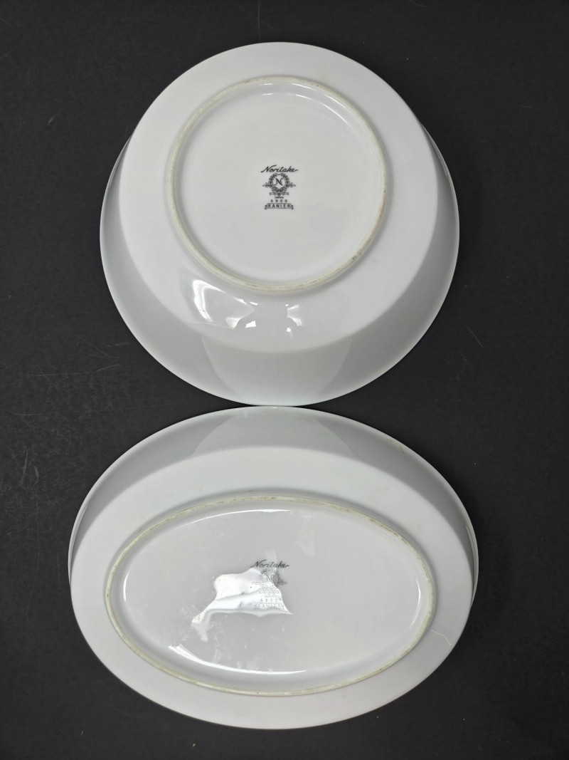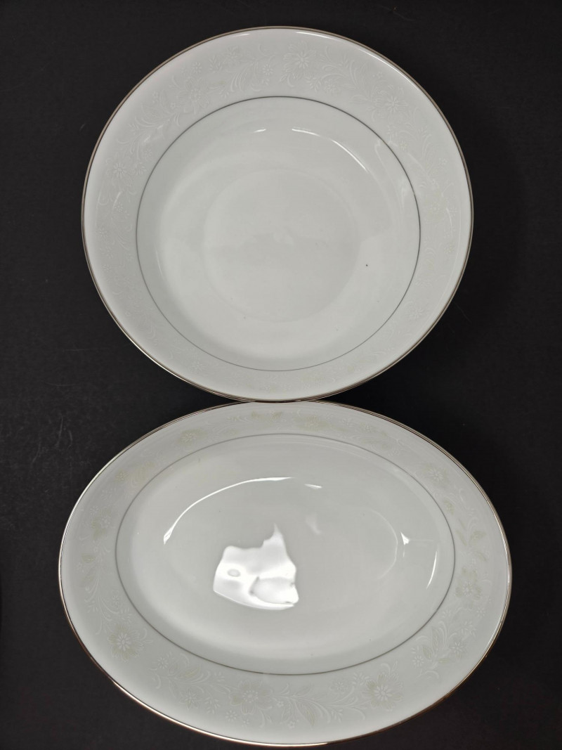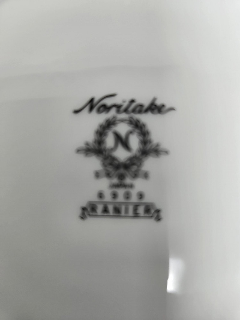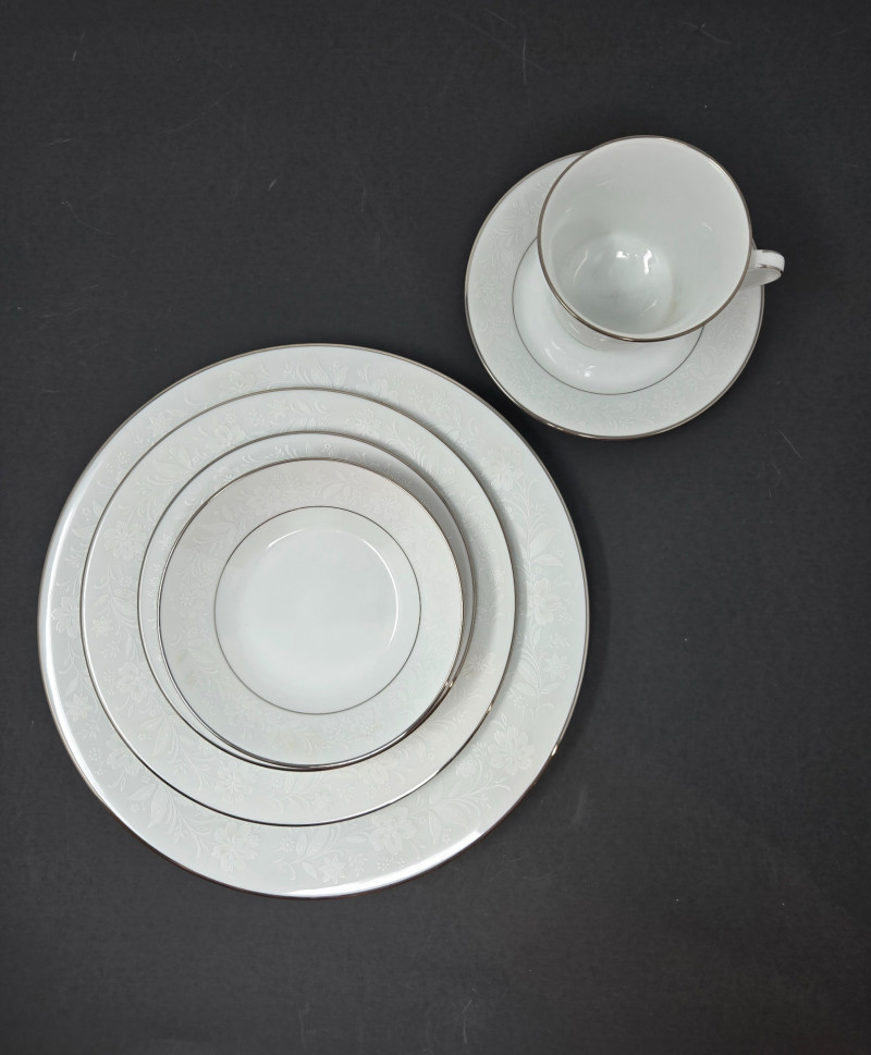 Elegant Noritake 6909 Ranier White fine china set featuring a classic white design with subtle floral embossing and platinum trim. This timeless pattern adds sophistication to any dining occasion. Includes (56 pieces): 10 Dinner Plates 10 Salad/Dessert Plates 10 Bread & Butter Plates 8 Cups & 10 Saucers 2 Serving Bowls / Platters Pattern: Noritake 6909 Ranier White Material: Fine China with Platinum Trim Condition: Excellent vintage condition with minimal signs of use Era: Discontinued patternNoritake 6909 “Ranier White” China – 56-Piece Set