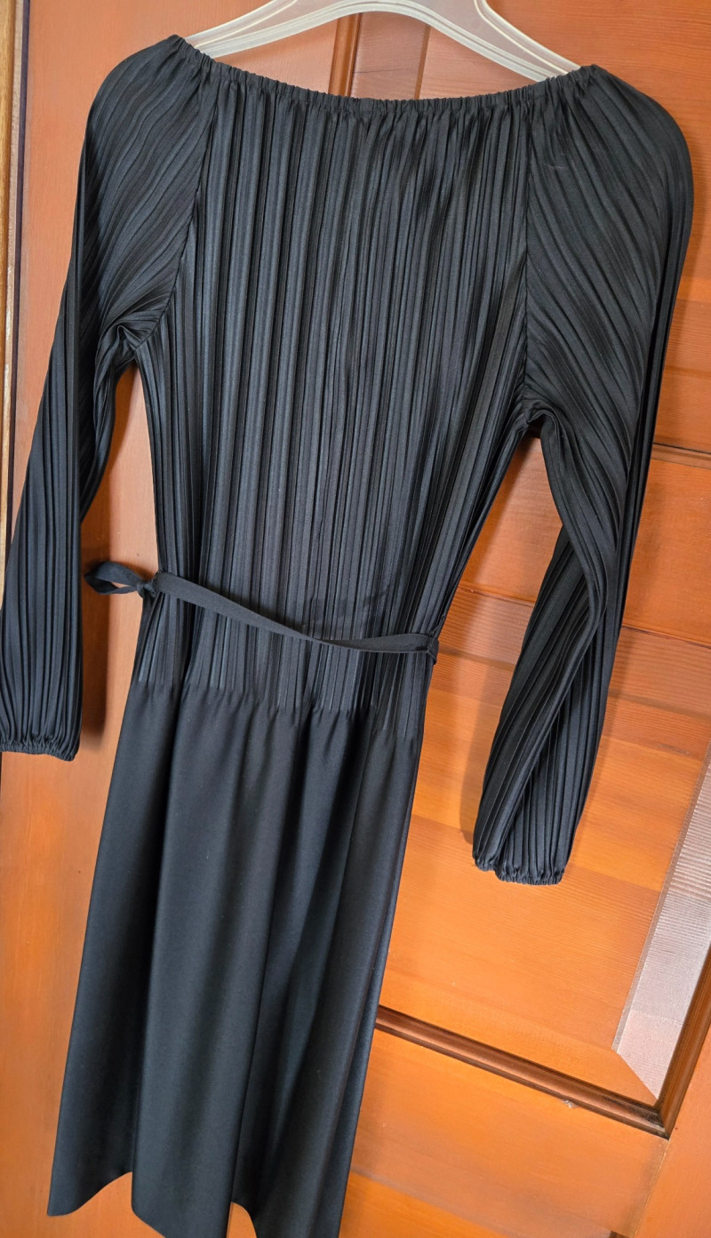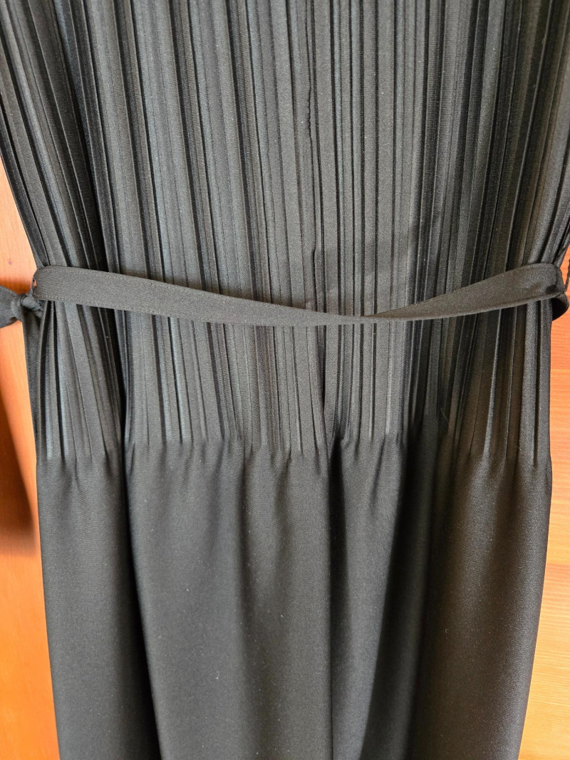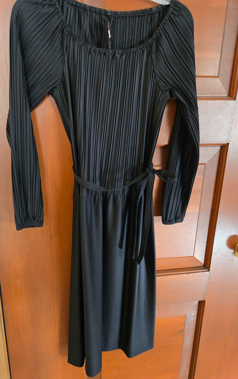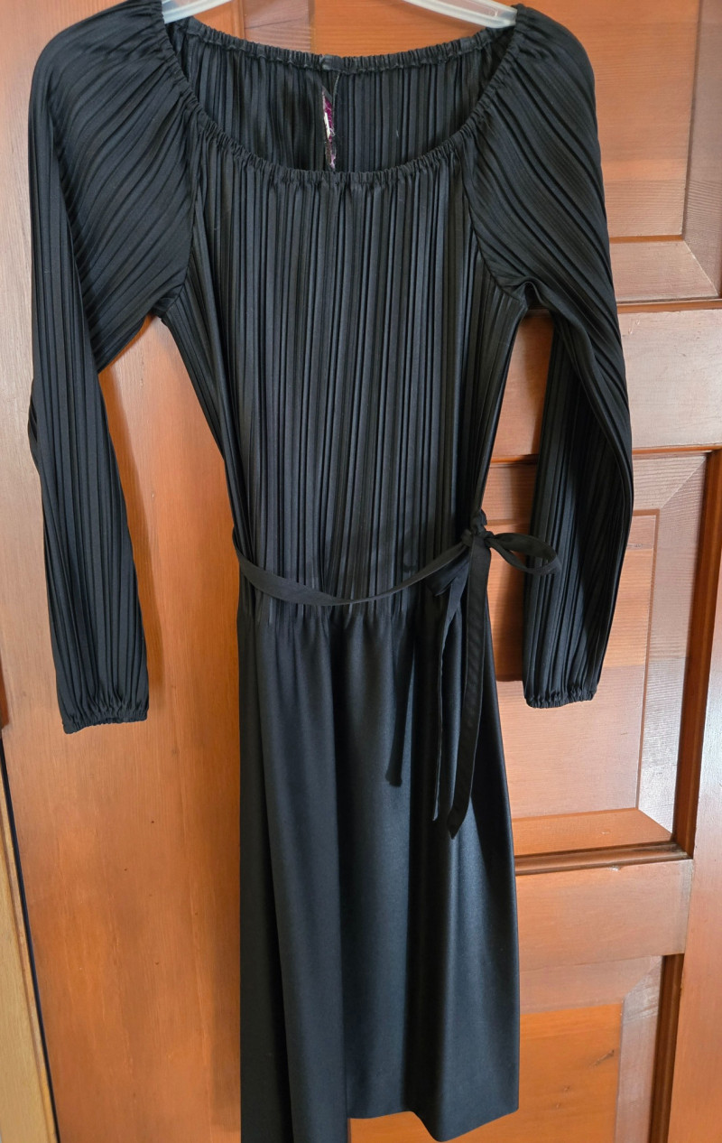 Elegant vintage black cocktail dress by Ruffinwear, featuring a timeless pleated bodice and long sleeves. The dress includes a matching fabric belt for a flattering fit and a classic silhouette perfect for evening wear or special occasions.Vintage Black “Ruffinwear” Cocktail Dress – Size 8