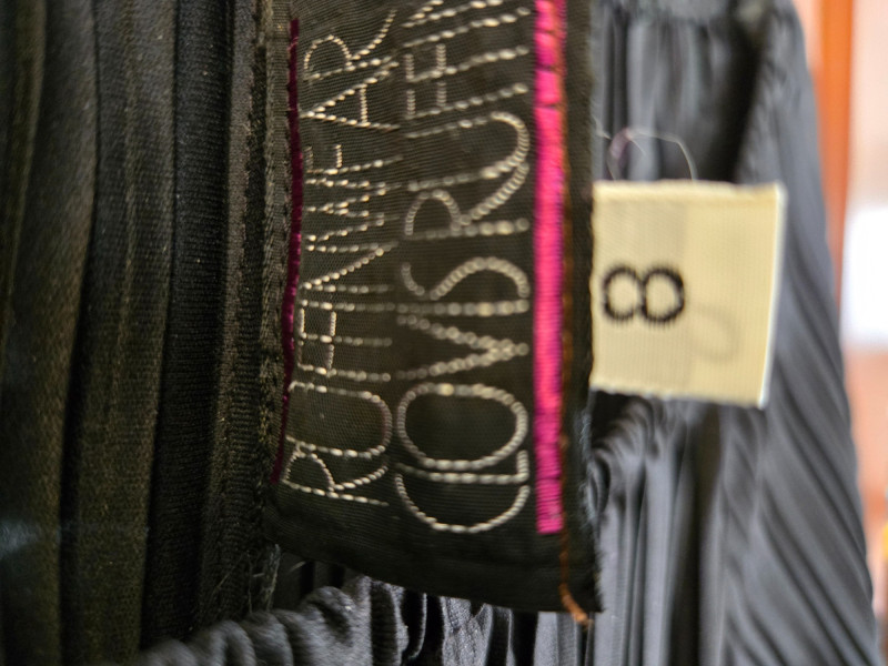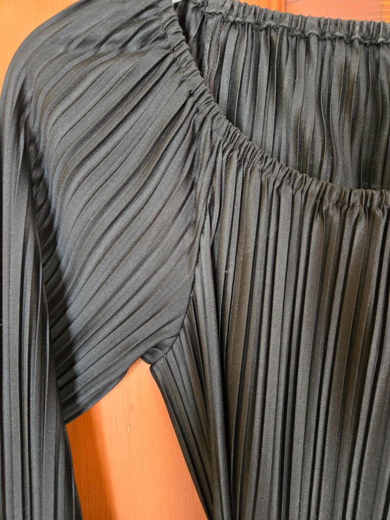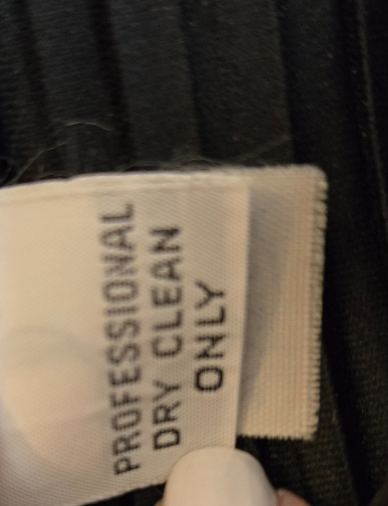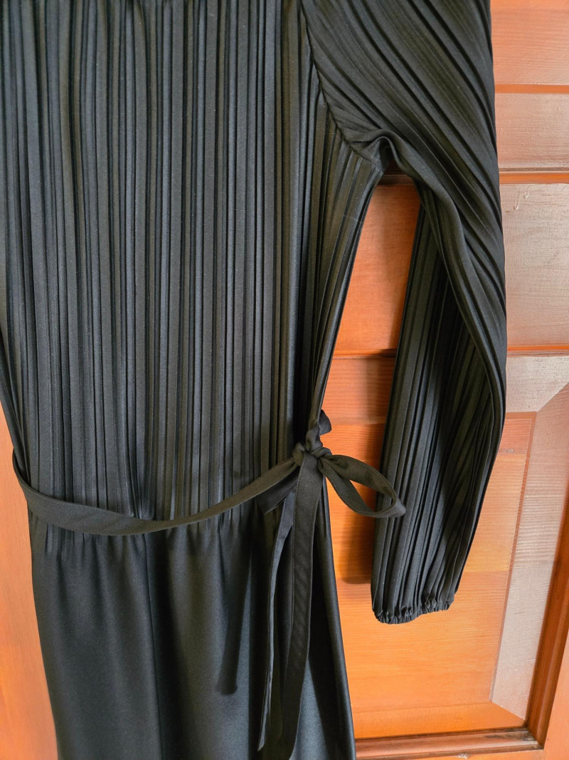 Elegant vintage black cocktail dress by Ruffinwear, featuring a timeless pleated bodice and long sleeves. The dress includes a matching fabric belt for a flattering fit and a classic silhouette perfect for evening wear or special occasions.Vintage Black “Ruffinwear” Cocktail Dress – Size 8