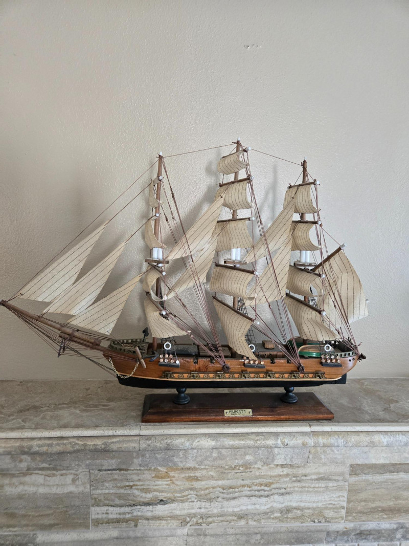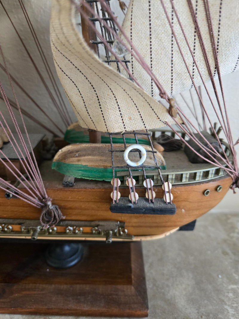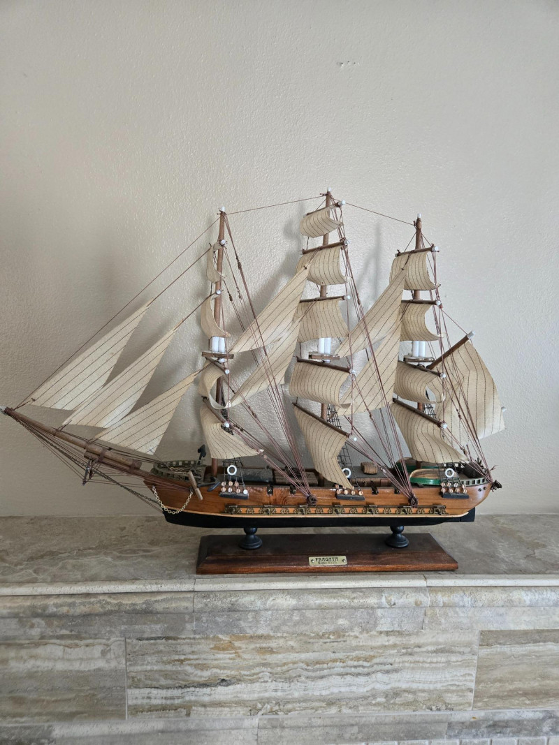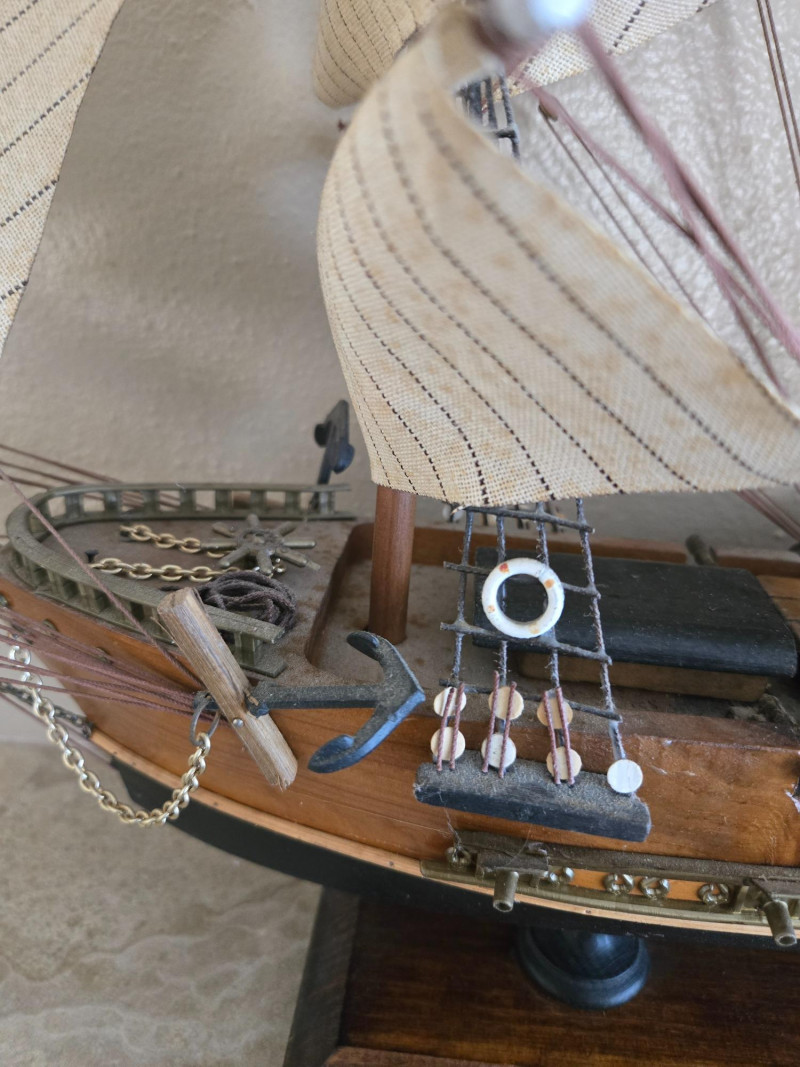 Beautifully crafted model of the famous Clipper Ship “Cutty Sark”, known for its speed and elegance during the late 19th century. This detailed replica features multiple masts with fabric sails, intricate rigging, and a polished wooden hull mounted on a sturdy display base with a nameplate.The Clipper Ship “Cutty Sark” – Detailed Model on Wooden Base
