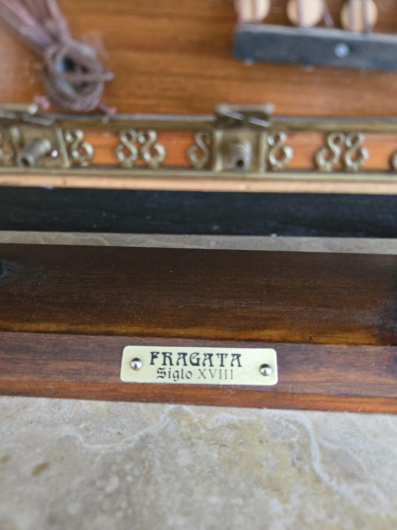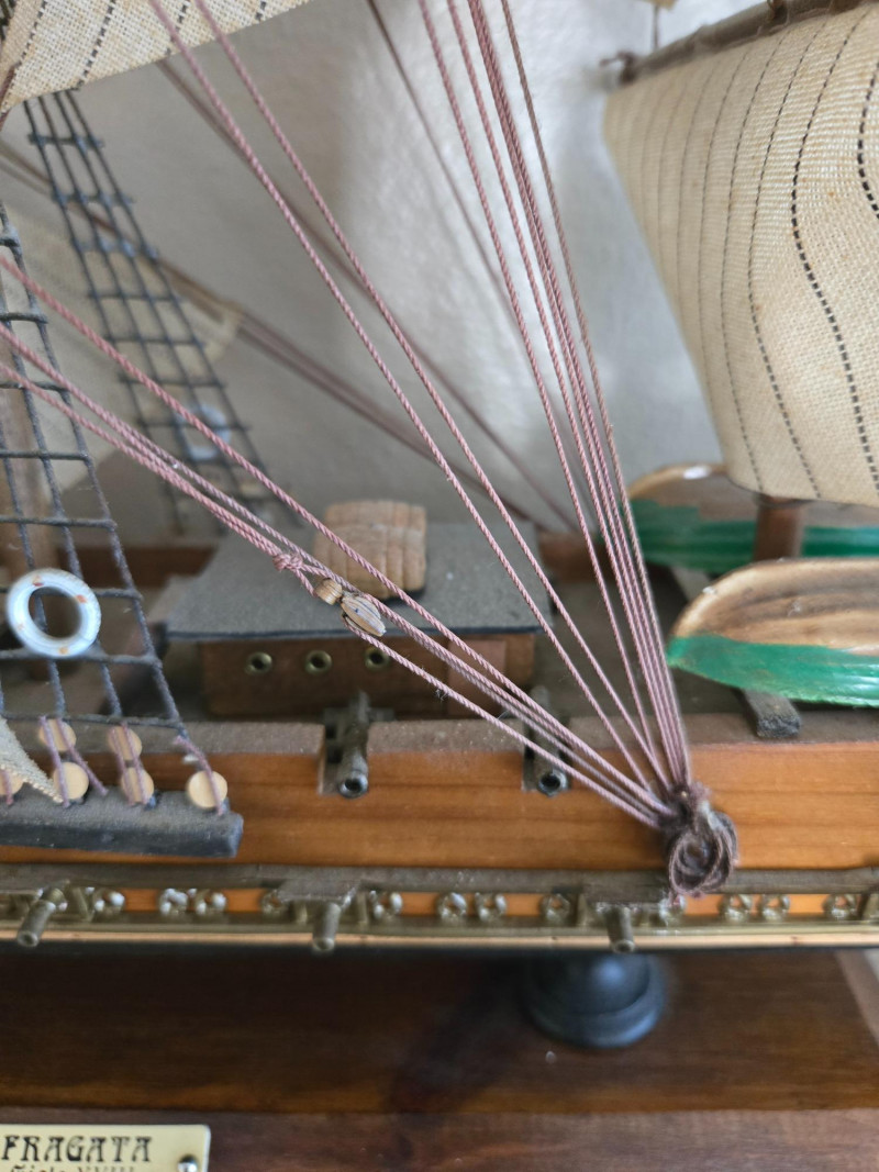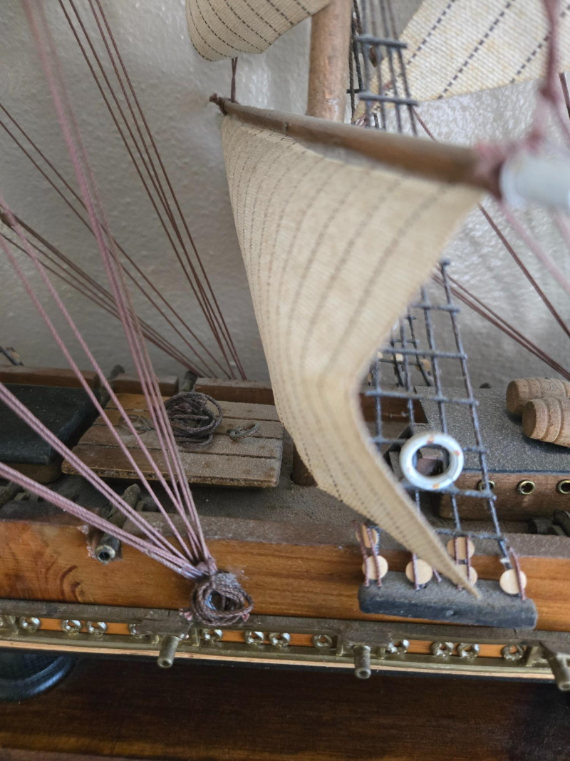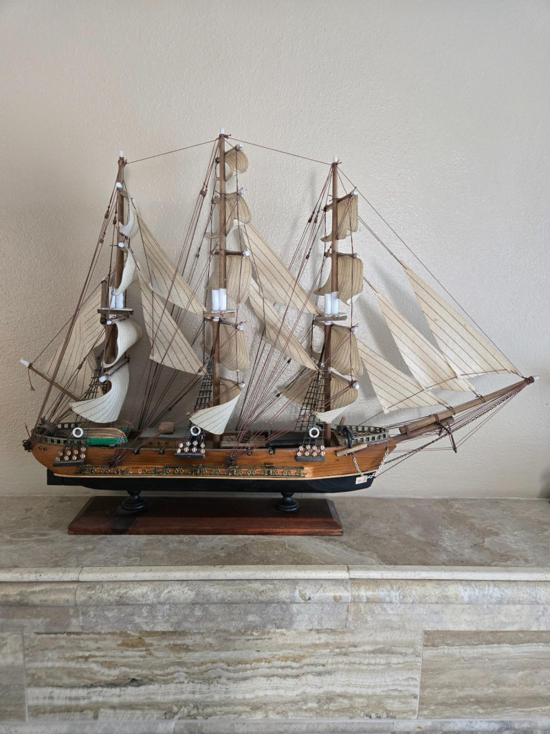 Beautifully crafted model of the famous Clipper Ship “Cutty Sark”, known for its speed and elegance during the late 19th century. This detailed replica features multiple masts with fabric sails, intricate rigging, and a polished wooden hull mounted on a sturdy display base with a nameplate.The Clipper Ship “Cutty Sark” – Detailed Model on Wooden Base