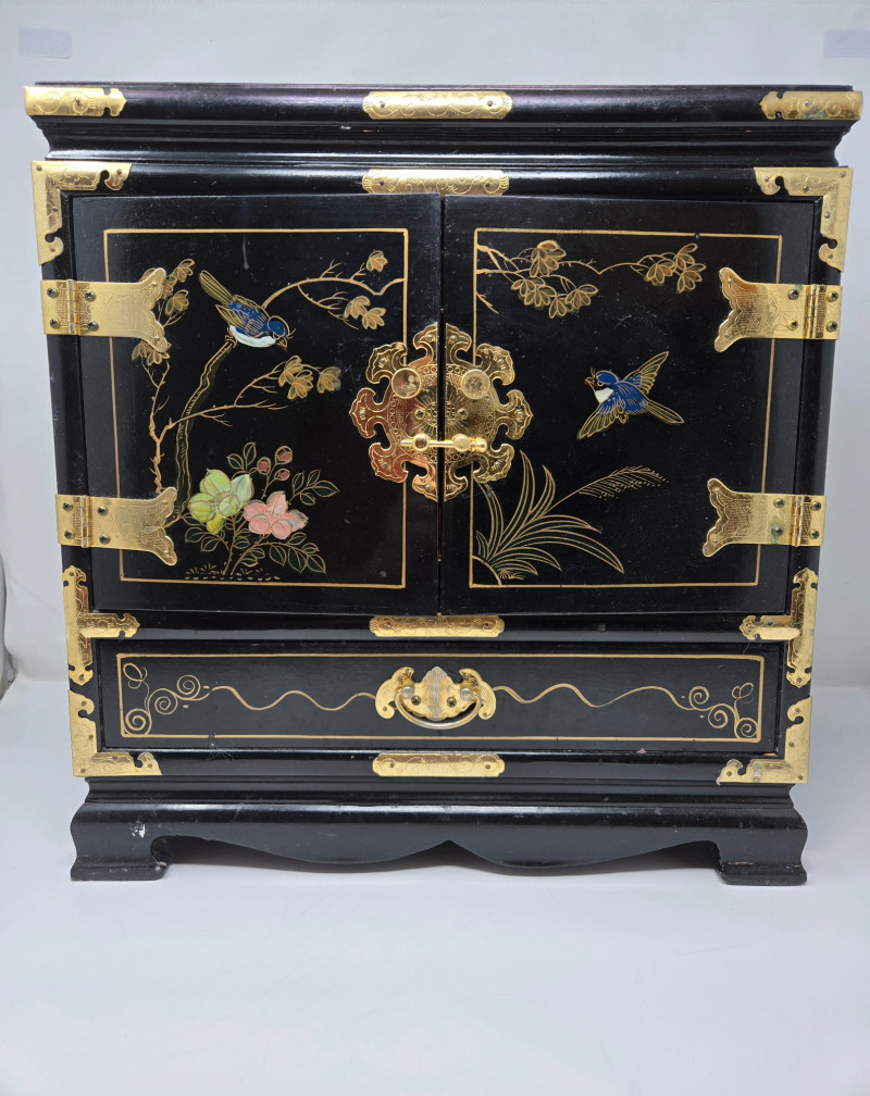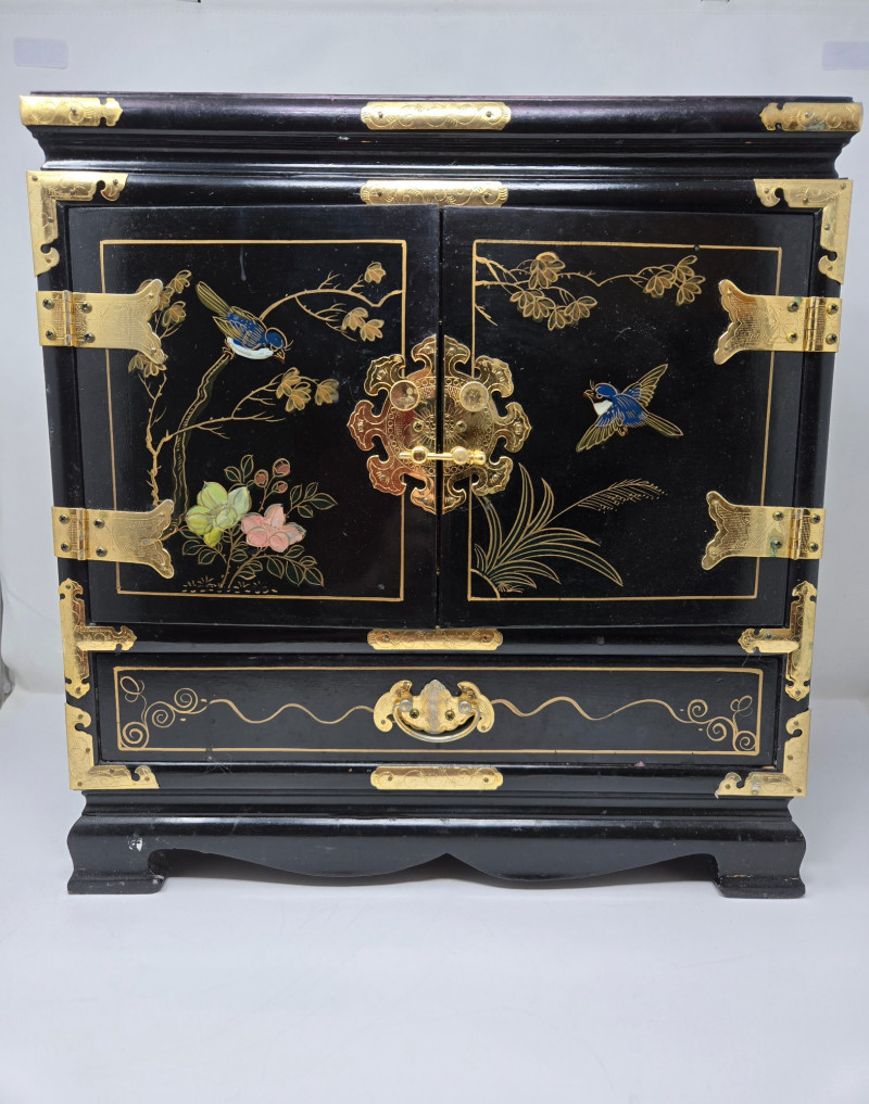 Elegant vintage Chinese jewelry box with a glossy black lacquer finish, adorned with intricate hand-painted floral and bird motifs in gold and vibrant colors. The box features ornate brass hardware, including decorative hinges and a central clasp, adding to its traditional Asian design aesthetic. Highlights:Black Lacquered Chinese Jewelry Box Loaded with Costume Jewelry