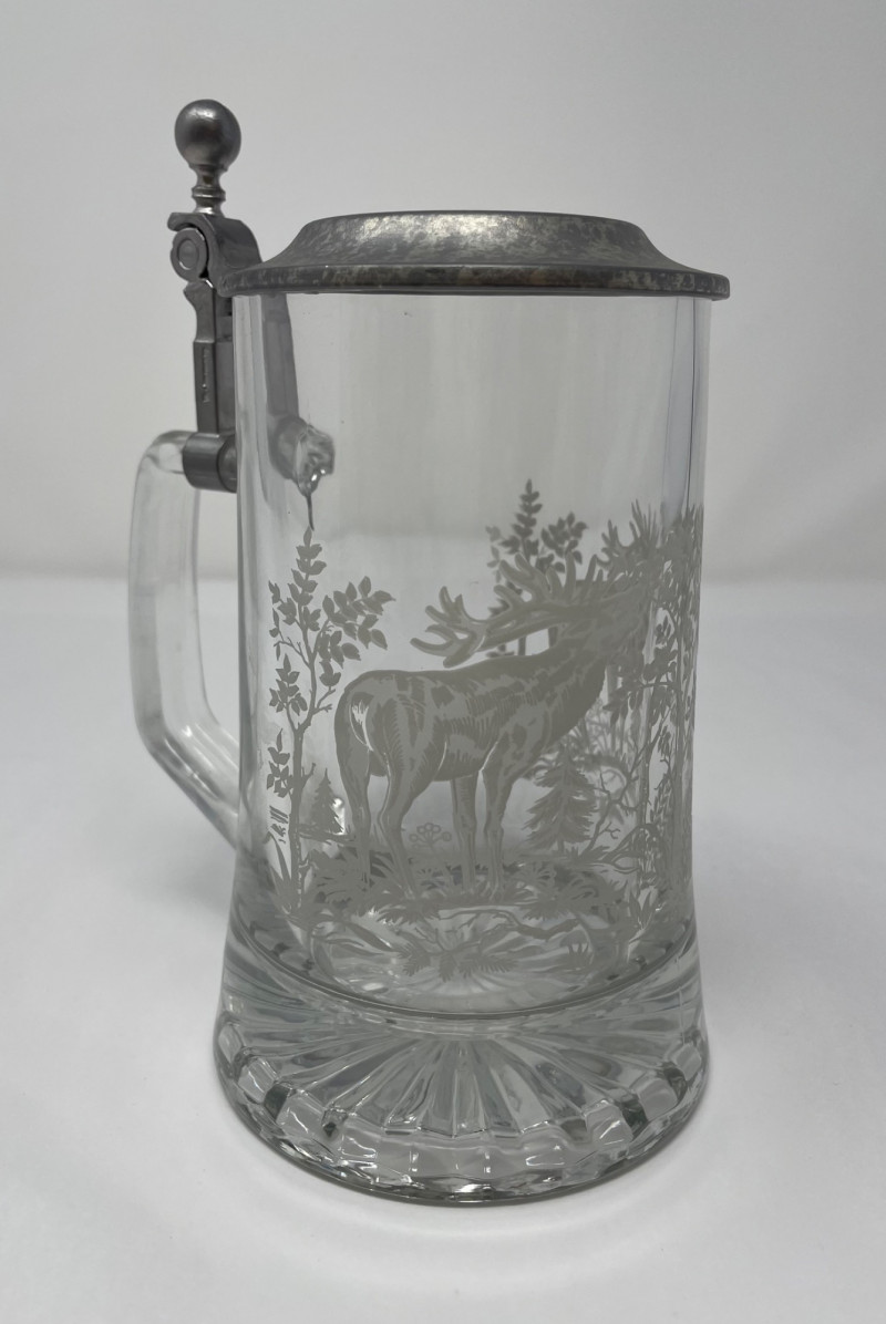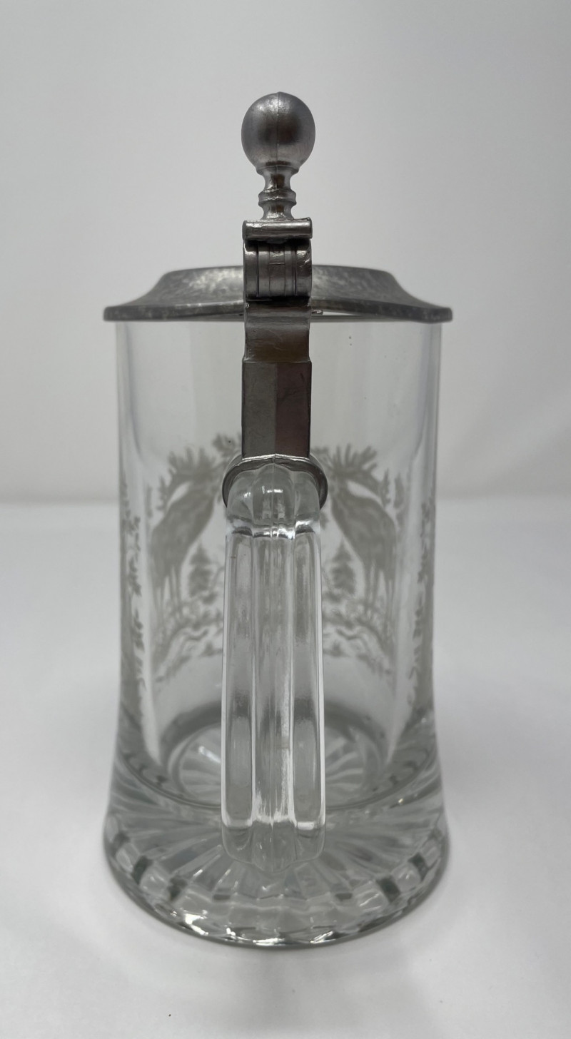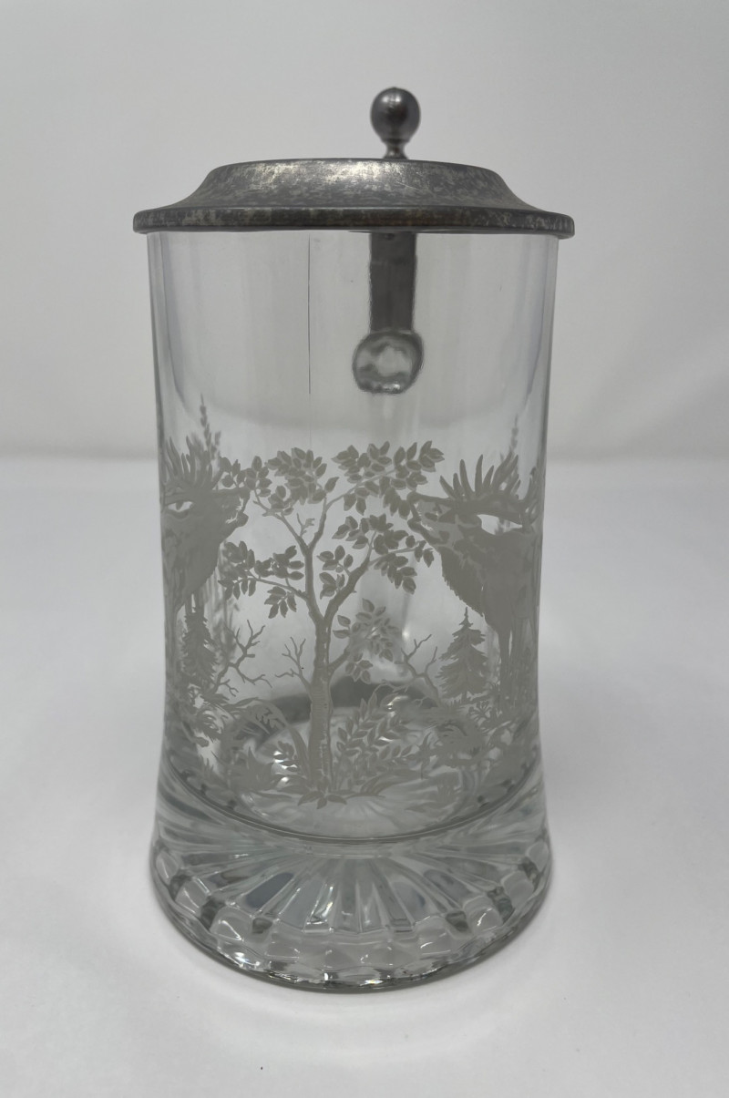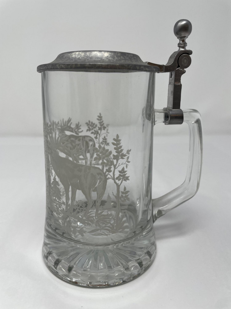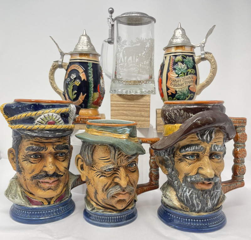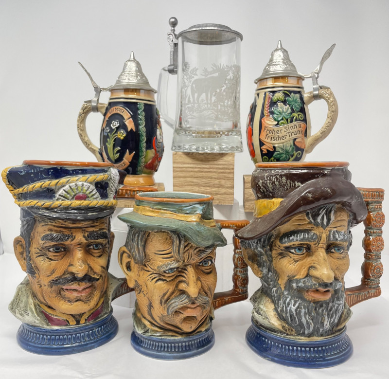 8 1/2” x 7 3/4” to 7 1/4”x 7” Two Ceramic Steins: Center Glass Stein:Back Row (Traditional German Steins)