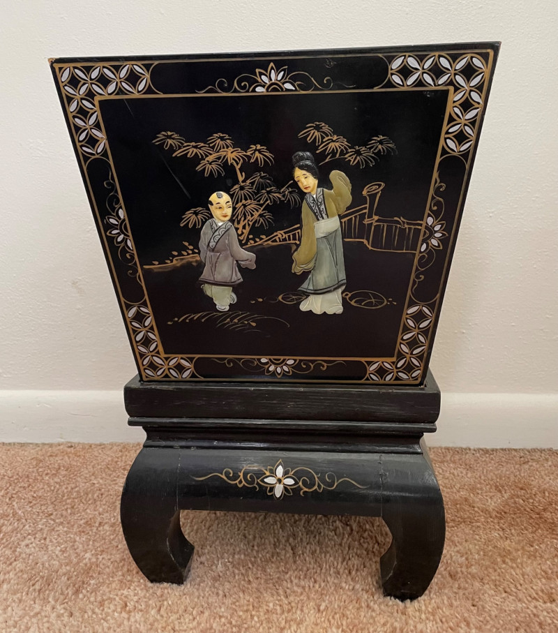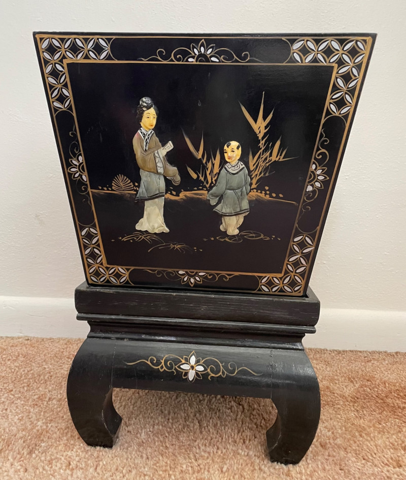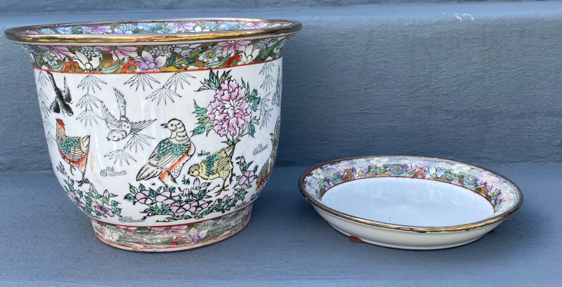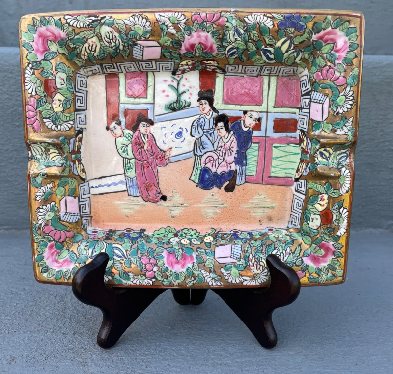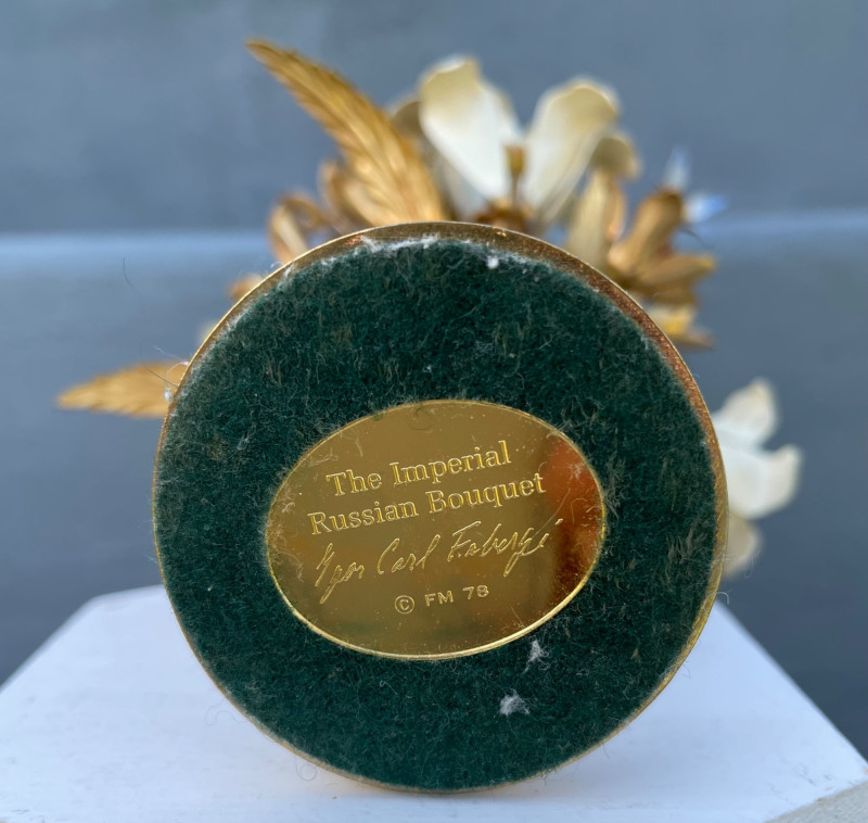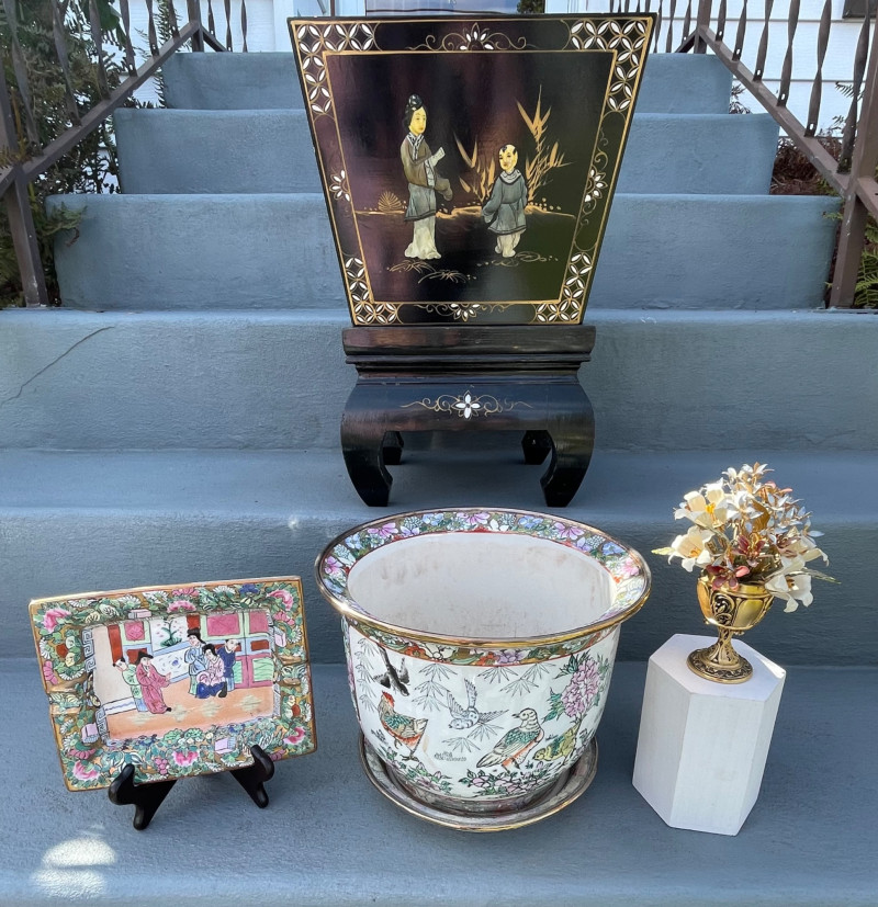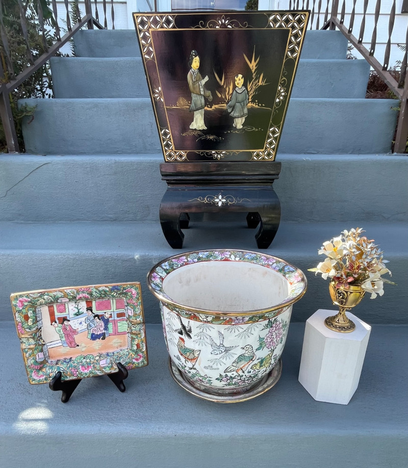Eclectic mix of Asian art pieces and a Russian-style floral sculpture, arranged on steps for display: Asian Lacquered Panel on Stand (Top) Rectangular Porcelain Plate (Bottom Left) Large Porcelain Planter (Center) Russian-Style Floral Sculpture (Bottom Right) Chinese Black Lacquer Planter 12”x17” Chinese Rose Medallion Ceramic Ashtray 61/2x73/4”. 1950-1960’s Porcelain Chinese Planter w/saucer. 10”x8” Imperial Russian Faberge Bouquet 24k Gold and hand-enameled sculpture ON THESE PIECES, PLEASE BRING STRONG HELP, THERE WILL BE NO ONE HERE TO HELP YOU.Key Elements
